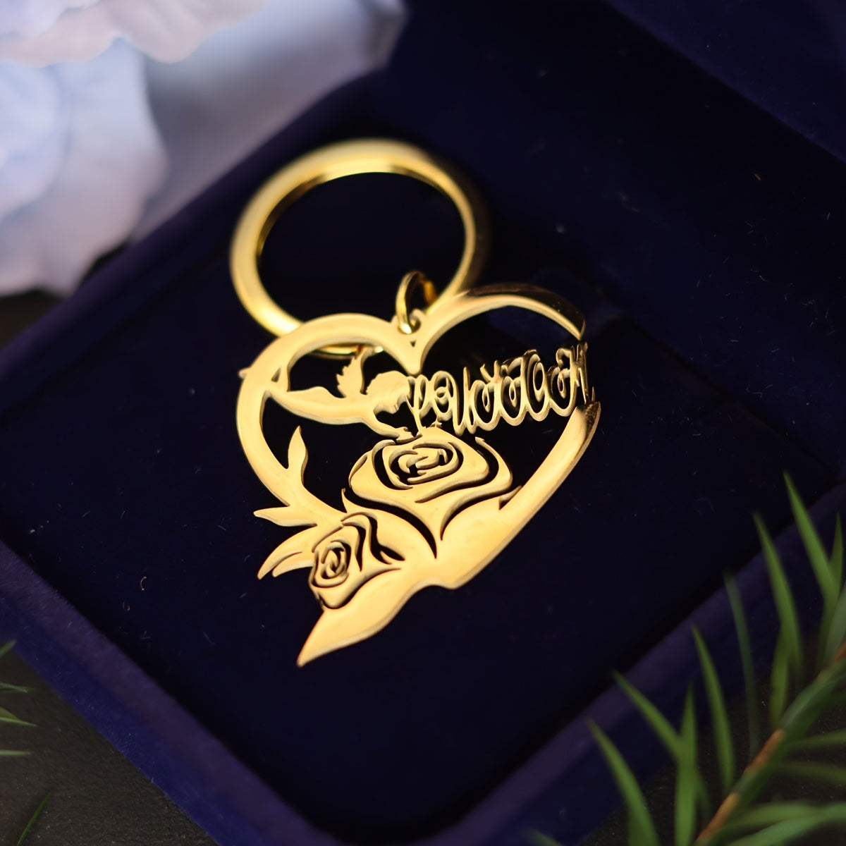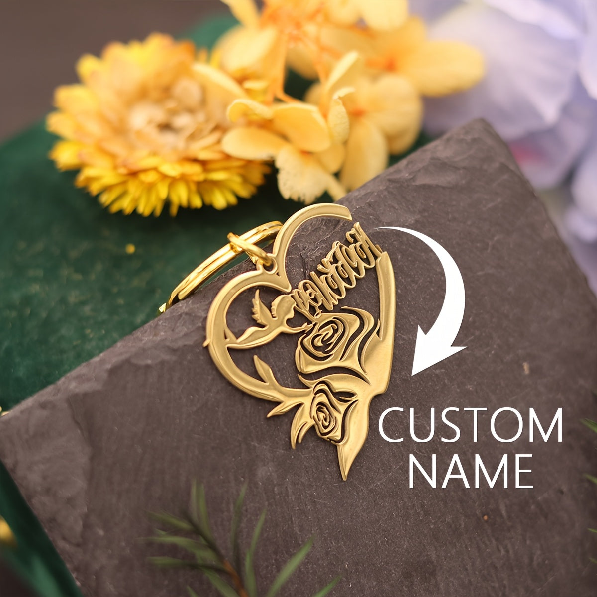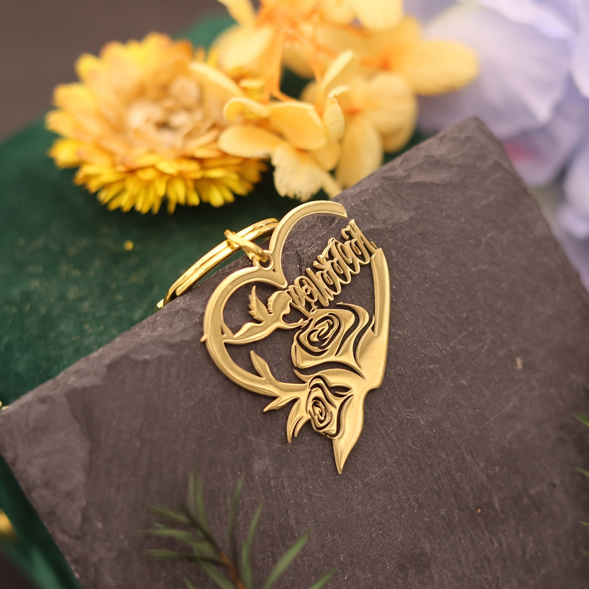 Give a meaningful gift with this custom engraved golden stainless steel heart keychain featuring a rose and angel design. Perfect for couples, it's a fashionable piece of jewelry suitable for Christmas or any occasion.