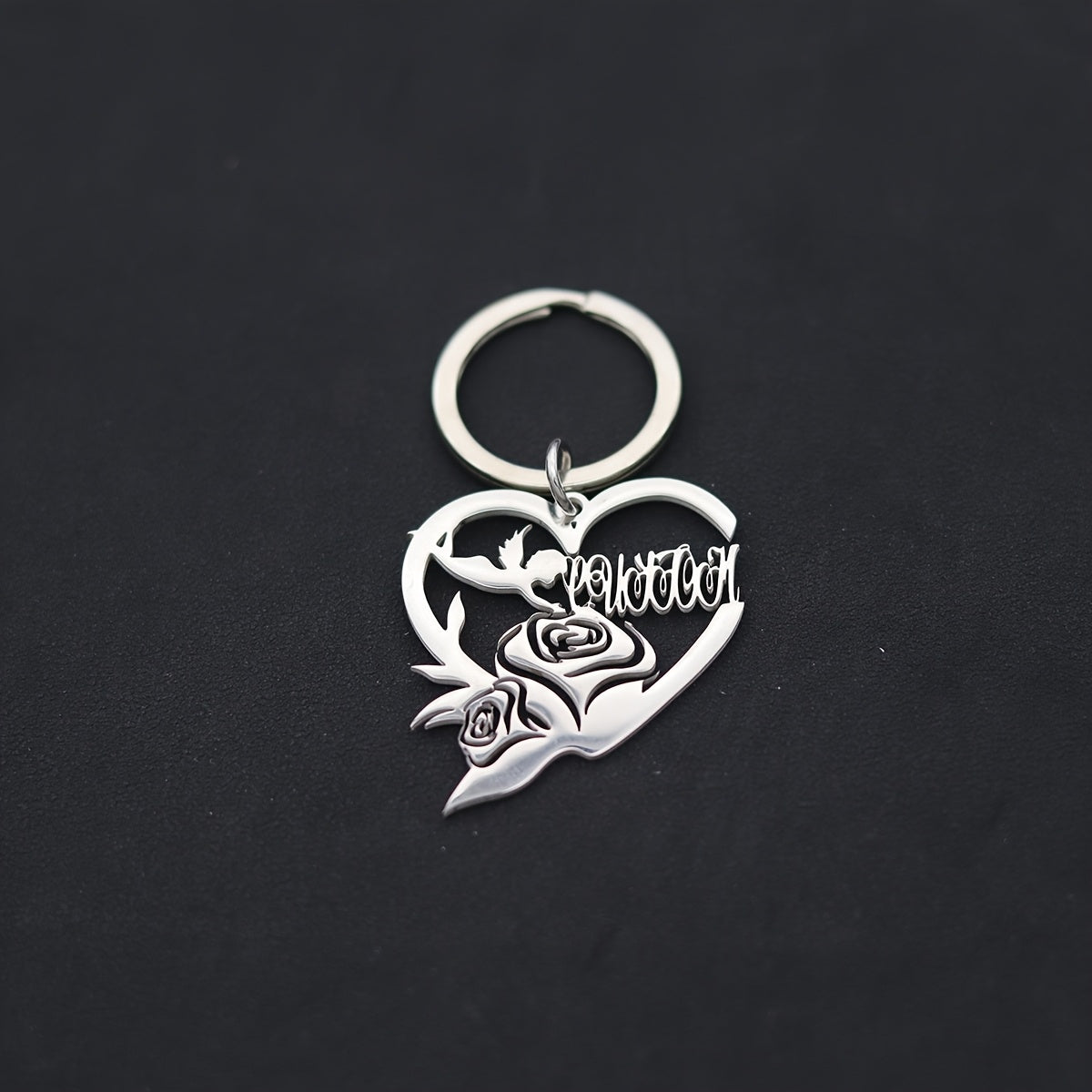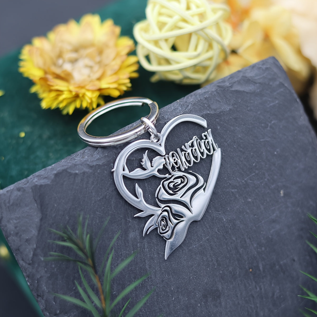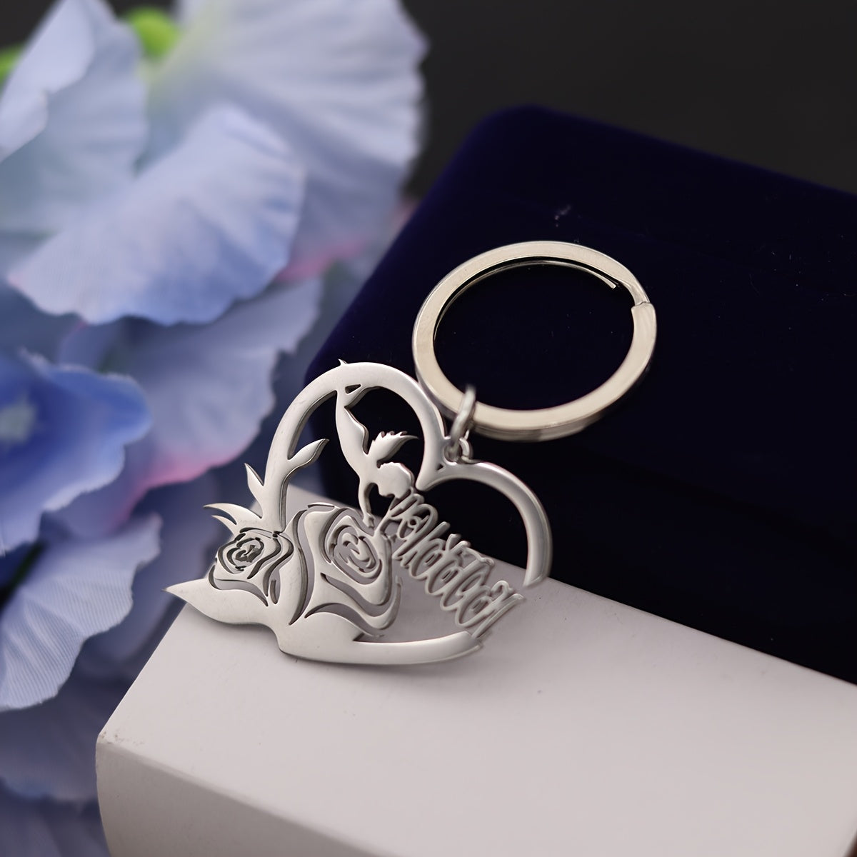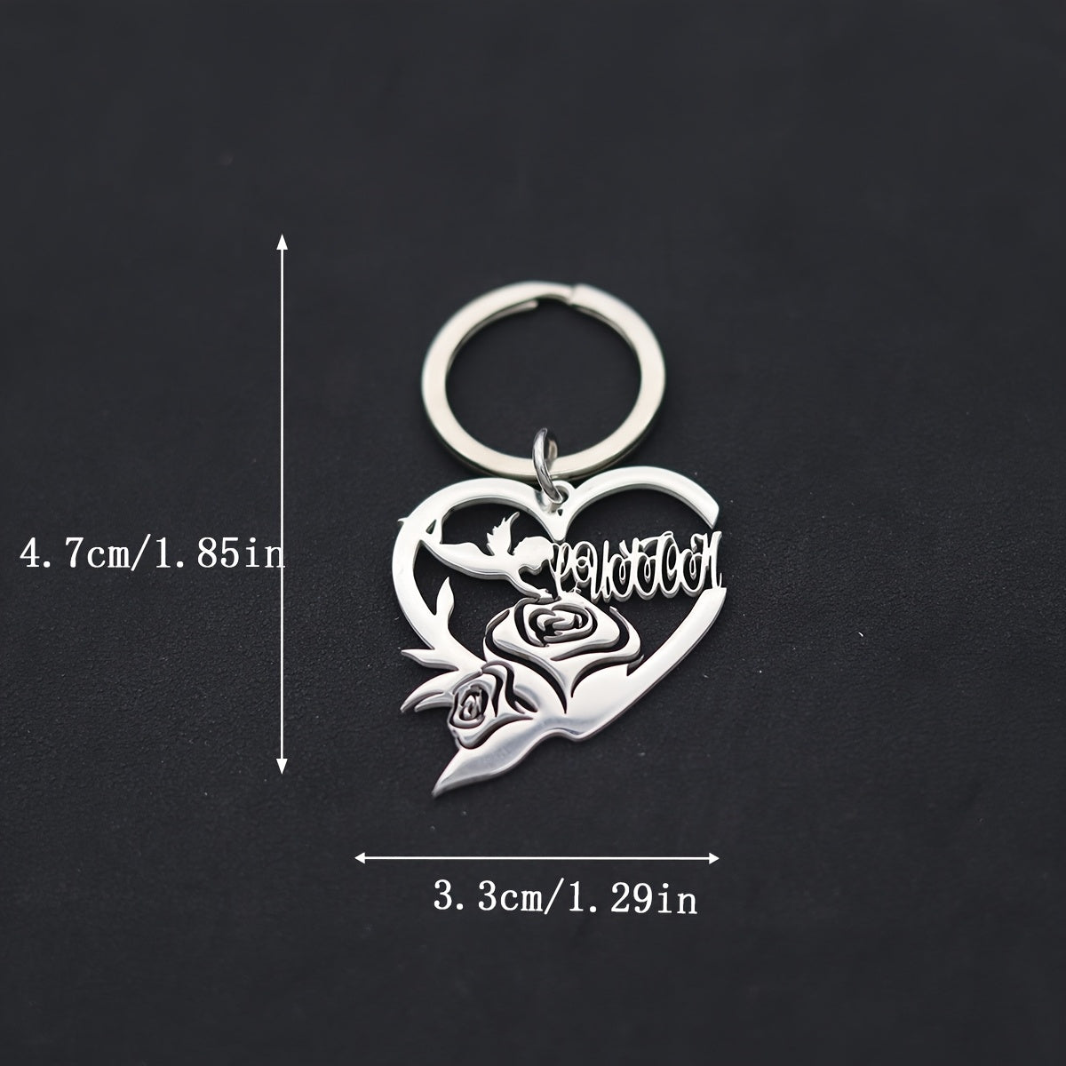 Give a meaningful gift with this custom engraved golden stainless steel heart keychain featuring a rose and angel design. Perfect for couples, it's a fashionable piece of jewelry suitable for Christmas or any occasion.