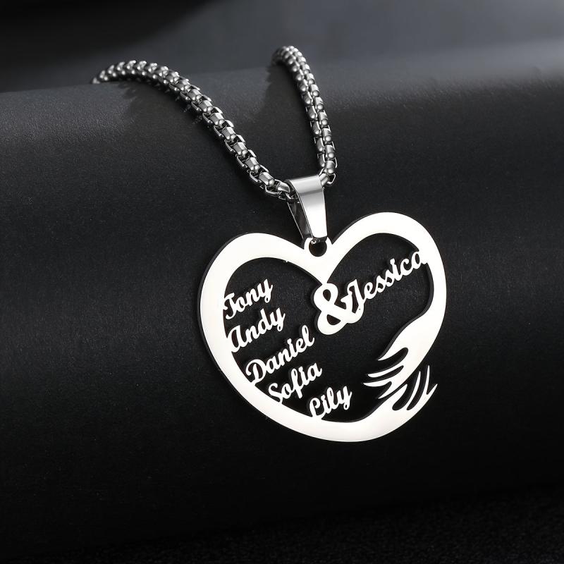 Customize this 7 names heart pendant necklace crafted from durable 304 stainless steel. Features intertwined hands design. Perfect for everyday wear or special occasions.