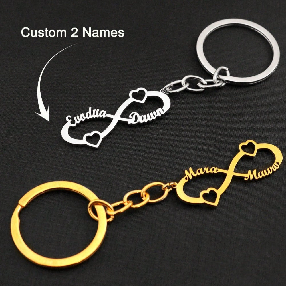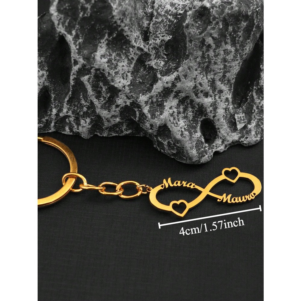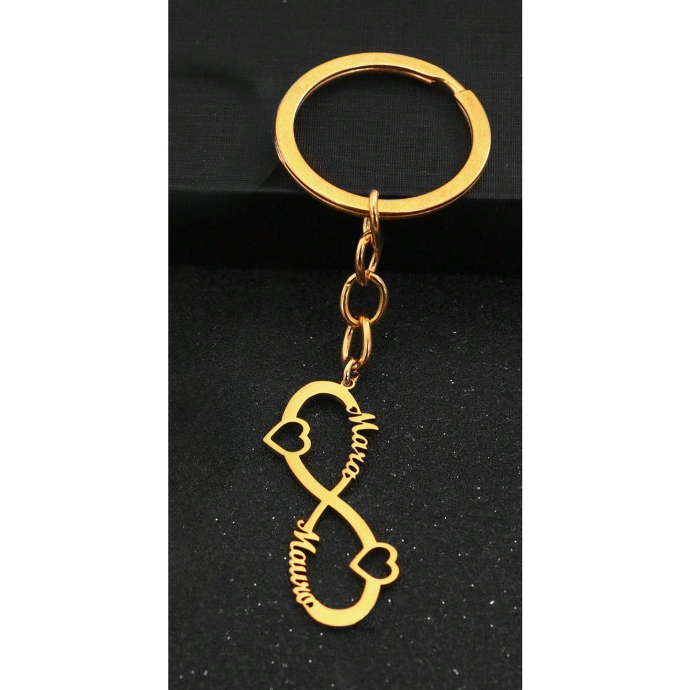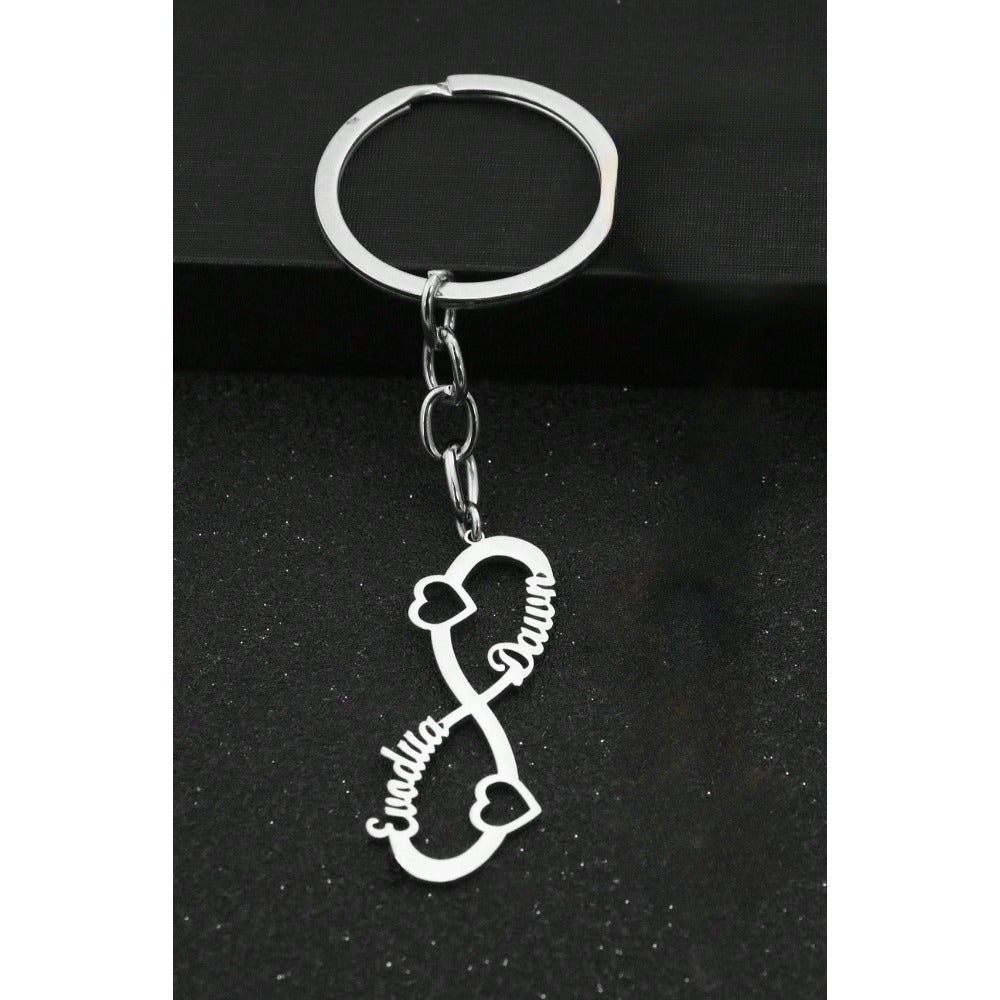 This custom keychain features an infinity symbol with double names on it. Made of stainless steel, it can be used as a keychain or bag charm, perfect for women. The ideal accessory to add a personalized touch to your belongings.