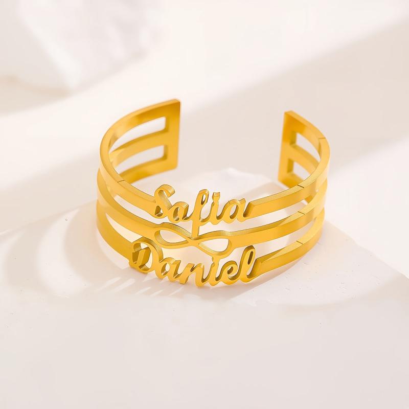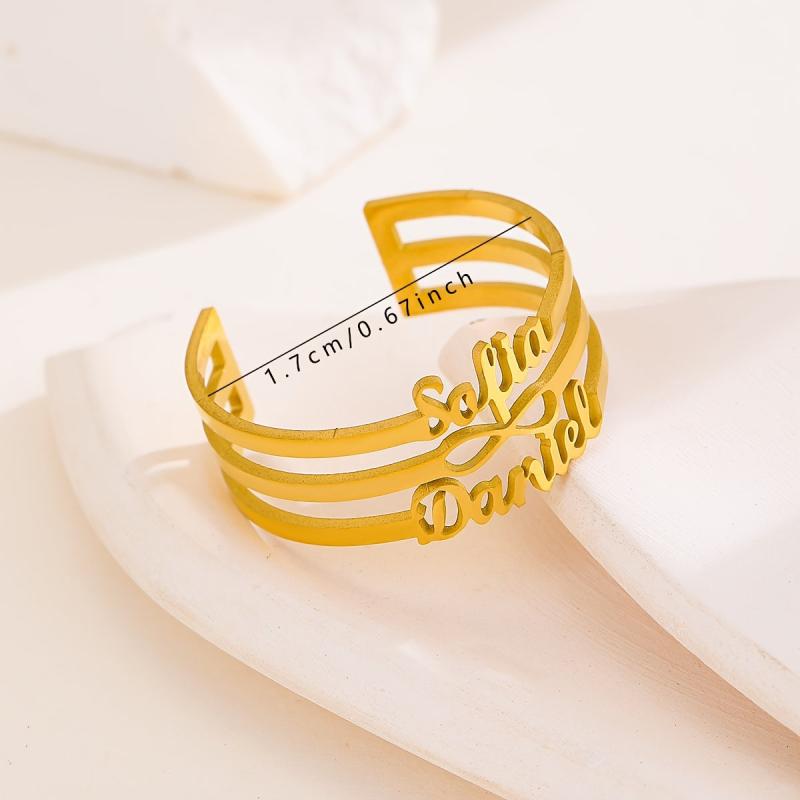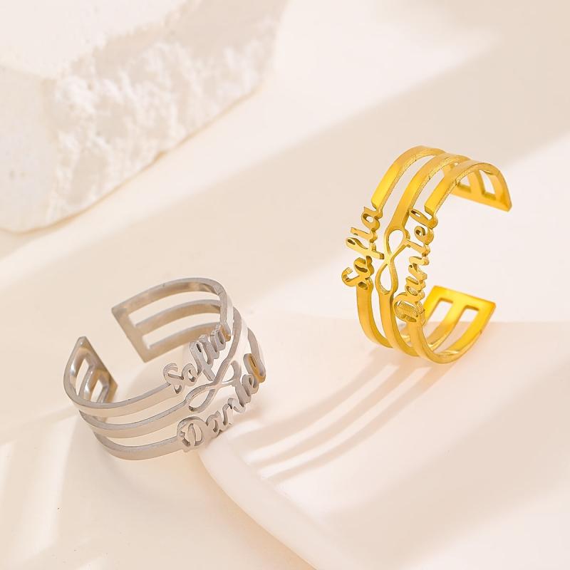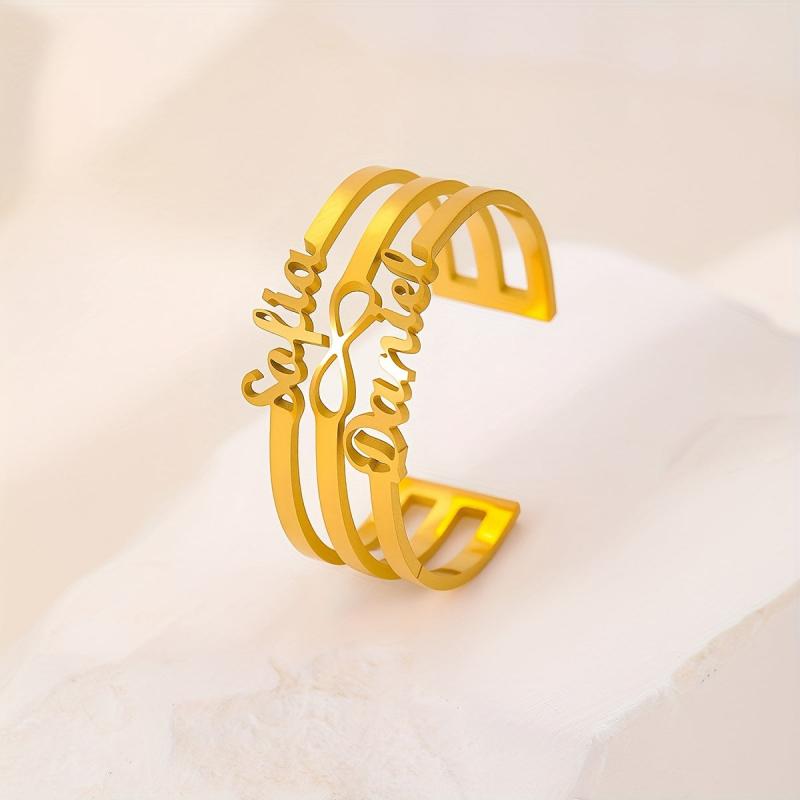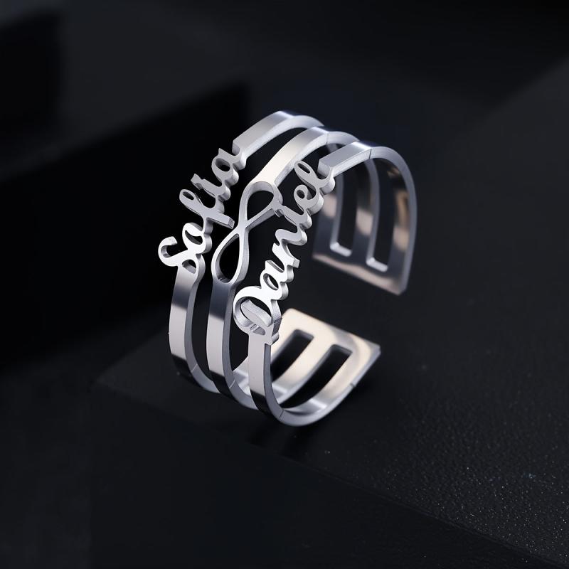 This vintage-inspired adjustable ring features an infinity symbol design with personalized names engraved on the band. Made with high-quality materials, it is a perfect accessory for everyday wear or as a special gift for a loved one.