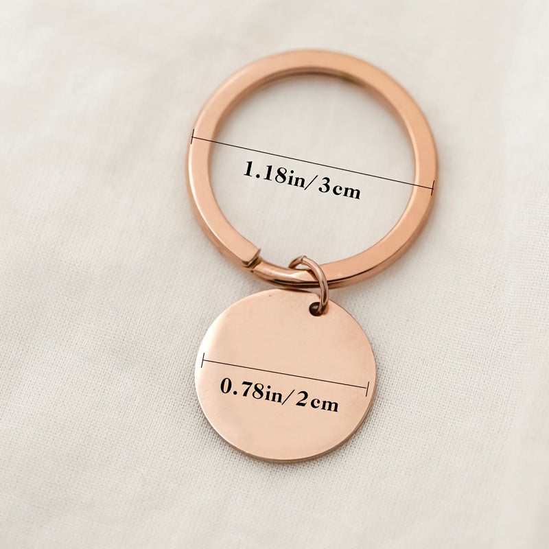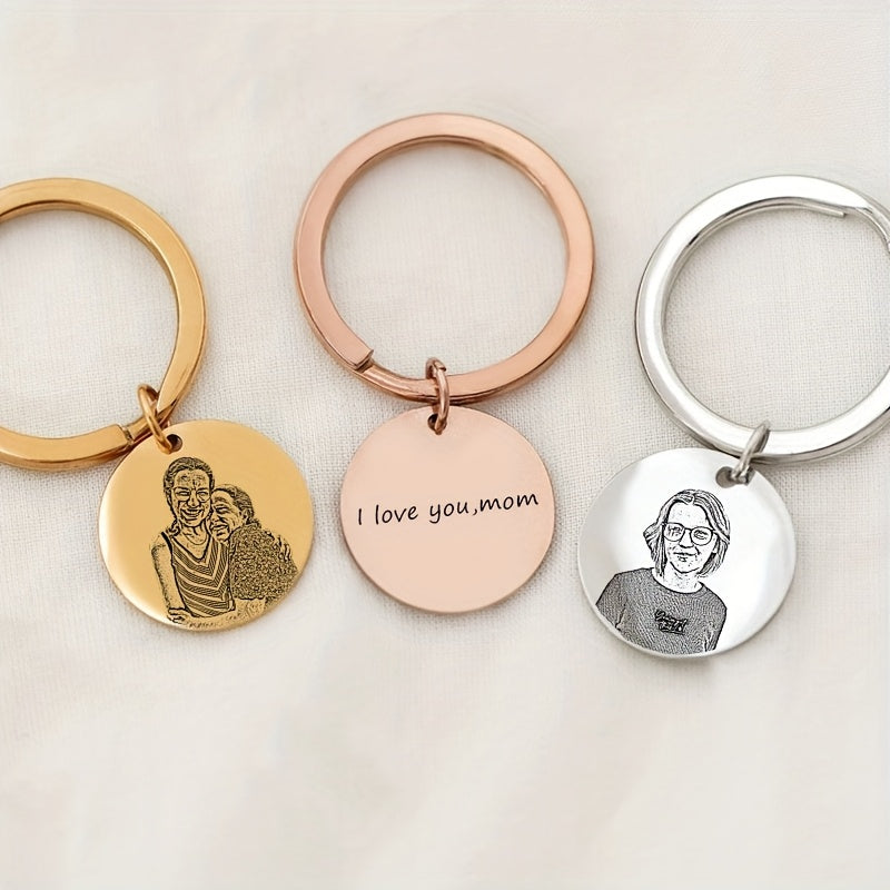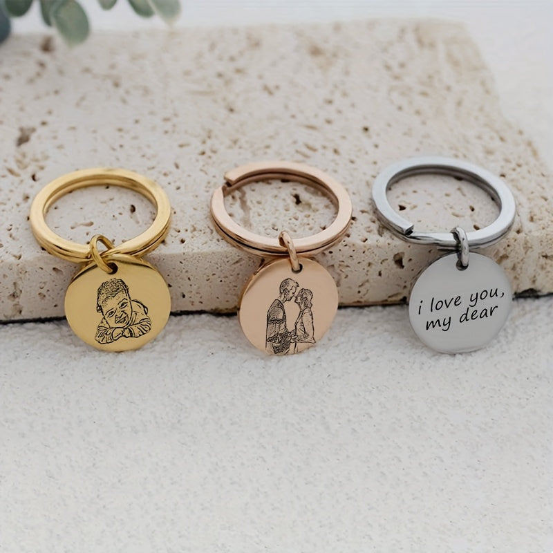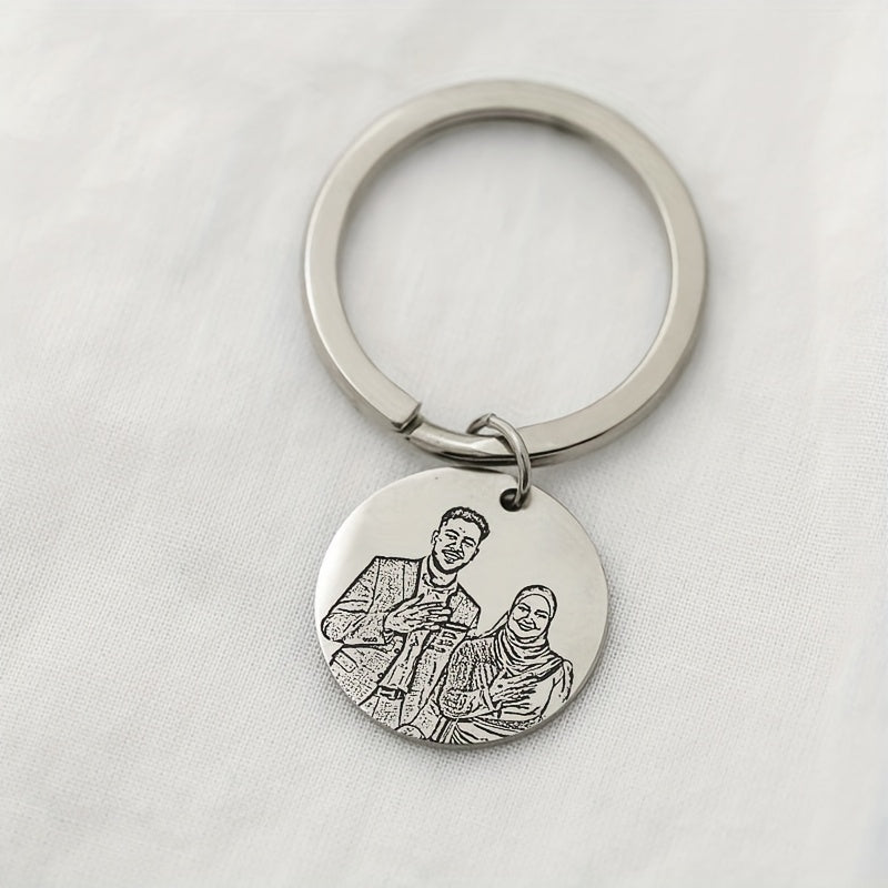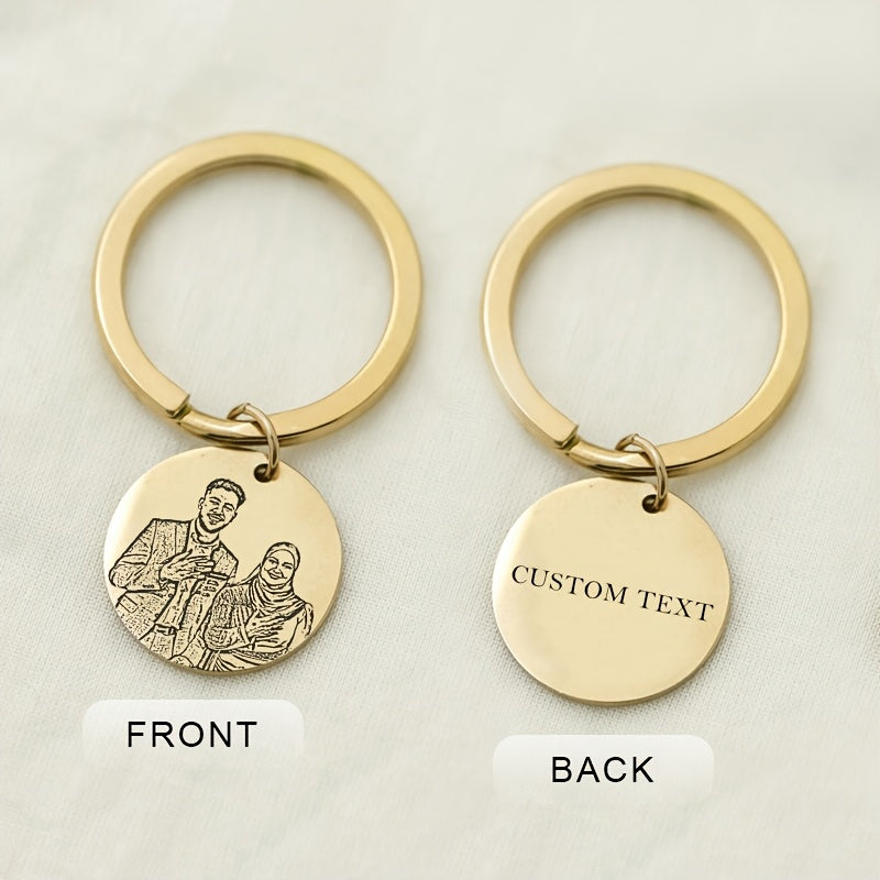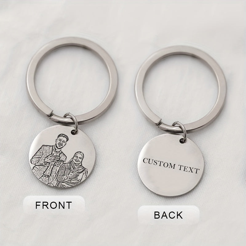 Get a custom engraved stainless steel keychain with your favorite photo and text. This round keychain is a perfect way to carry special memories with you wherever you go.