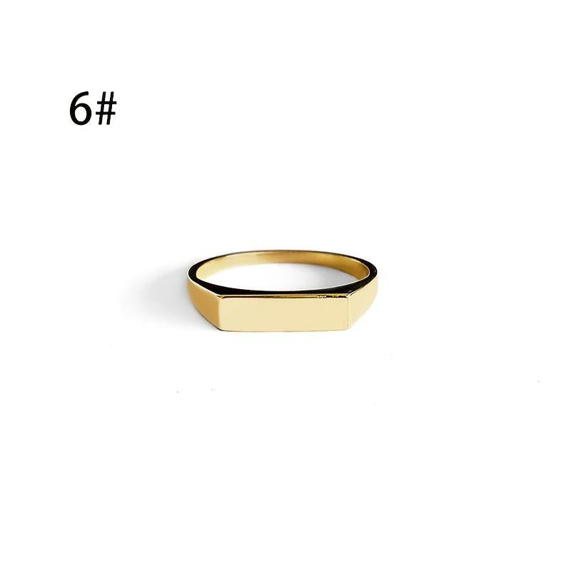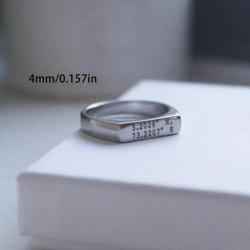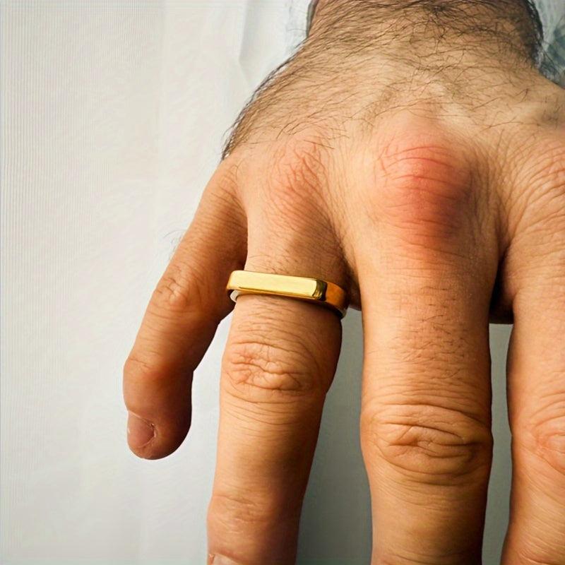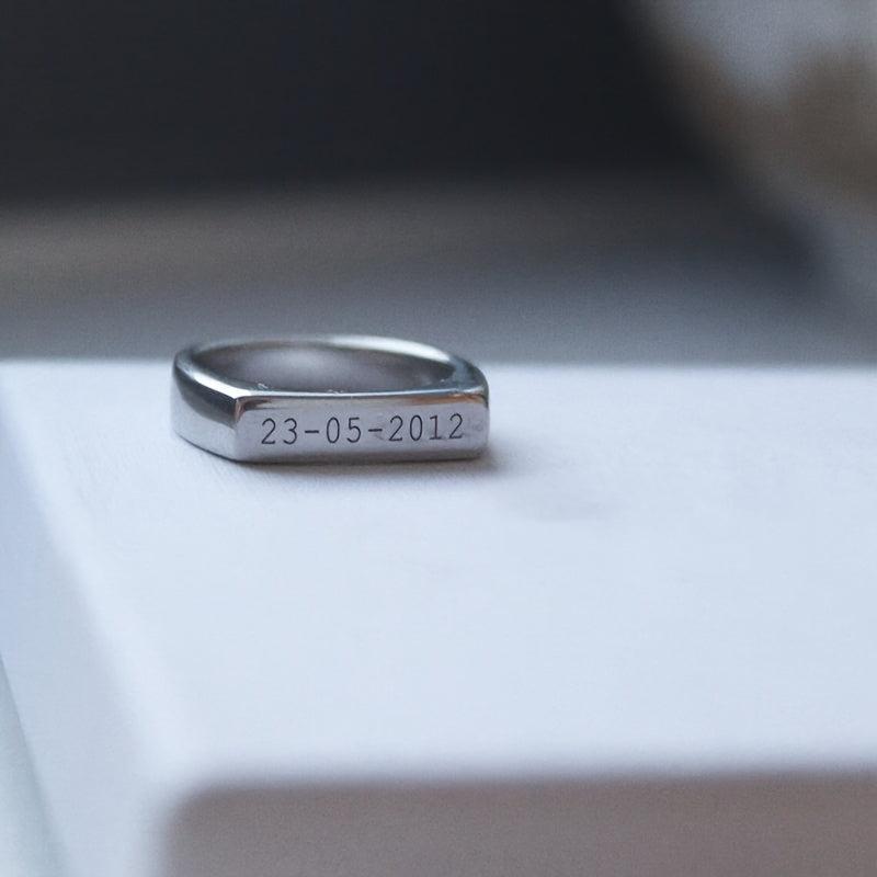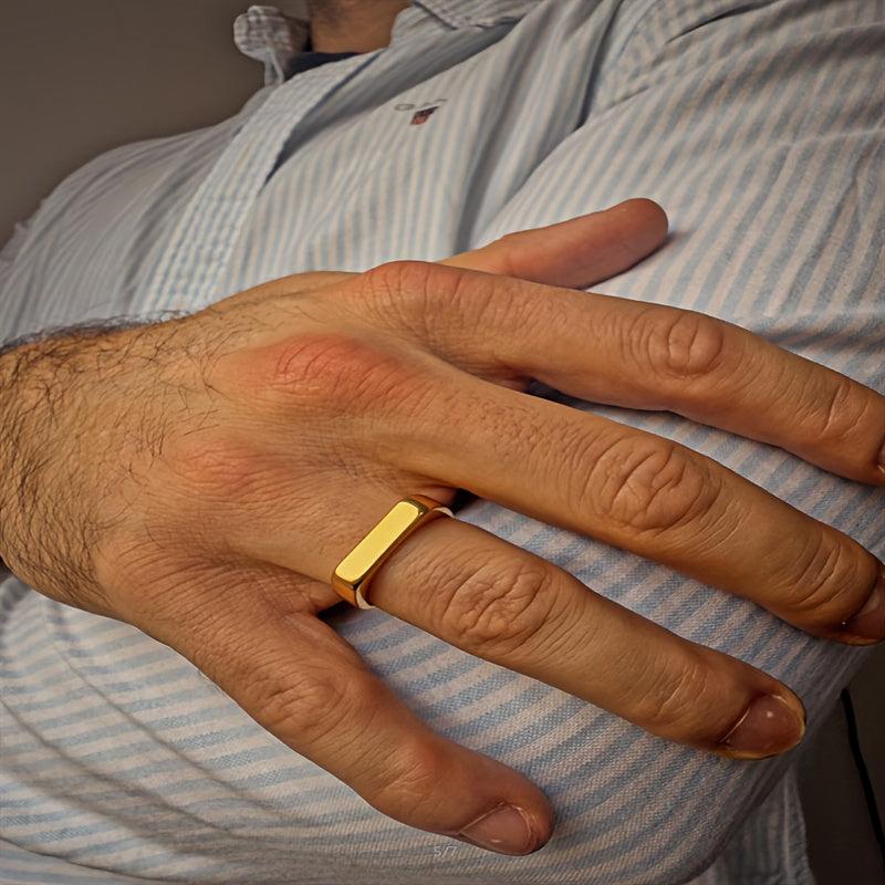 Custom engraved square bar ring with name Bruce in a golden tone. Ideal gift for boyfriend, husband, father. Casual style perfect for any occasion.