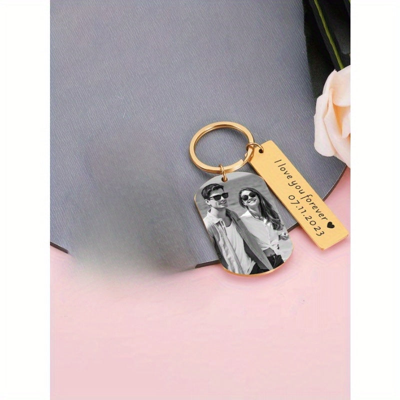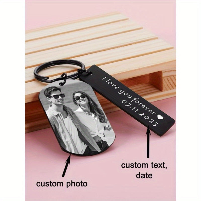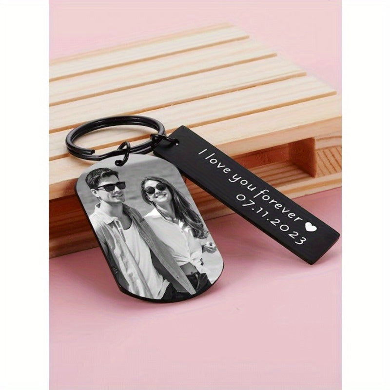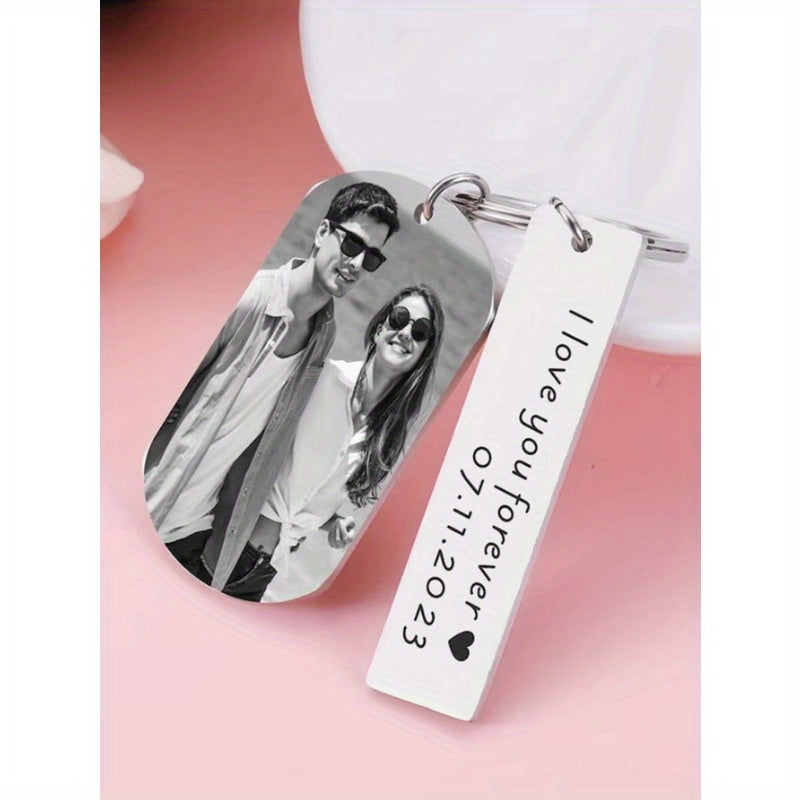 Capture your memories with this stainless steel photo keychain that can be customized with your favorite image and text. This romantic gift is perfect for couples, boyfriend, girlfriend, or as an anniversary or Valentine's Day present.