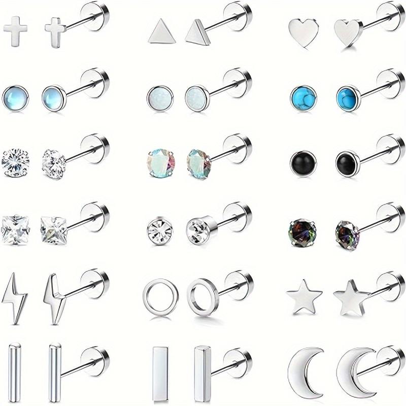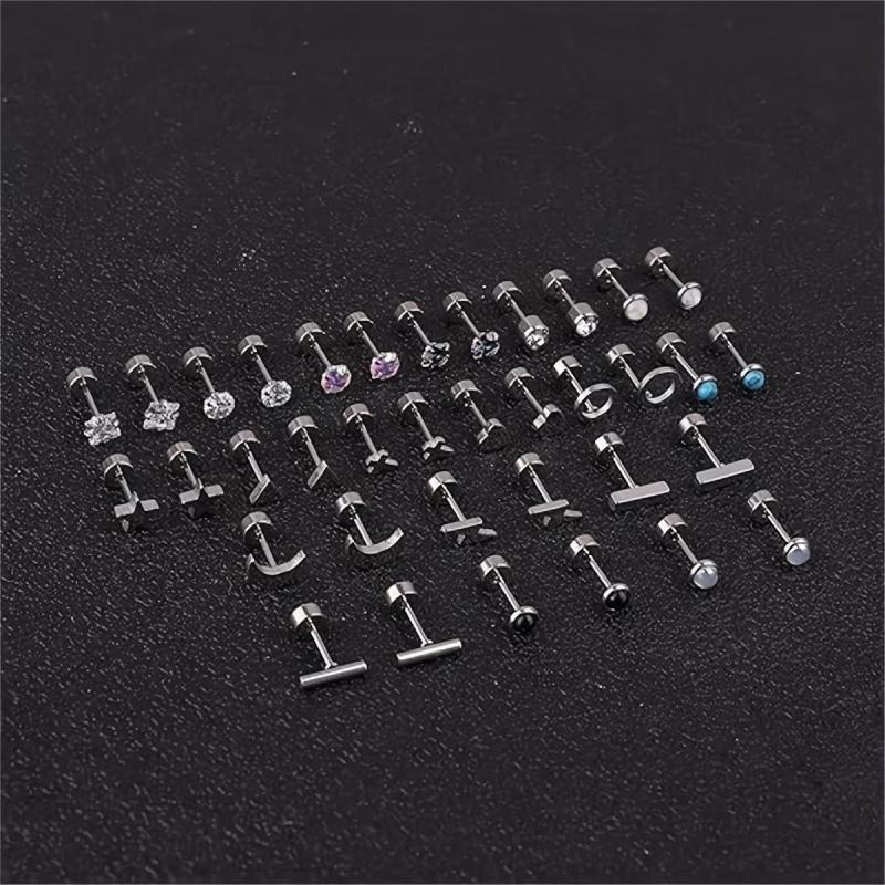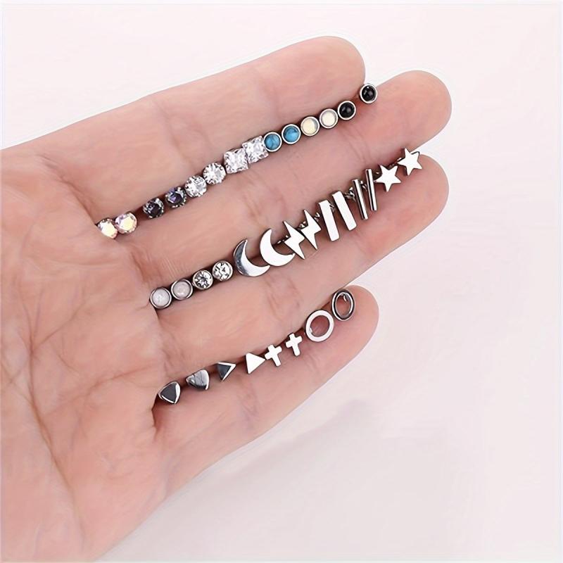 This set includes 36 stylish stud earrings with zirconia inlay, featuring various designs like Cross, Heart, Triangle, Moon, and Star. Made of durable stainless steel, these earrings are perfect for everyday wear or special occasions.