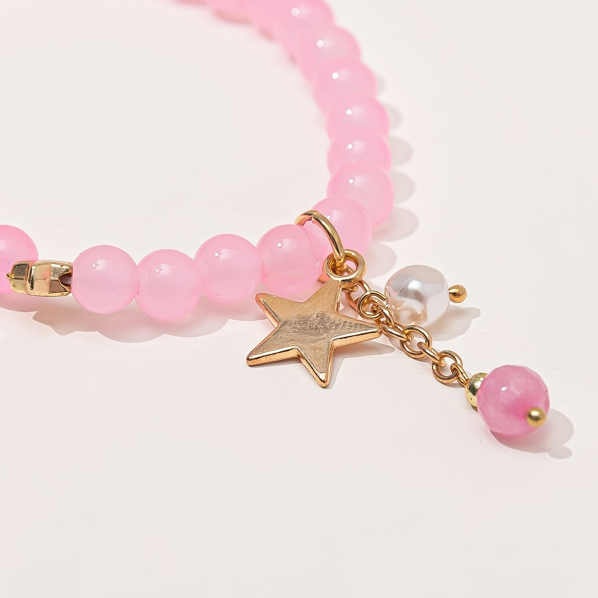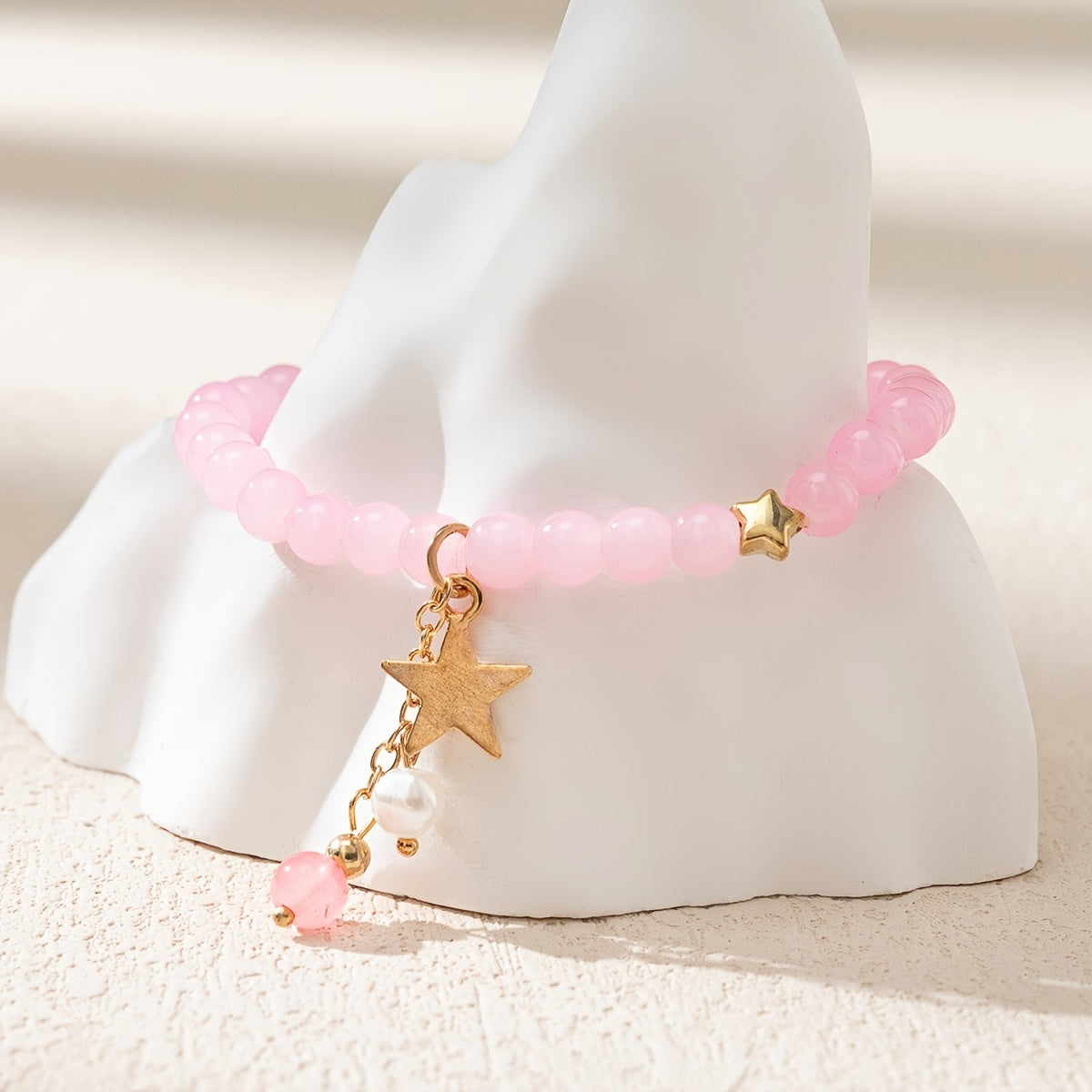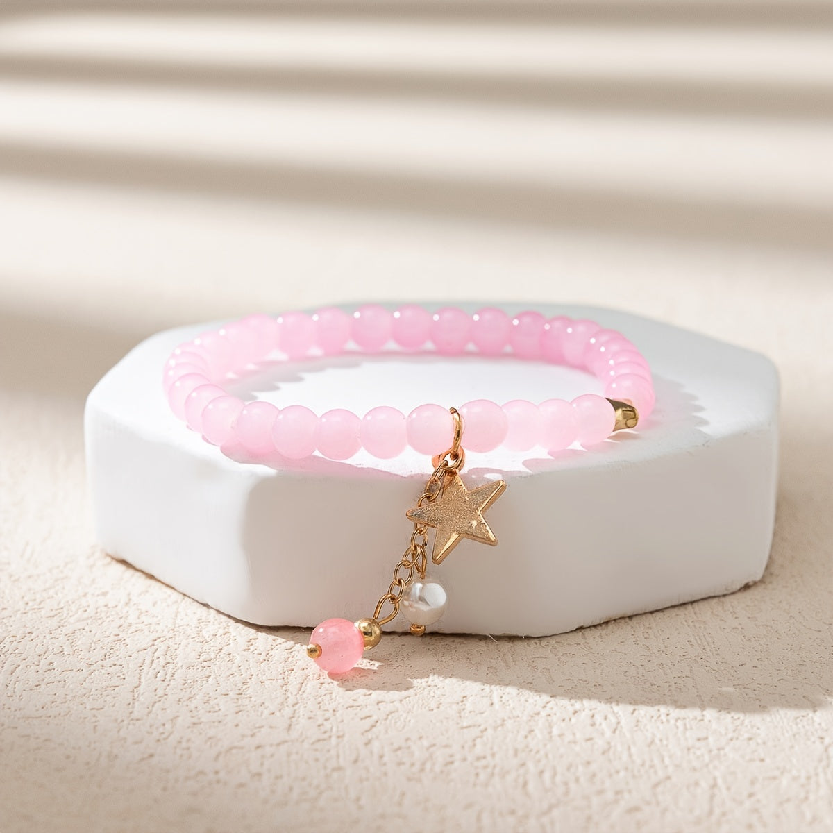 This charming bracelet features smooth pink crystal beads with a star-shaped pendant. It is stretchable for easy wearing and adds a touch of elegance to any outfit.