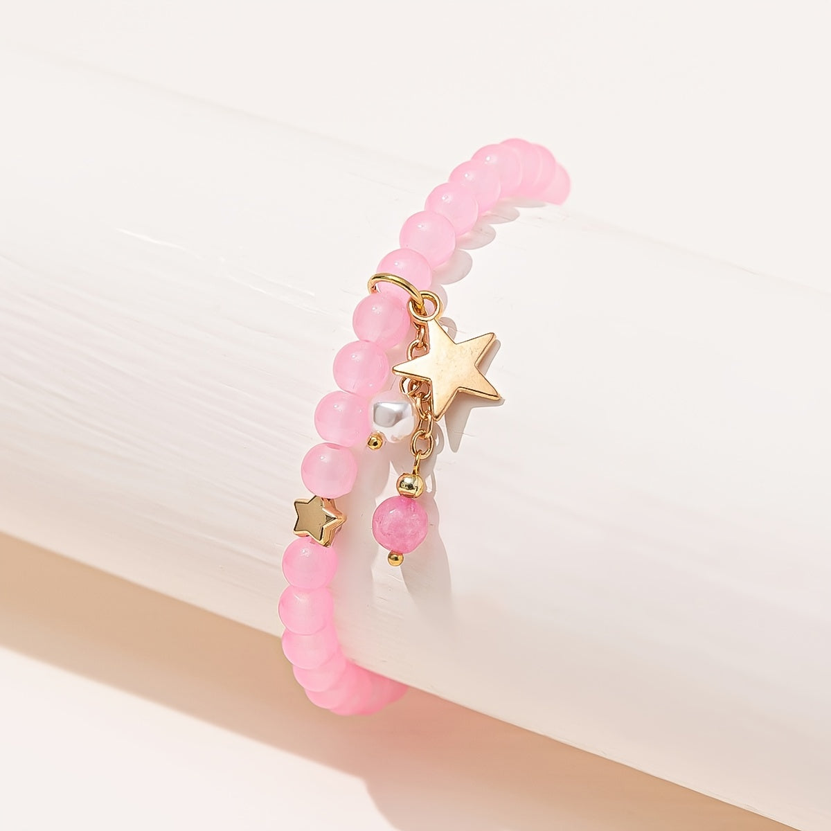 Pink Crystal Beaded Bracelet Star Shape Pendant Stretchable Bracelet