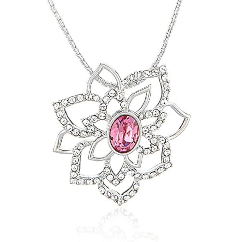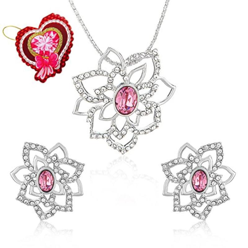 This elegant pendant set features a pink rose flower design with dazzling Swarovski Elements. It comes with a heart-shaped card, making it a perfect gift.