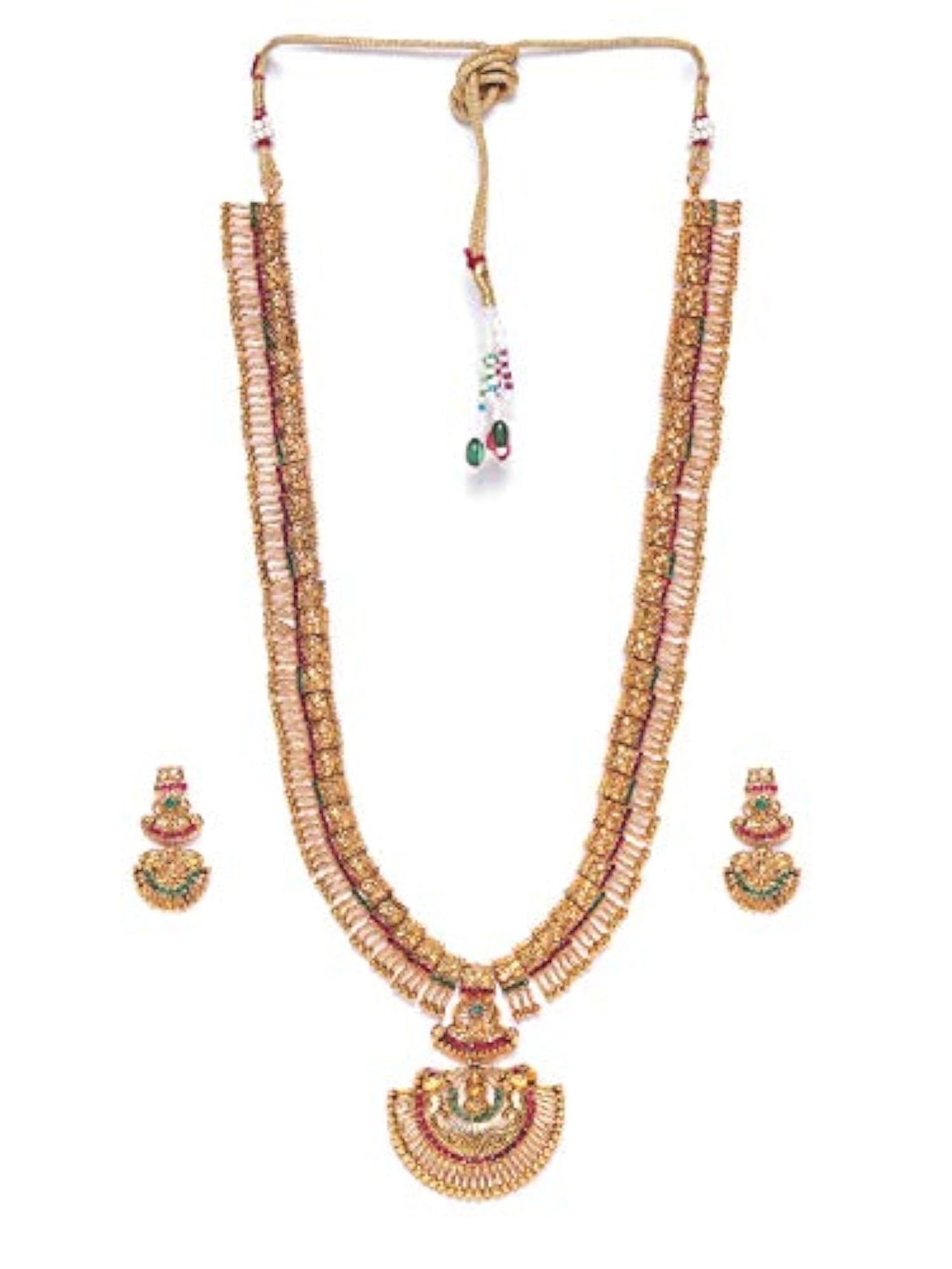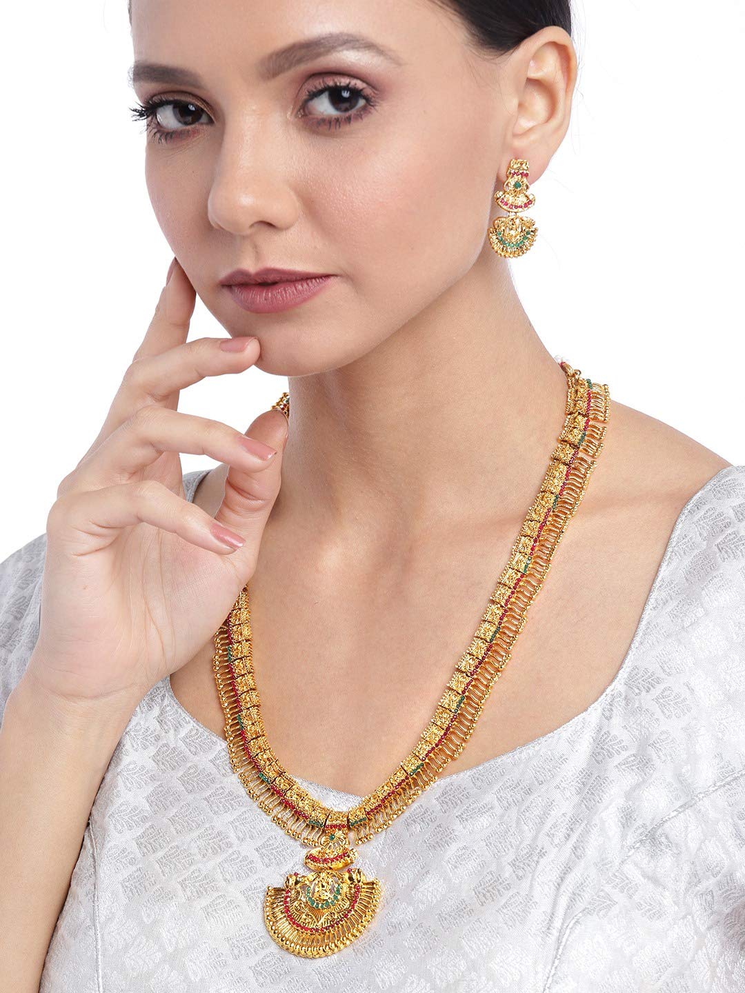 Elegant long necklace and earring set with pink stones in South Indian temple design.
