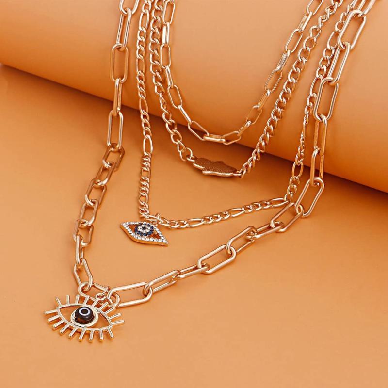 Enhance your style with this stunning layered necklace featuring a plated-toned evil eye and Buddha hand design.