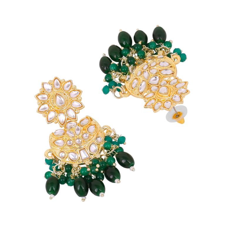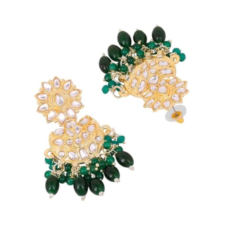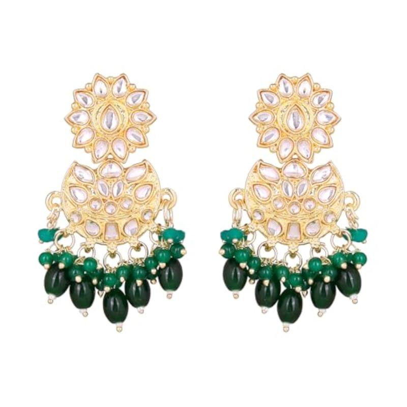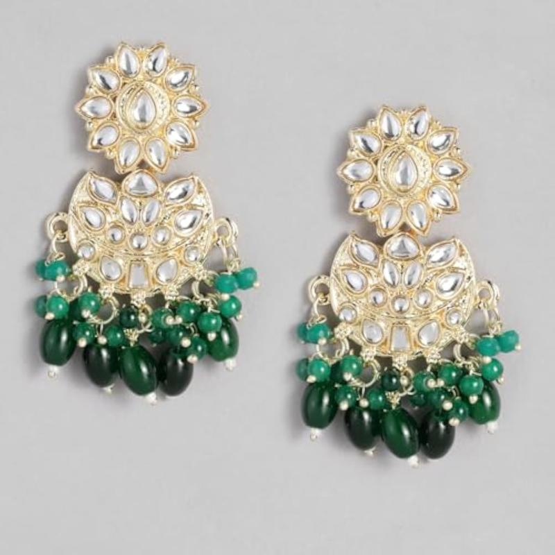 Elegant drop earrings featuring plated flower design with kundan stones and beaded pearls. Perfect for special occasions.