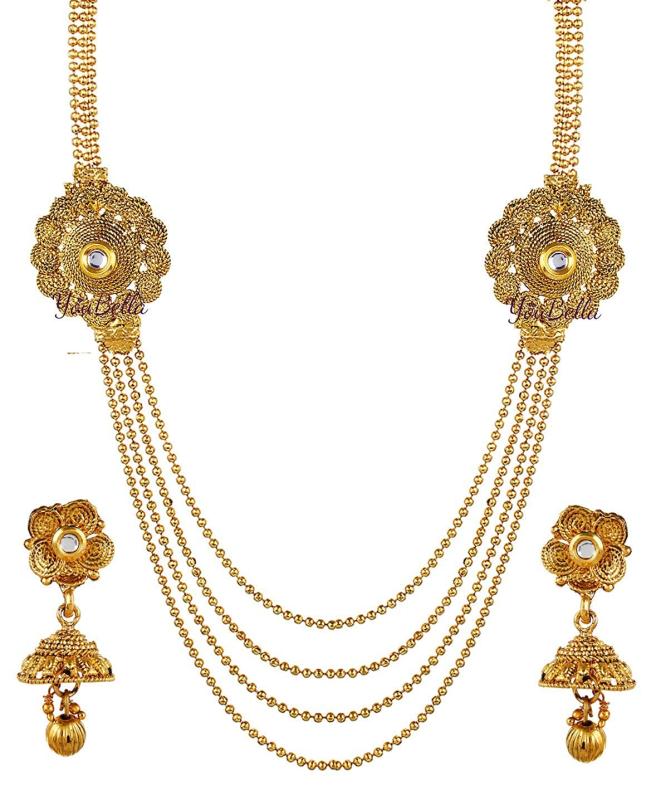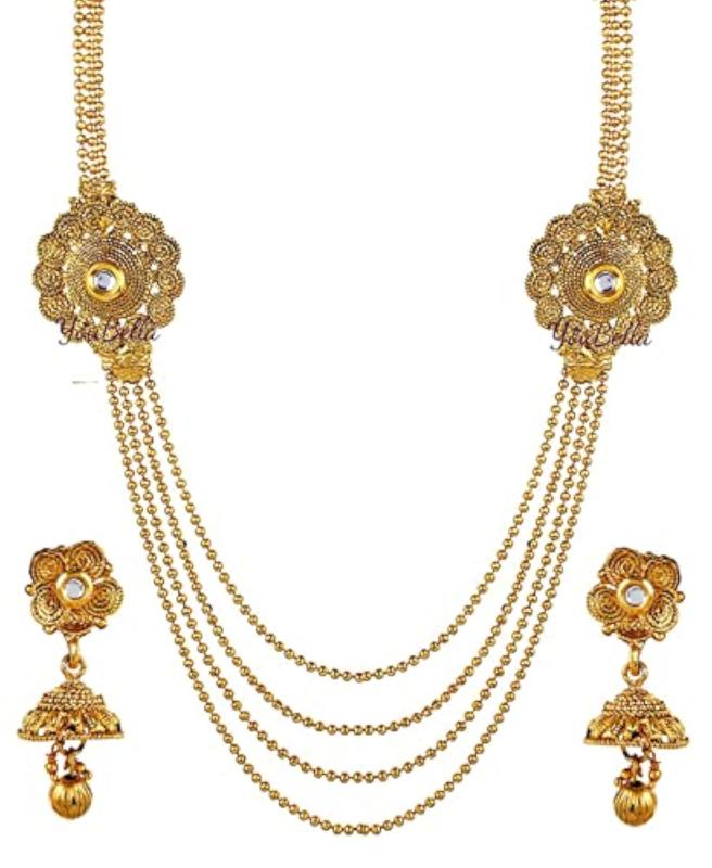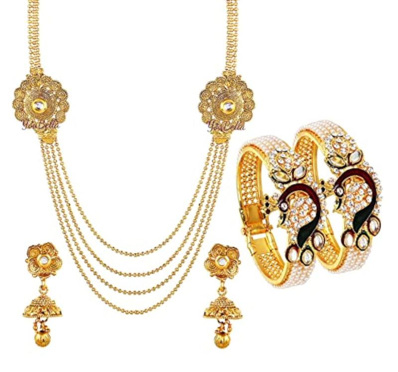Stunning jewellery set featuring a plated necklace, matching earrings and bangles. Perfect for girls and women.