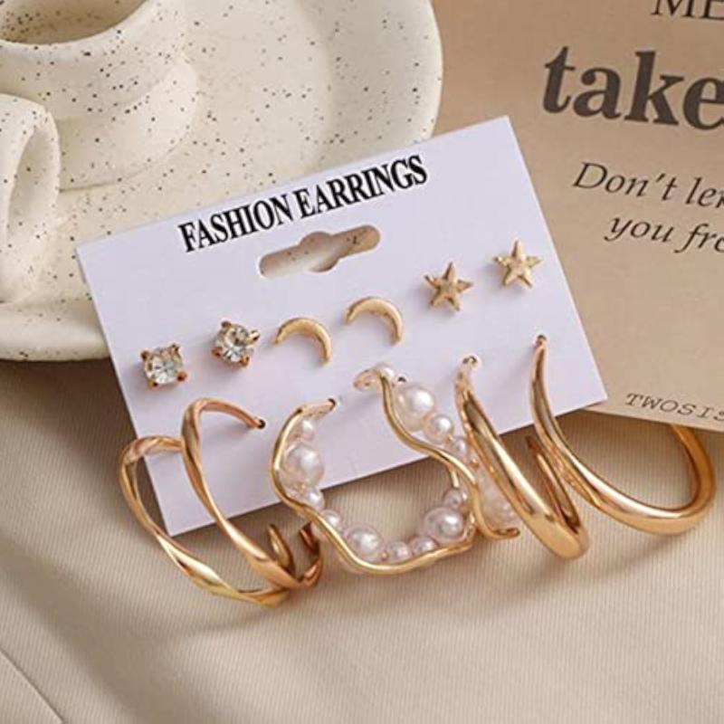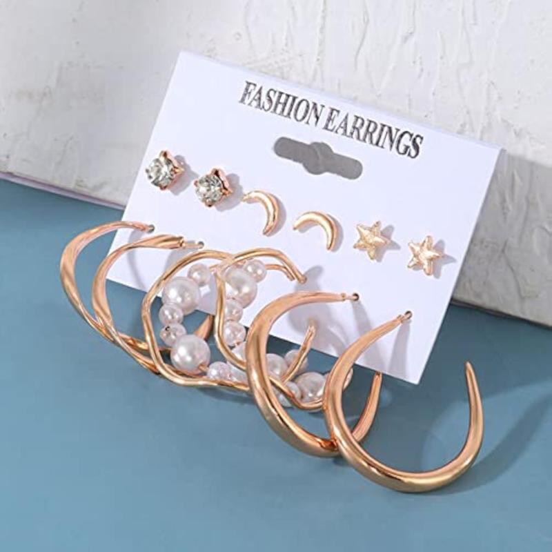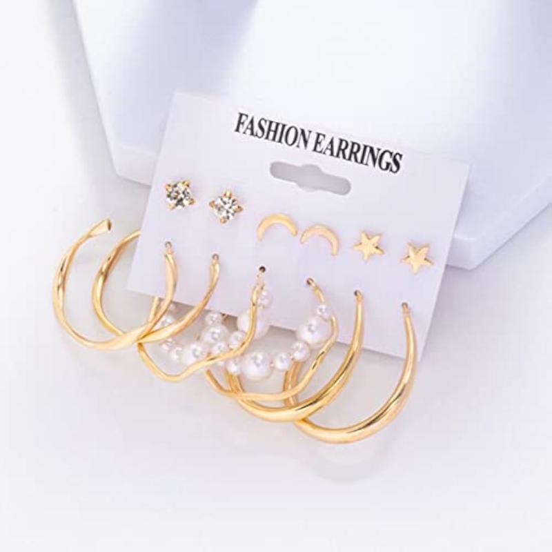 Elevate your style with this trendy set of 6 contemporary studs and hoop earrings featuring stars and moon designs.