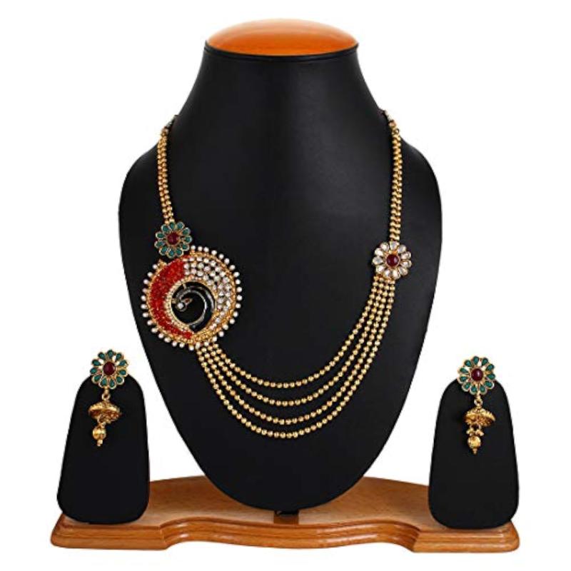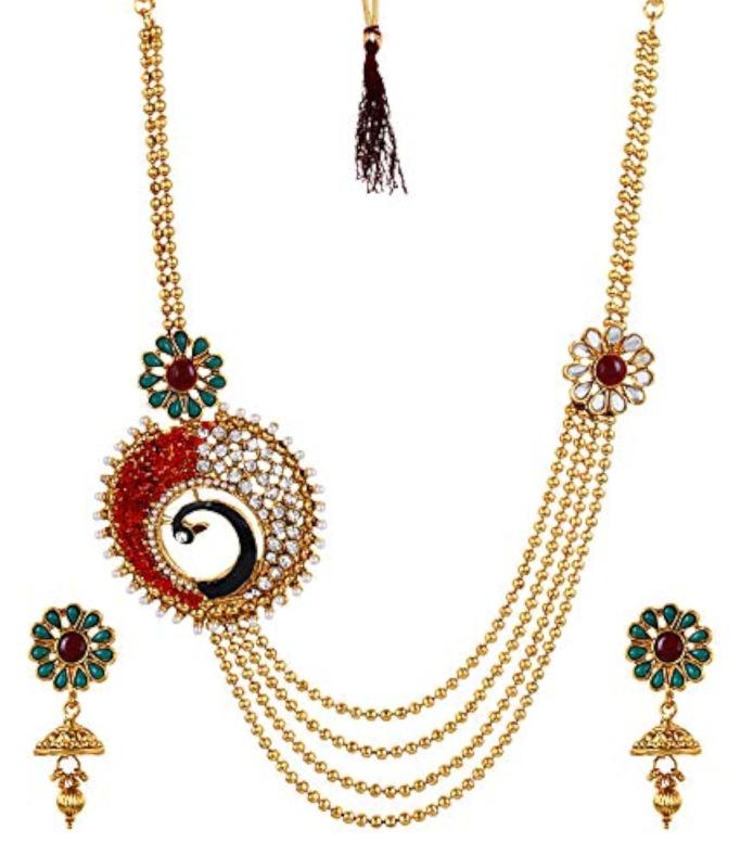 Complete your wedding look with this elegant jewellery set featuring a plated necklace and matching earrings.