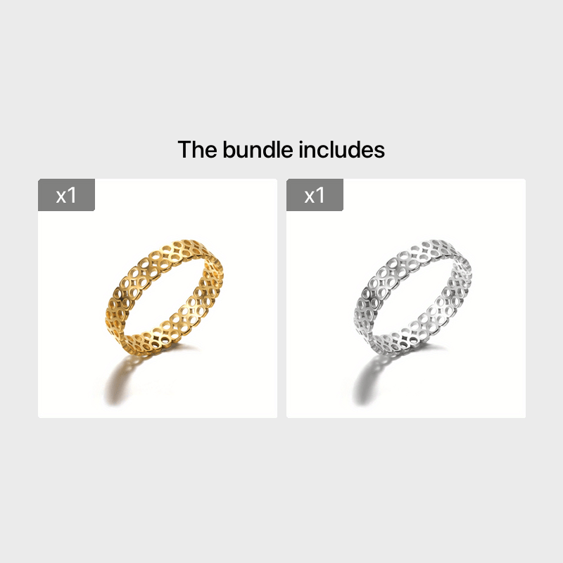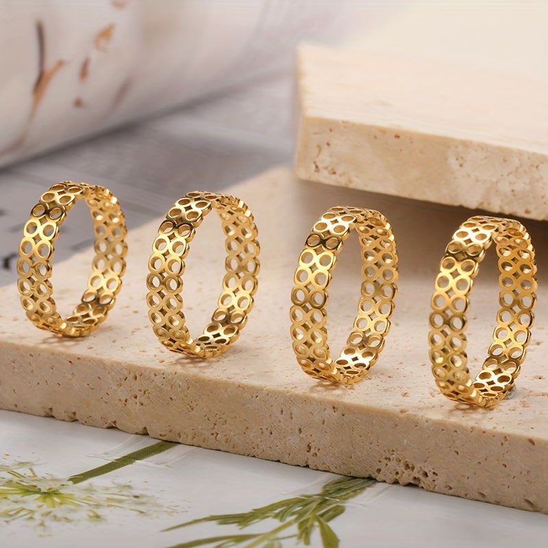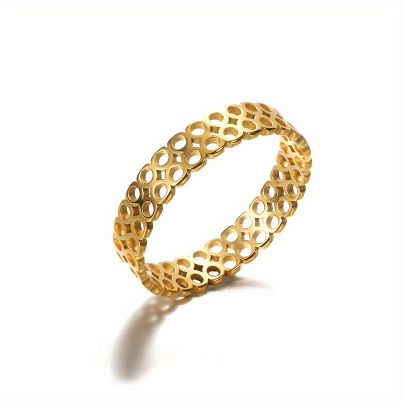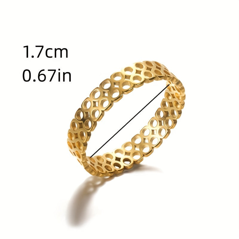This ring features a hollow small circle design, crafted from platinum and 18k gold plated stainless steel. Suitable for both men and women.