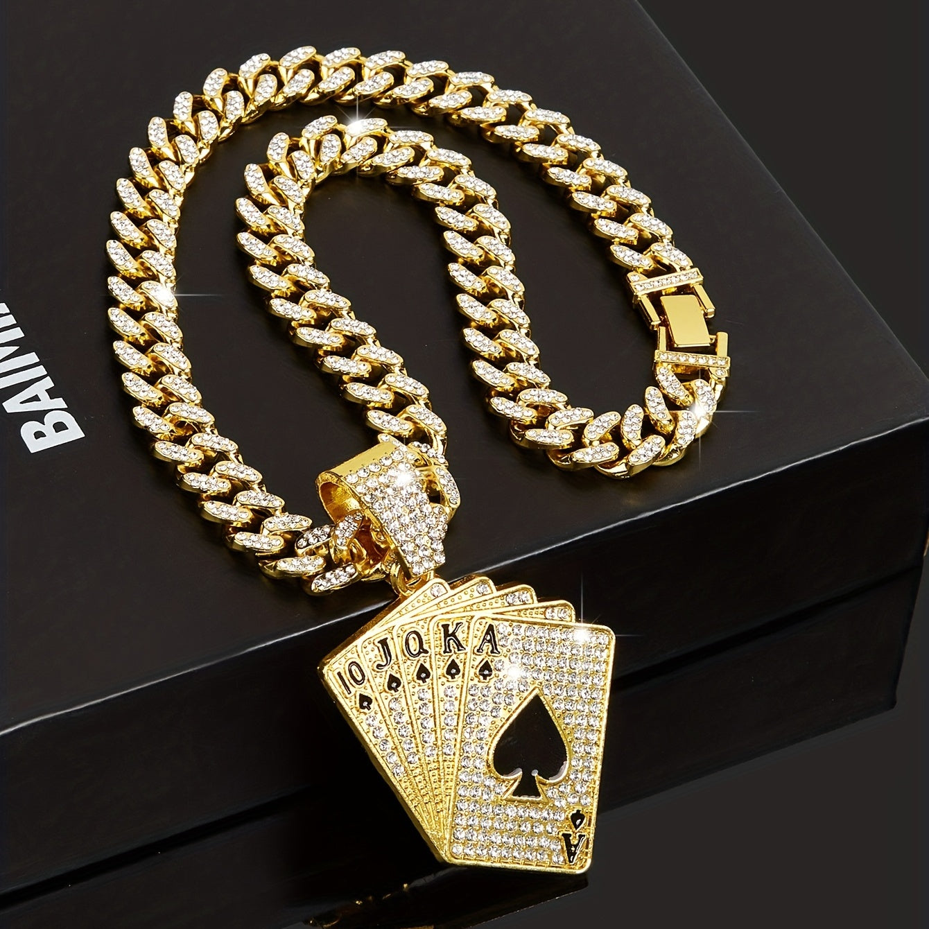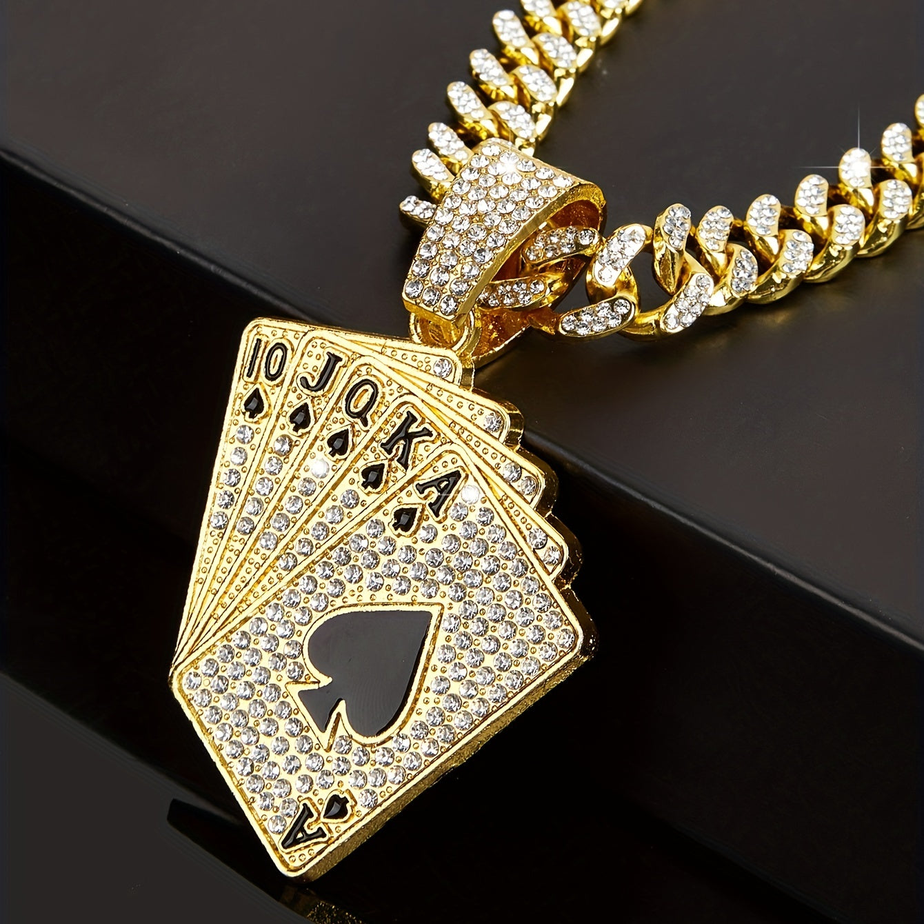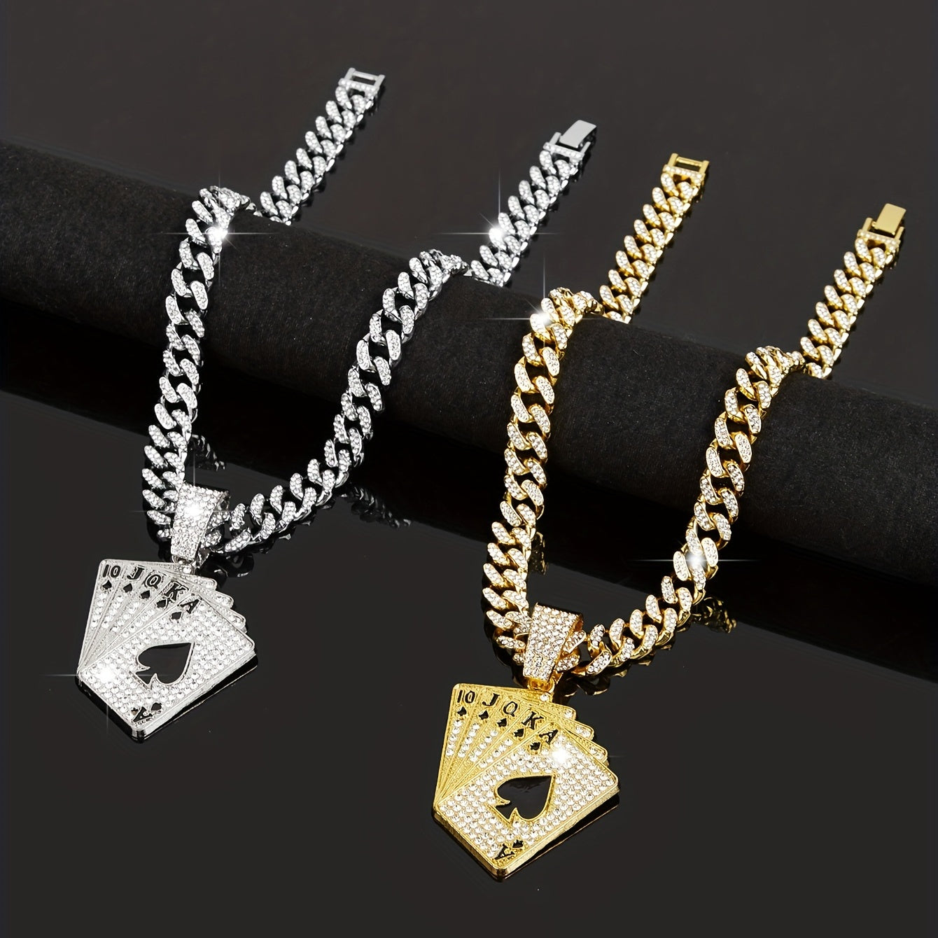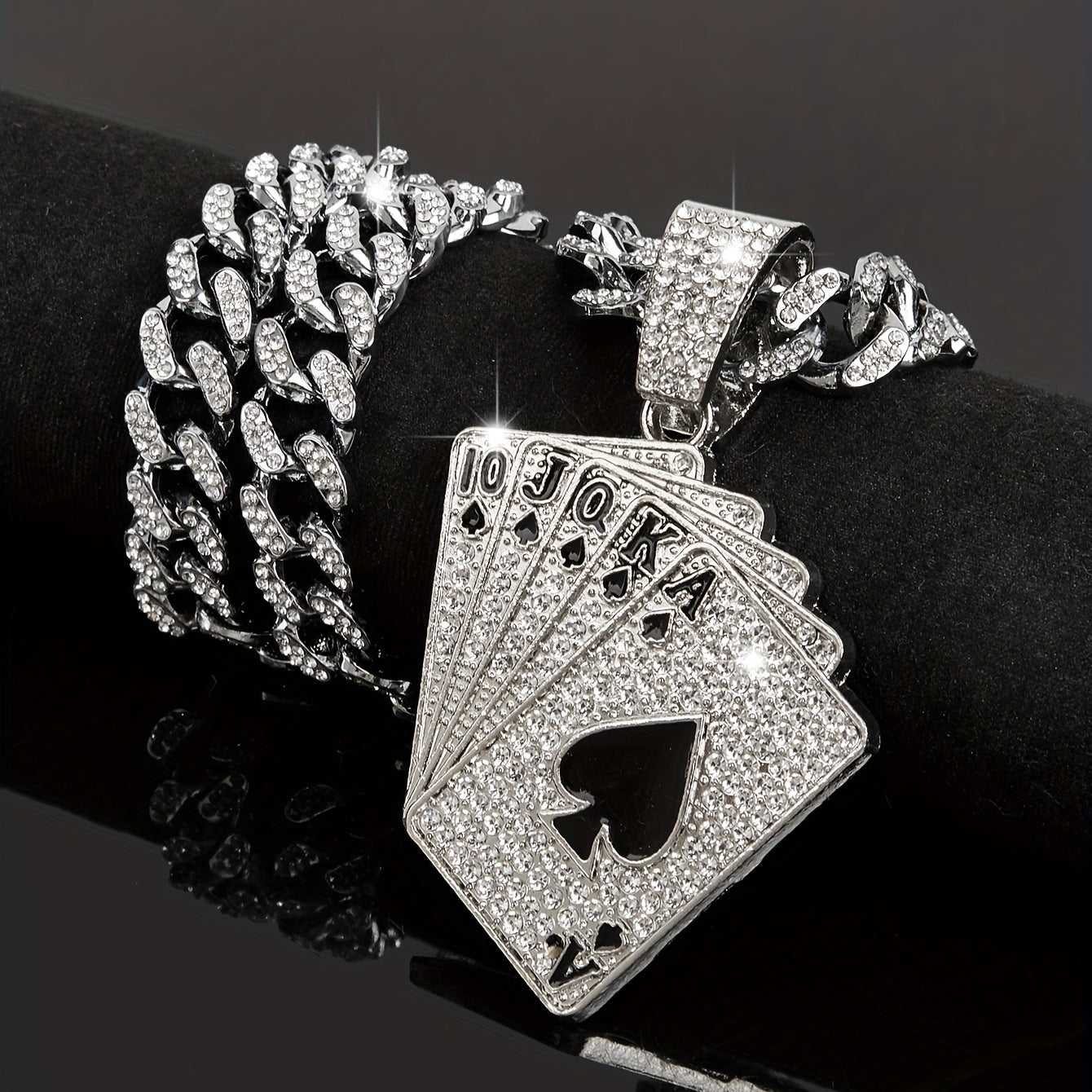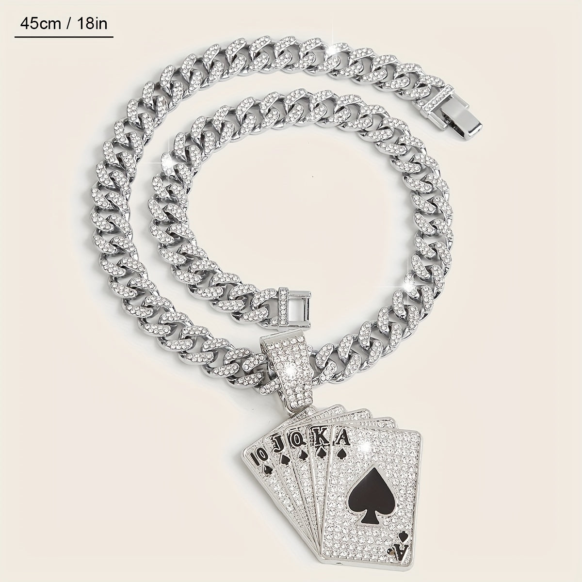 Add a touch of personality and style to your party outfits with this stunning rhinestone Cuban chain necklace featuring a poker pendant. Perfect for women and girls who love unique accessories.