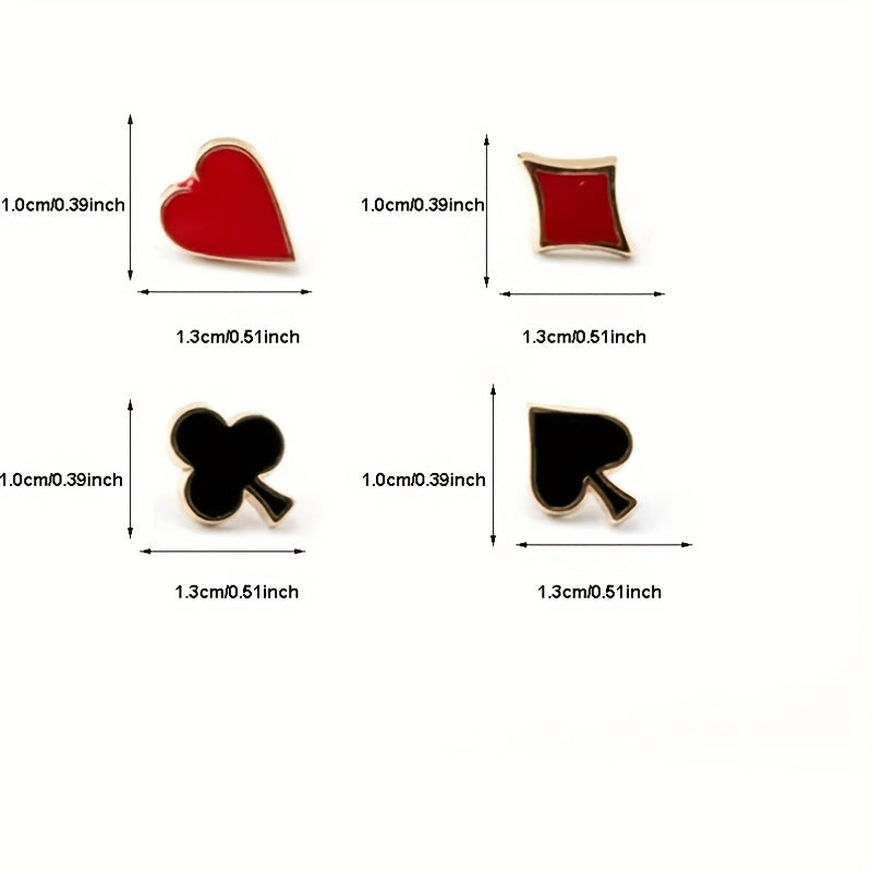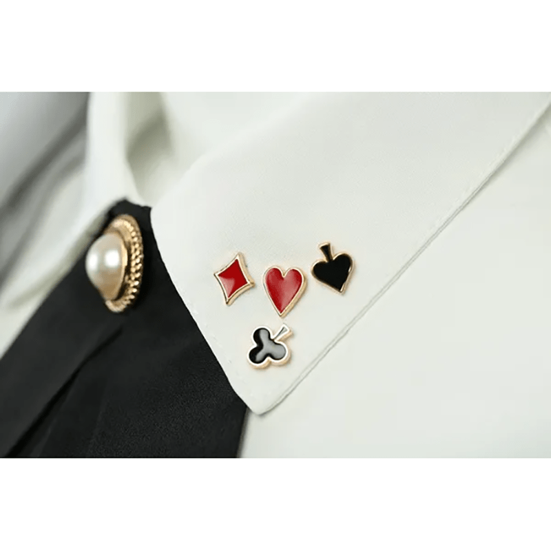 Add a touch of fun to your outfit with these 4 poker shaped brooches. Made with high quality materials, these collar pins feature heart, spade, club, and diamond designs.