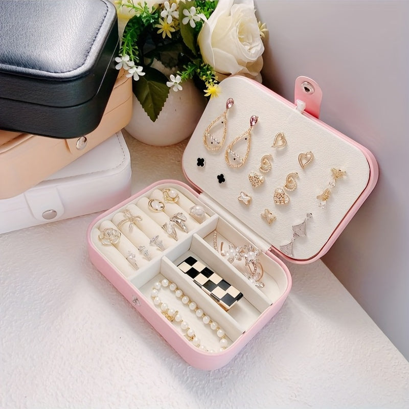 Keep your jewelry safe and organized while traveling with this double-layer jewelry box. It has compartments for earrings, rings, and necklaces, ensuring everything stays in place.