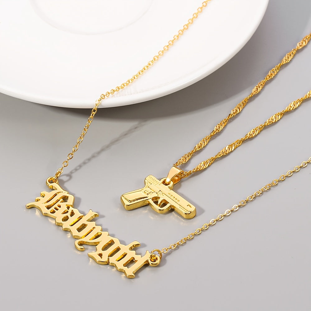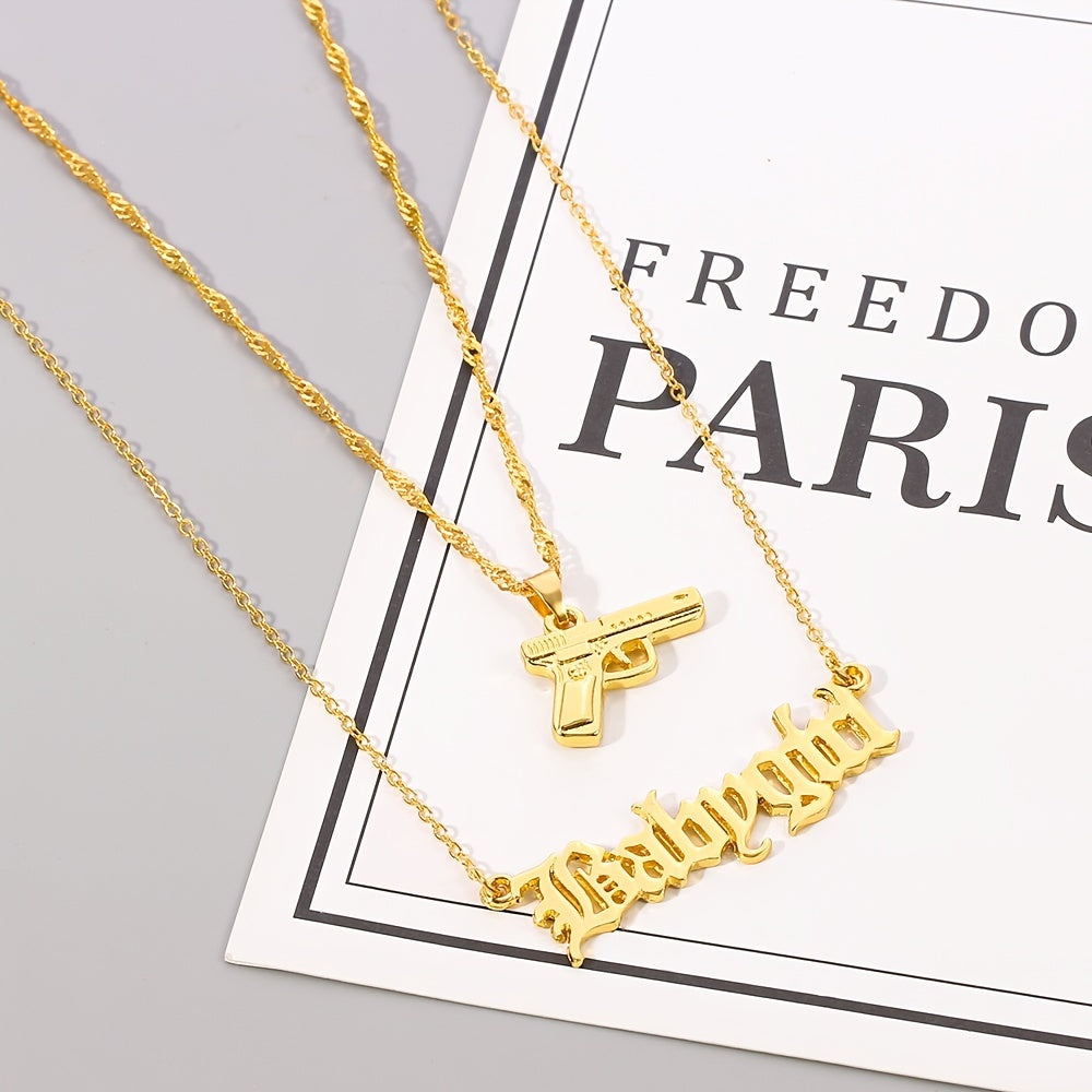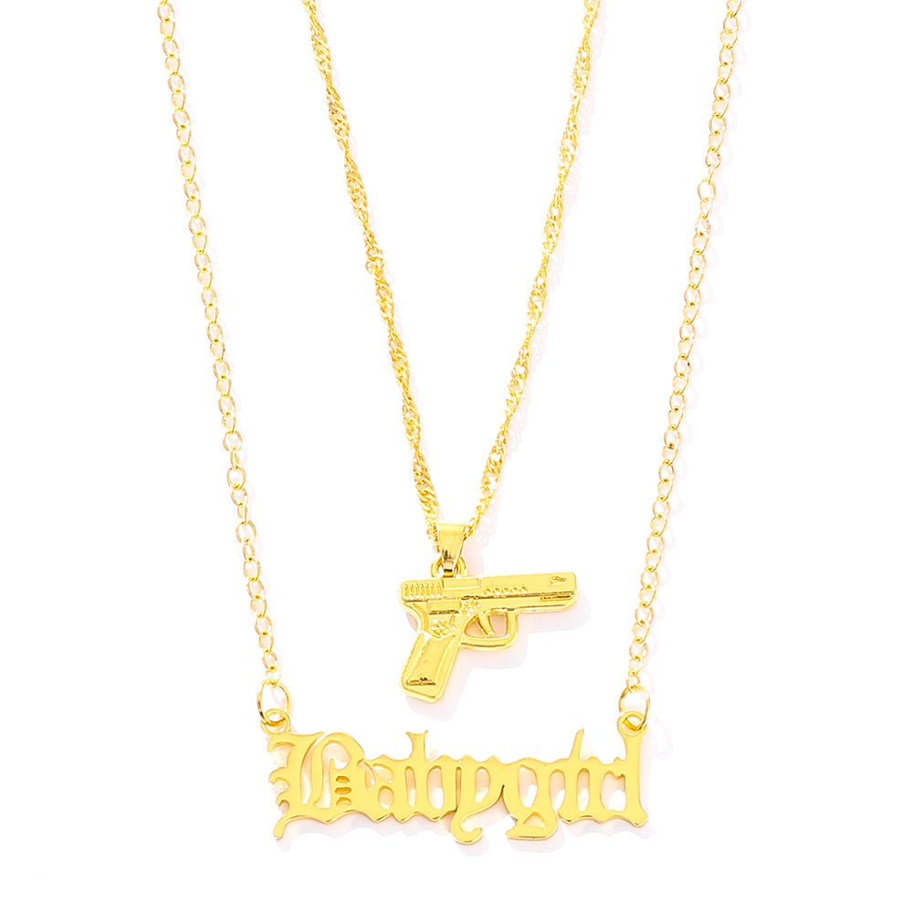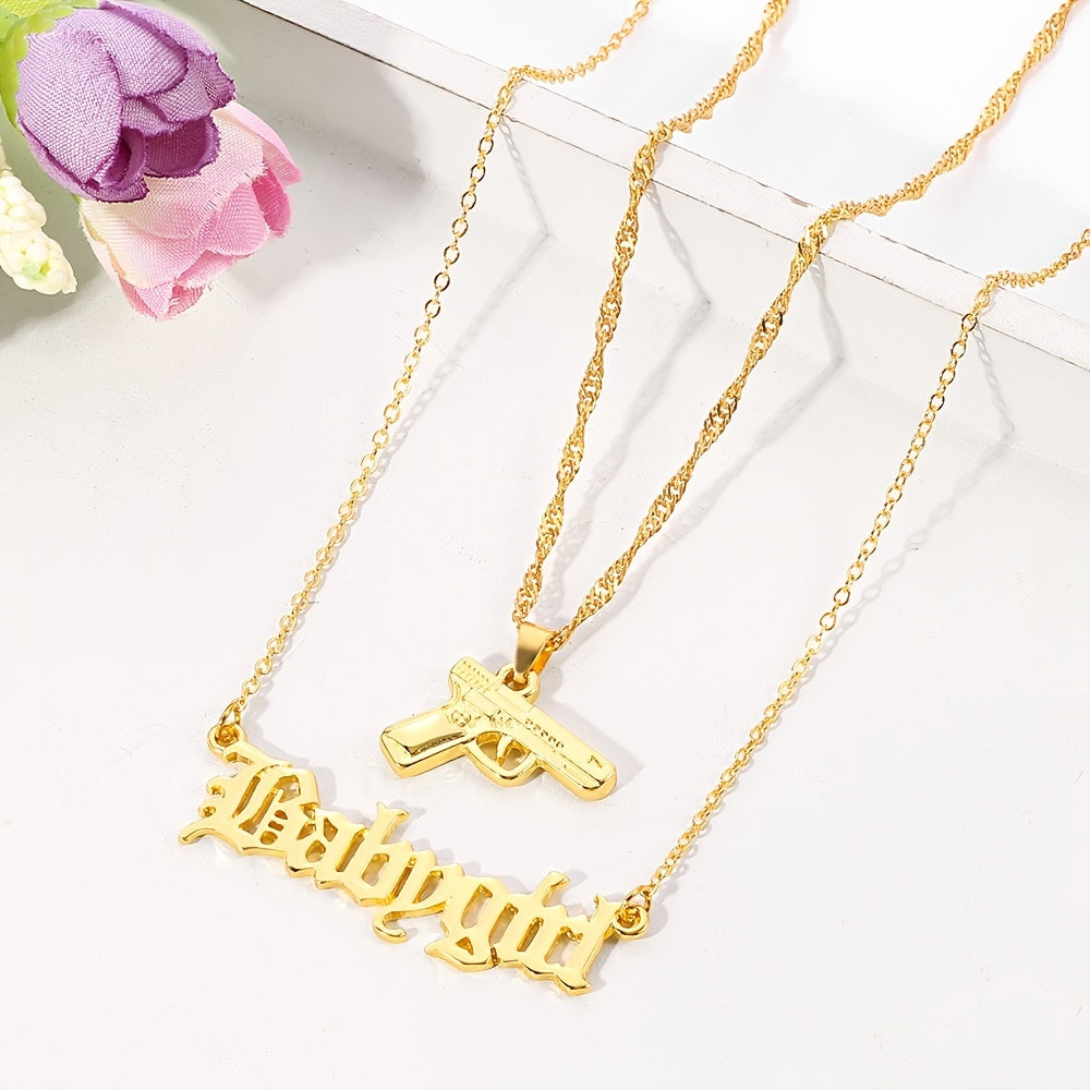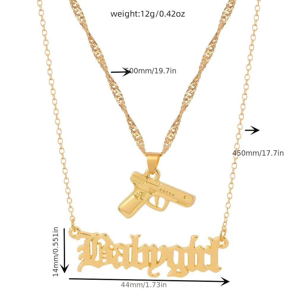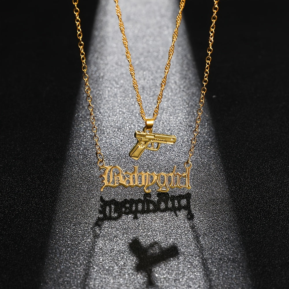 Express your unique style with this punk hip hop necklace featuring a pistol and babygirl charms. Perfect for adding edge to your look.