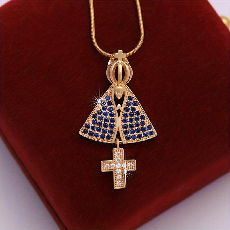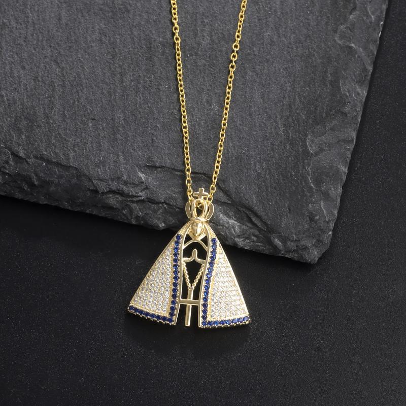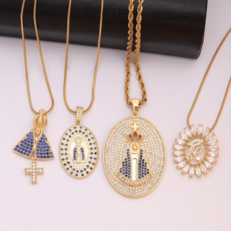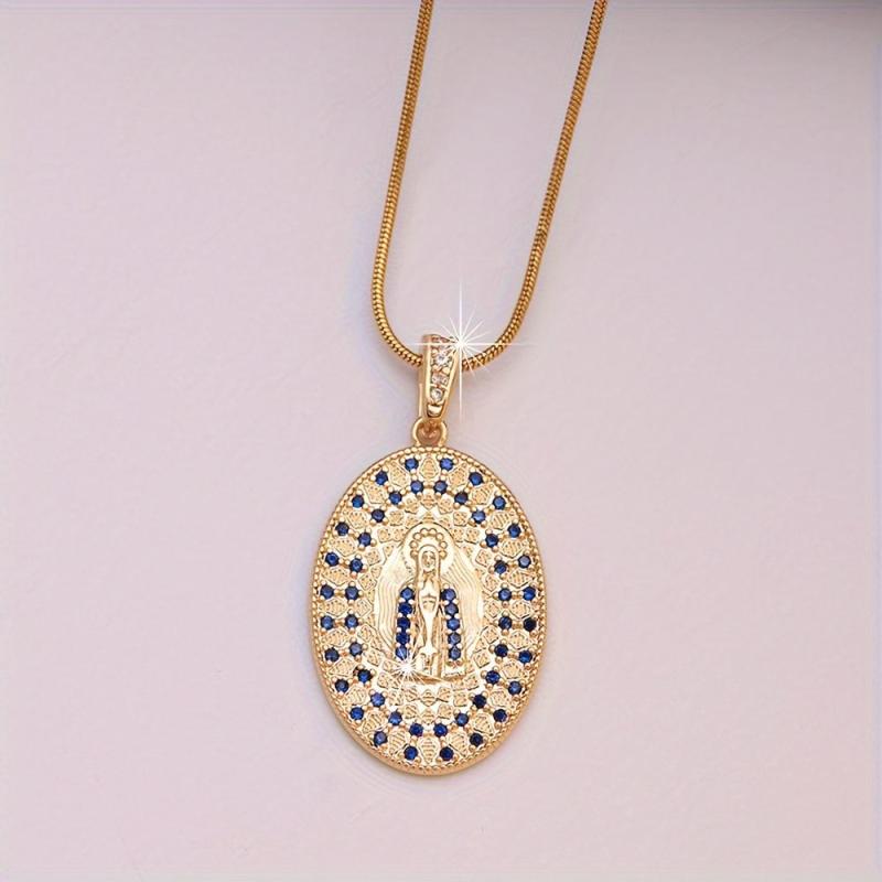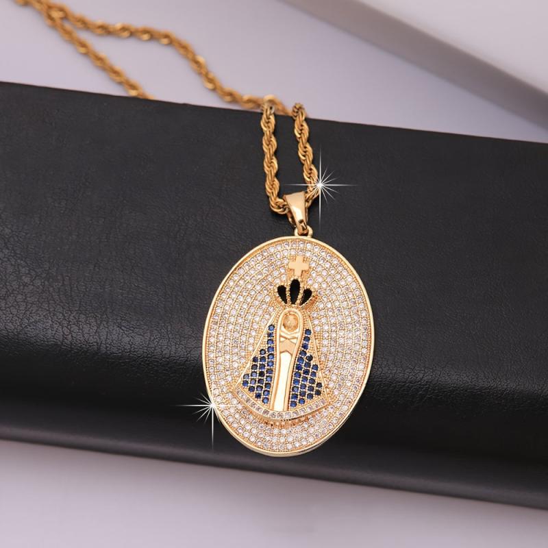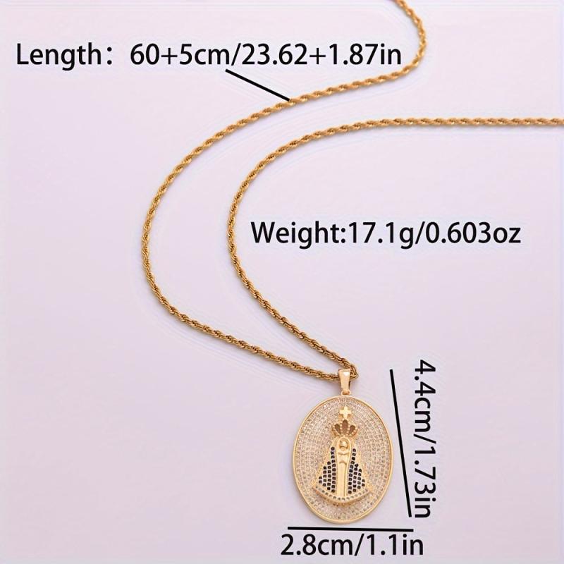 This pendant necklace features the Virgin Mary design with synthetic zirconia stones on an 18K plated stainless steel chain. Perfect for couples who love punk rock style jewelry.