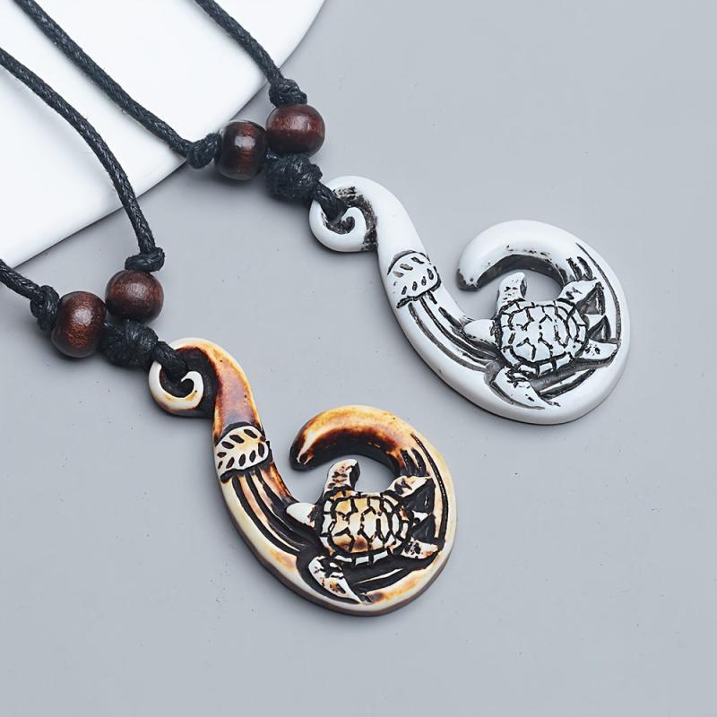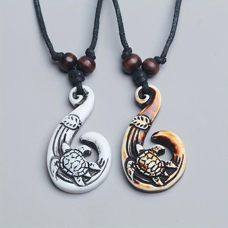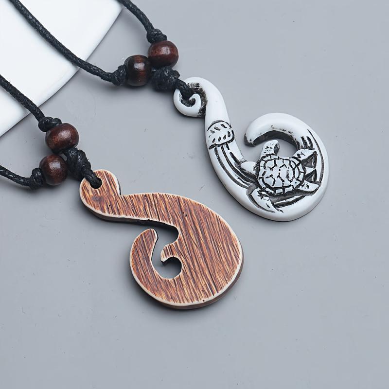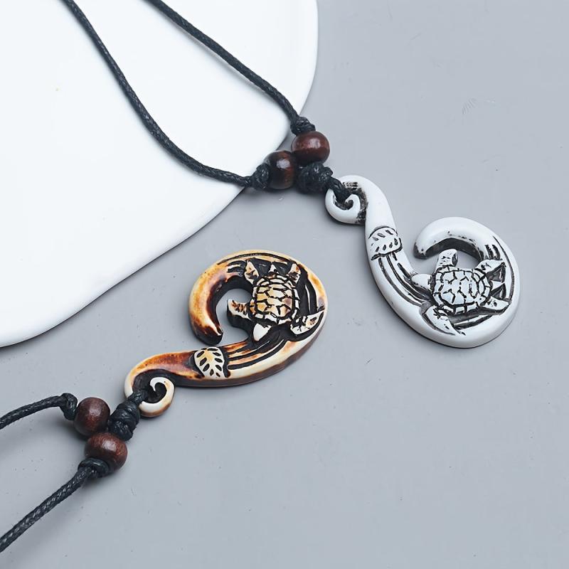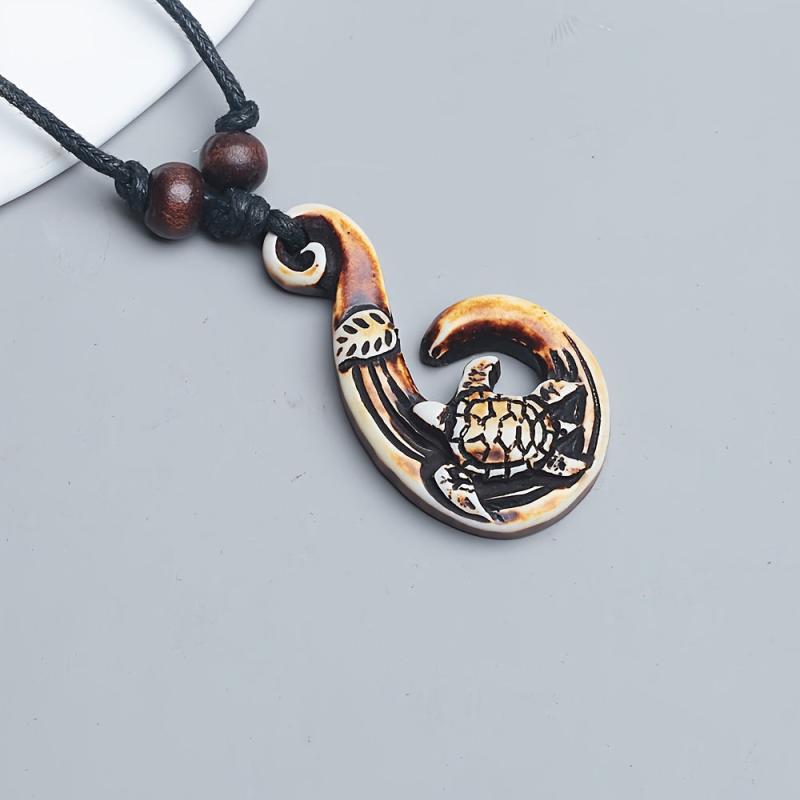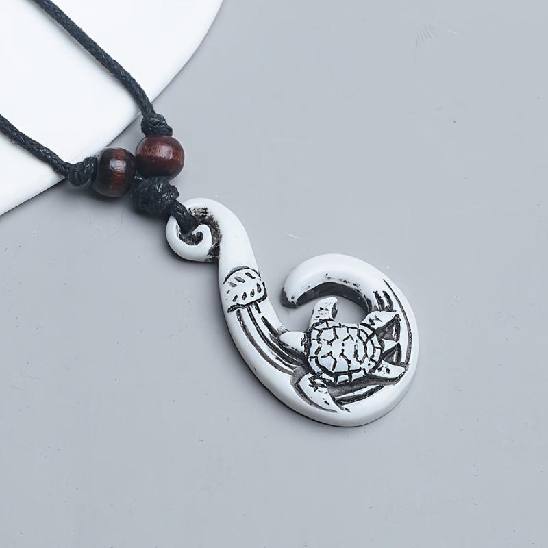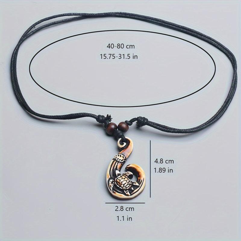 Unisex adjustable rope necklace featuring a fish hook pendant with acrylic and brown turtle. Perfect for casual daily wear without any plating.