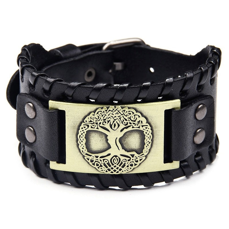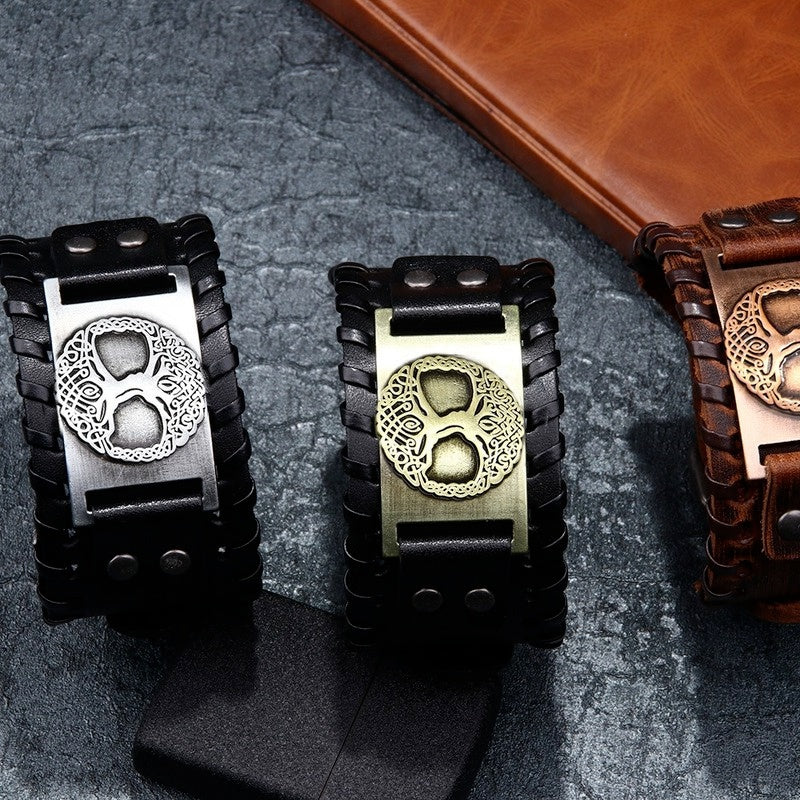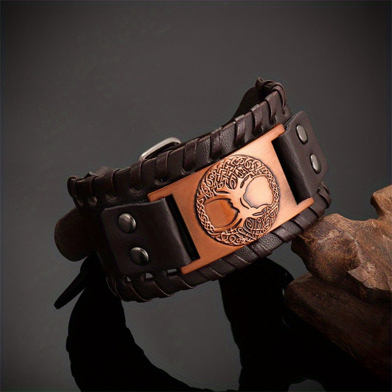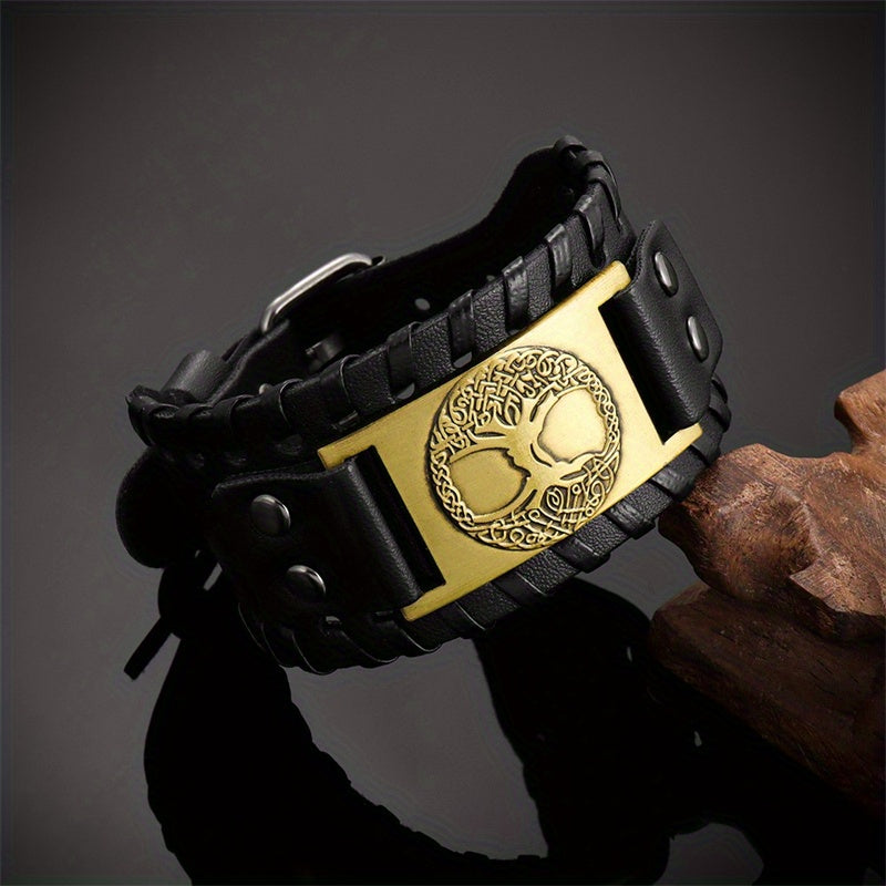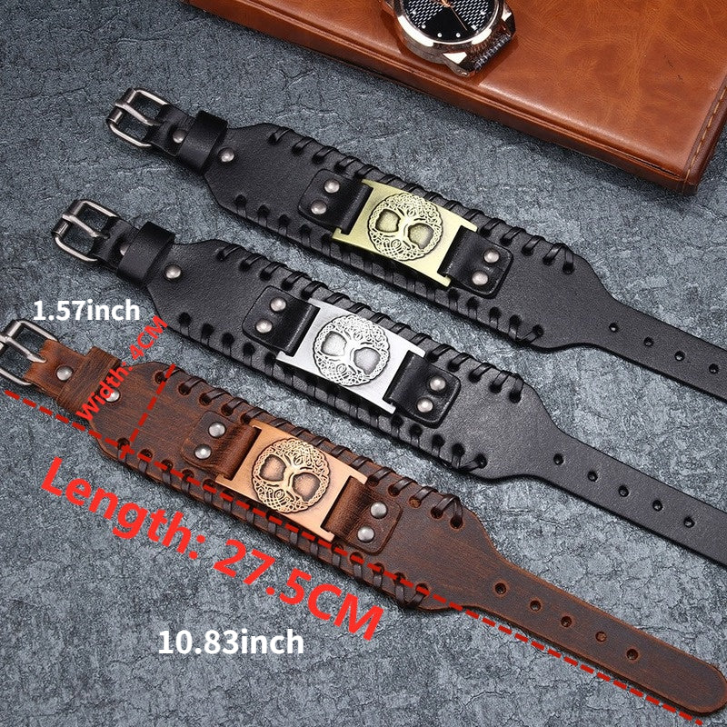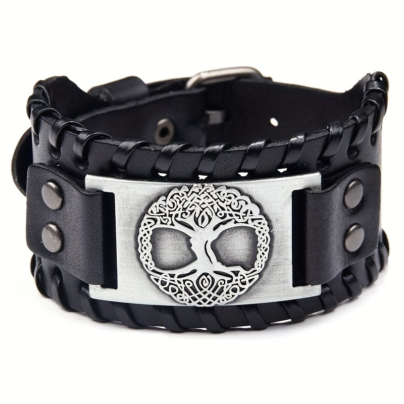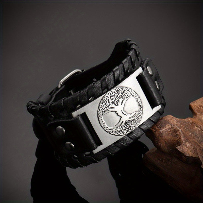Add a touch of edgy style to your look with this wide braided leather bracelet featuring a lucky tree pattern. Perfect for men with a punk-inspired sense of fashion.