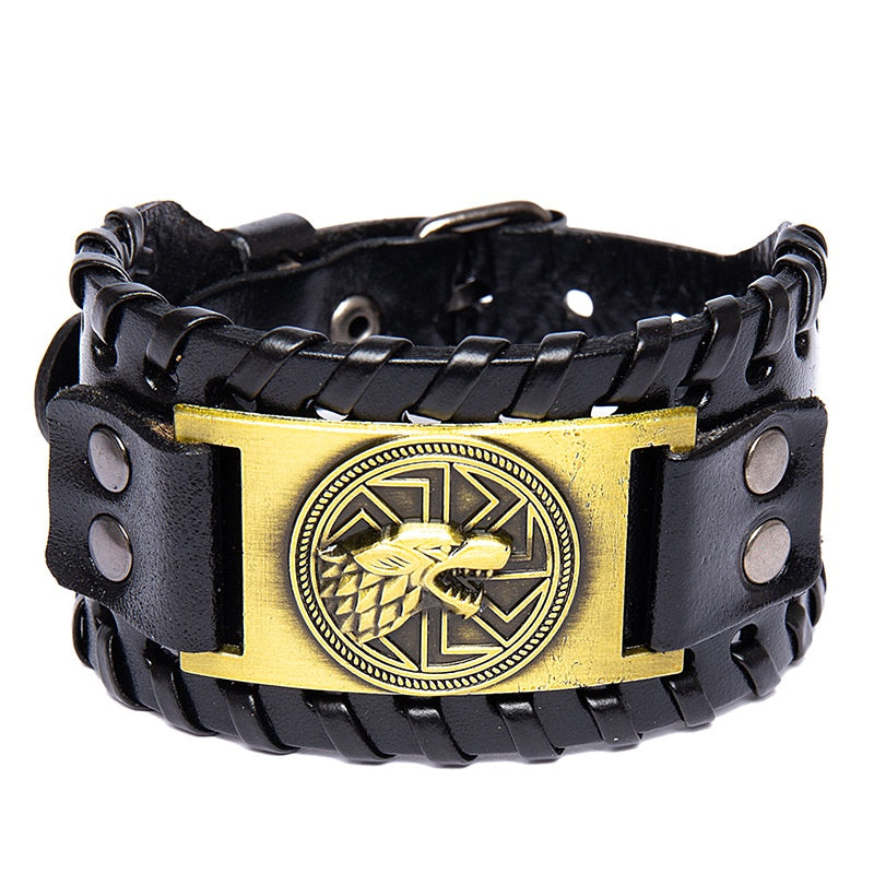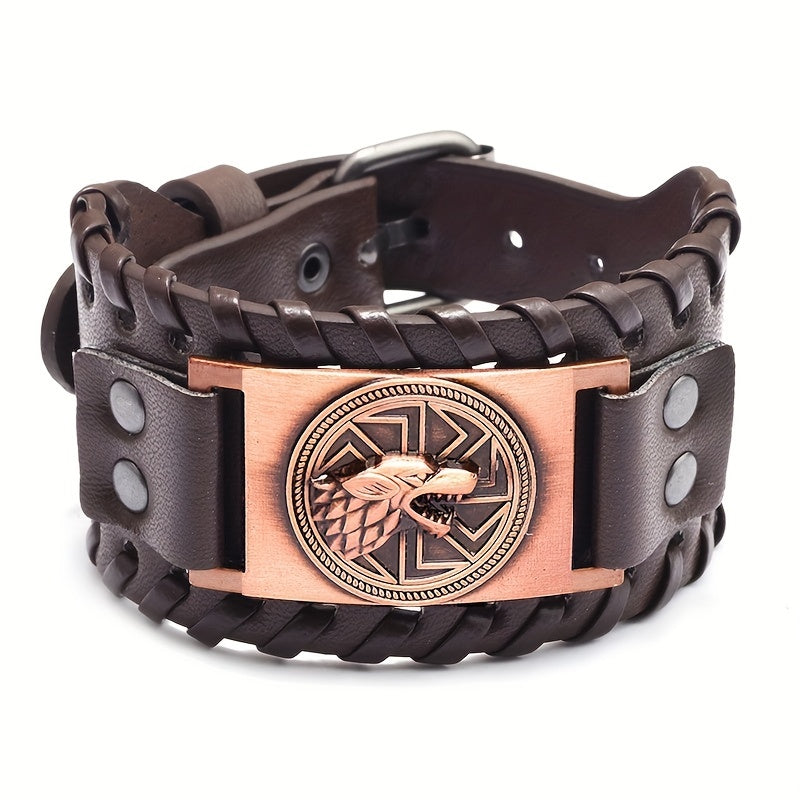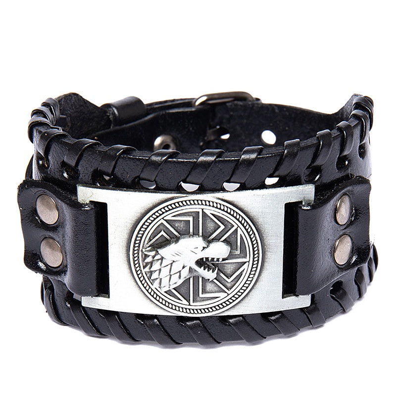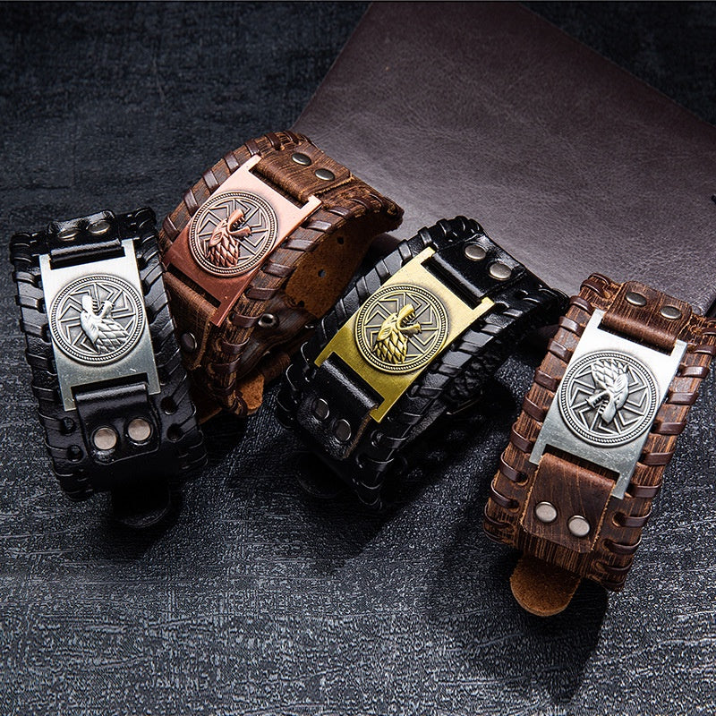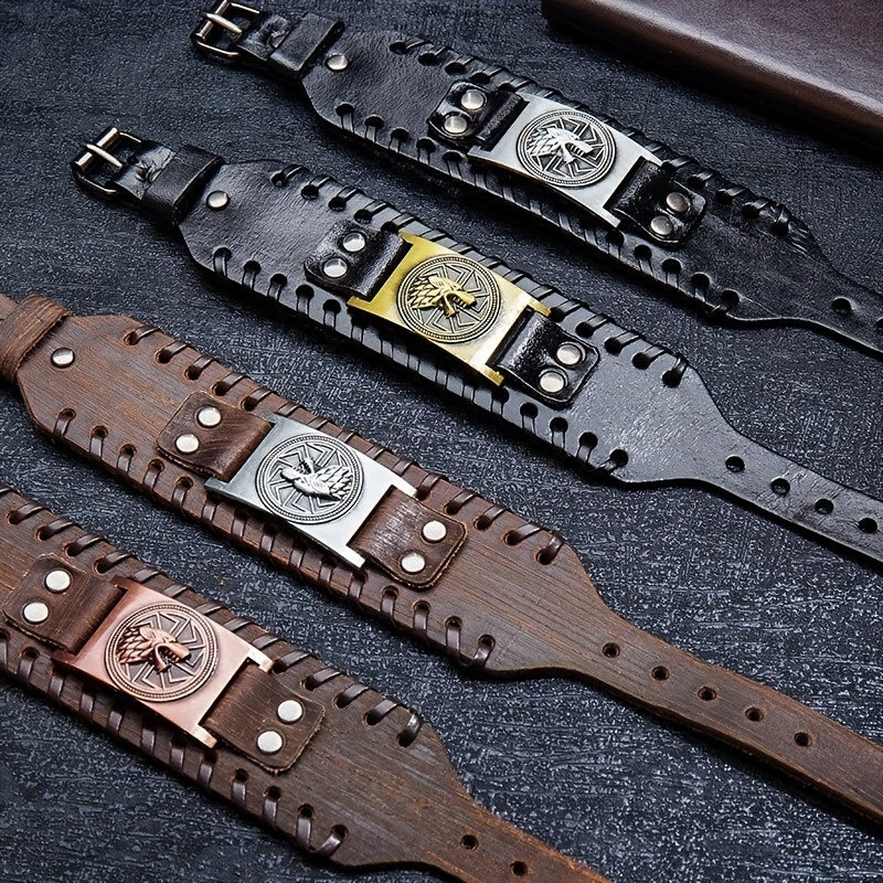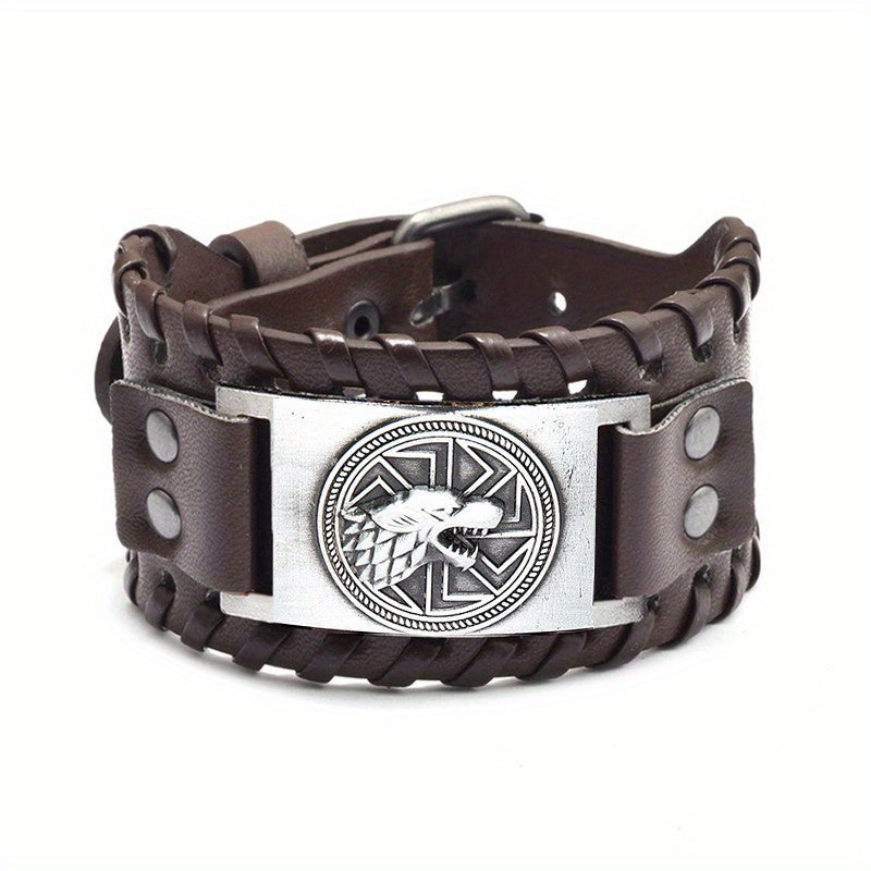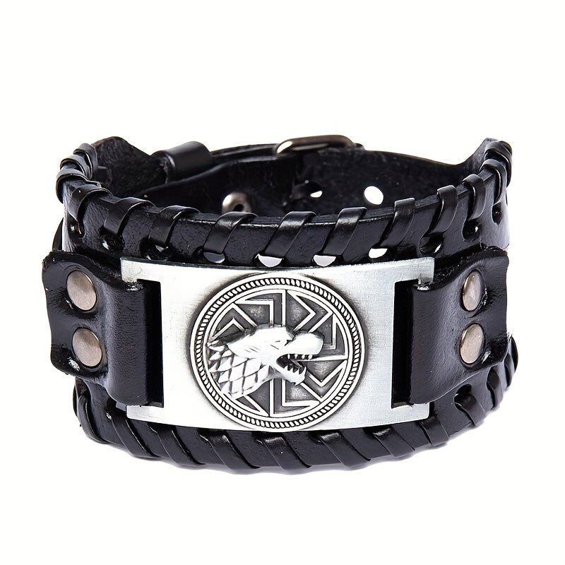 Add a touch of punk style with this men's leather bracelet featuring wolf heads and Nordic runes. The adjustable buckle ensures a comfortable fit.