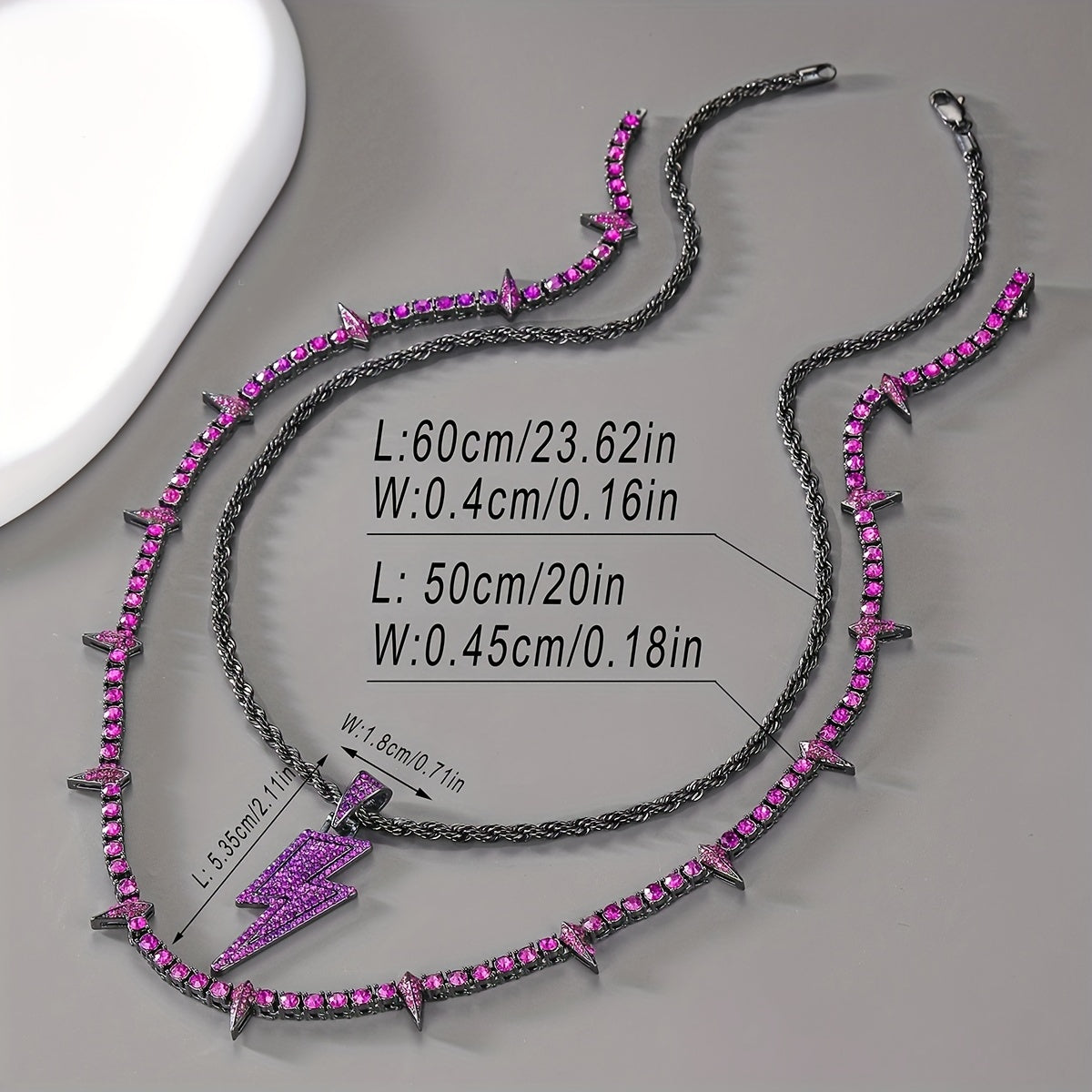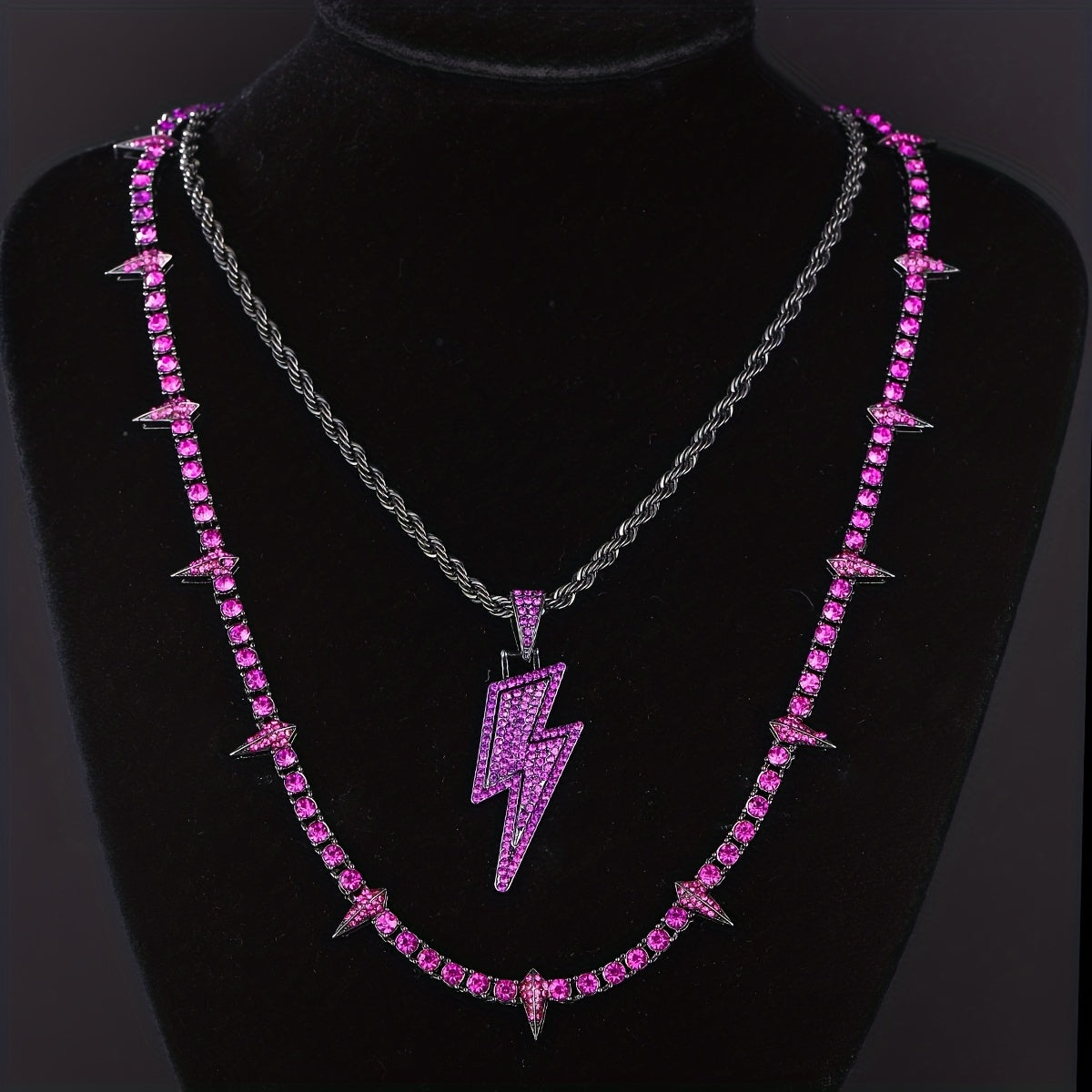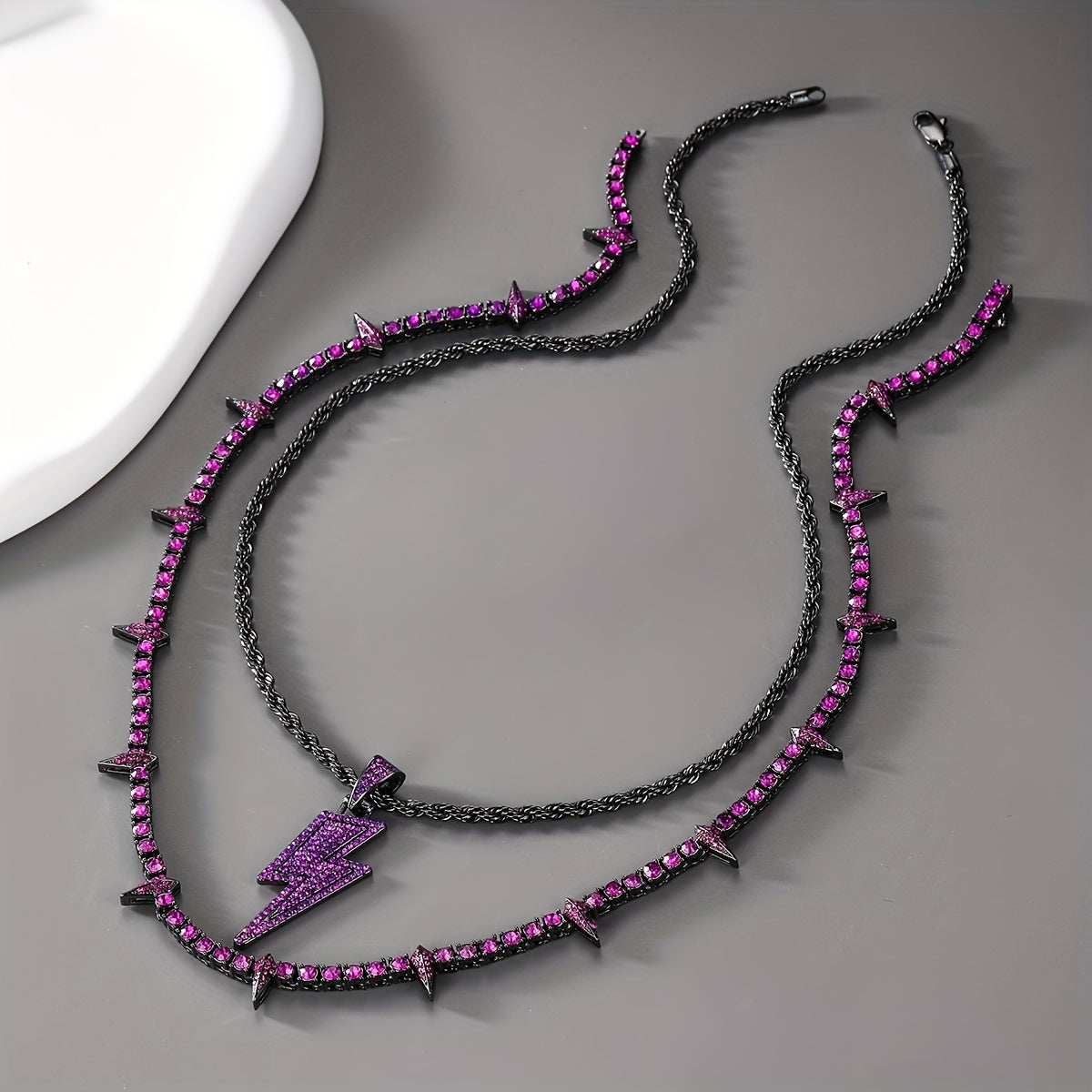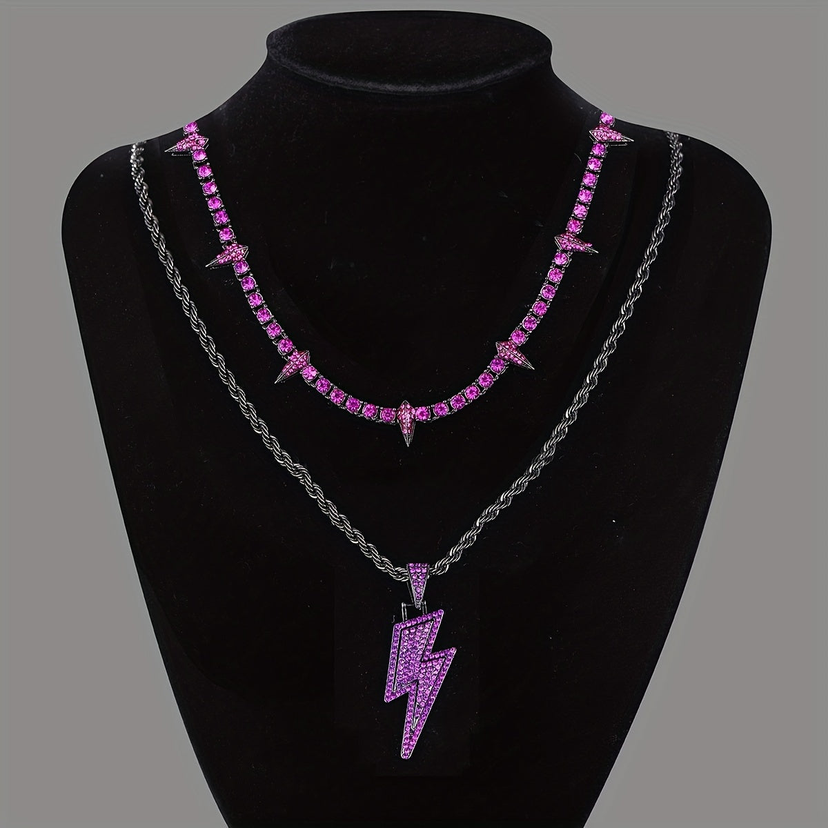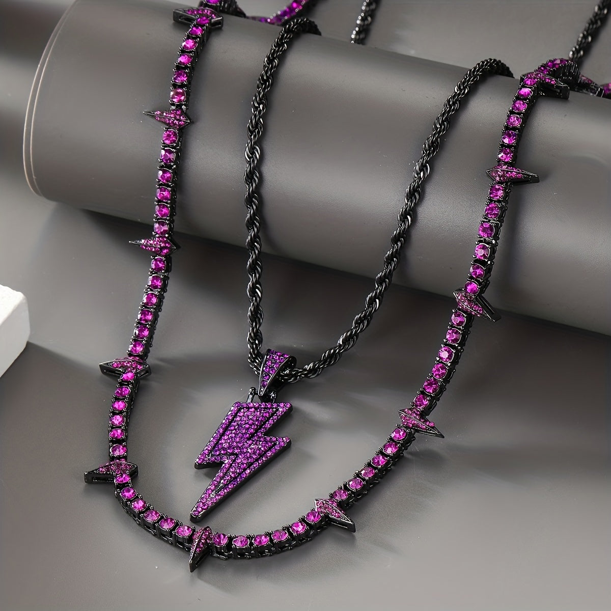 This trendy necklace features a purple lightning pendant on a spiked purple tennis chain with a wheat spike chain. Perfect accessory for hip hop lovers and teens.