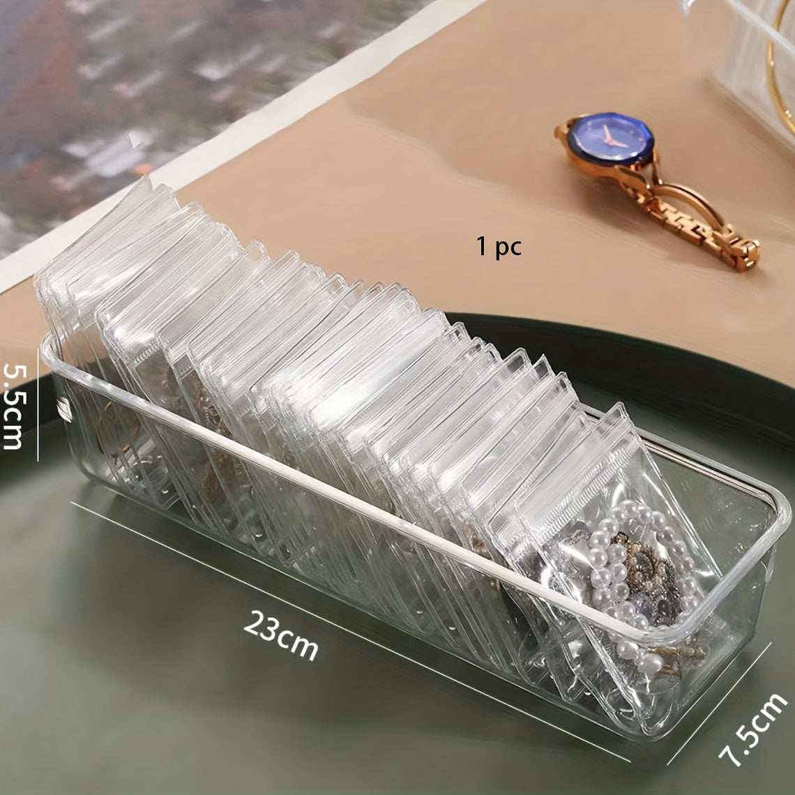 Keep your jewelry organized and safe with this PVC storage bag. Perfect for travel or everyday use.