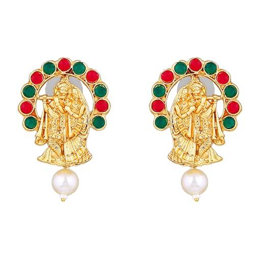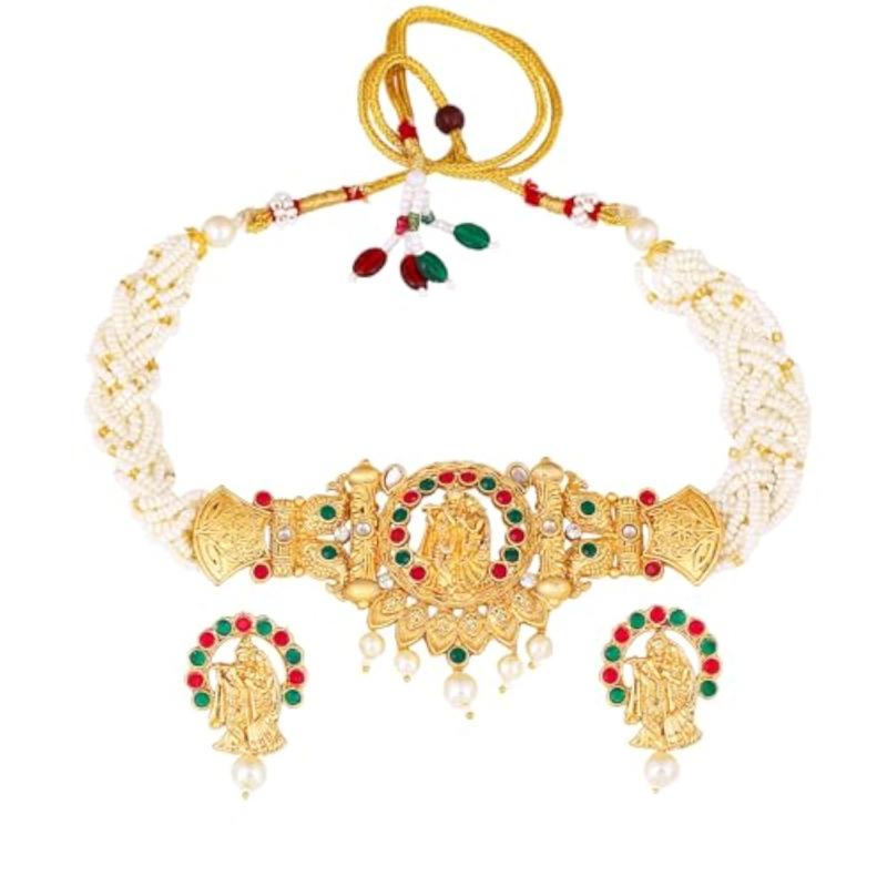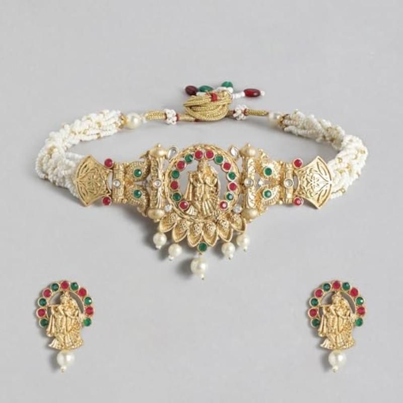 Elegant choker necklace set featuring plated Radha Krishan leaf design with artificial stones in green and ru colors.