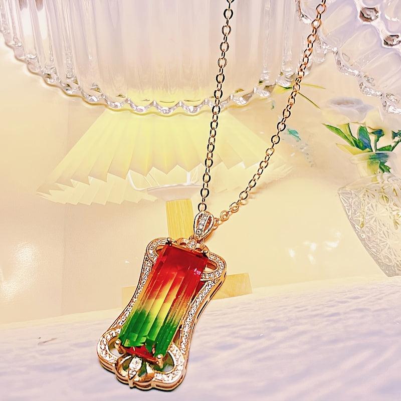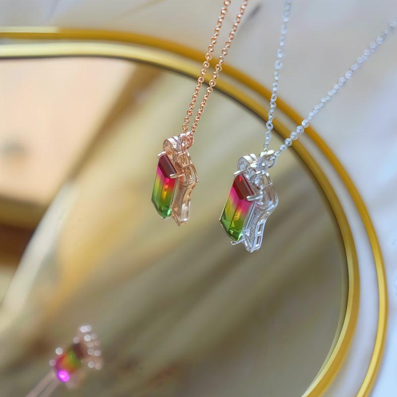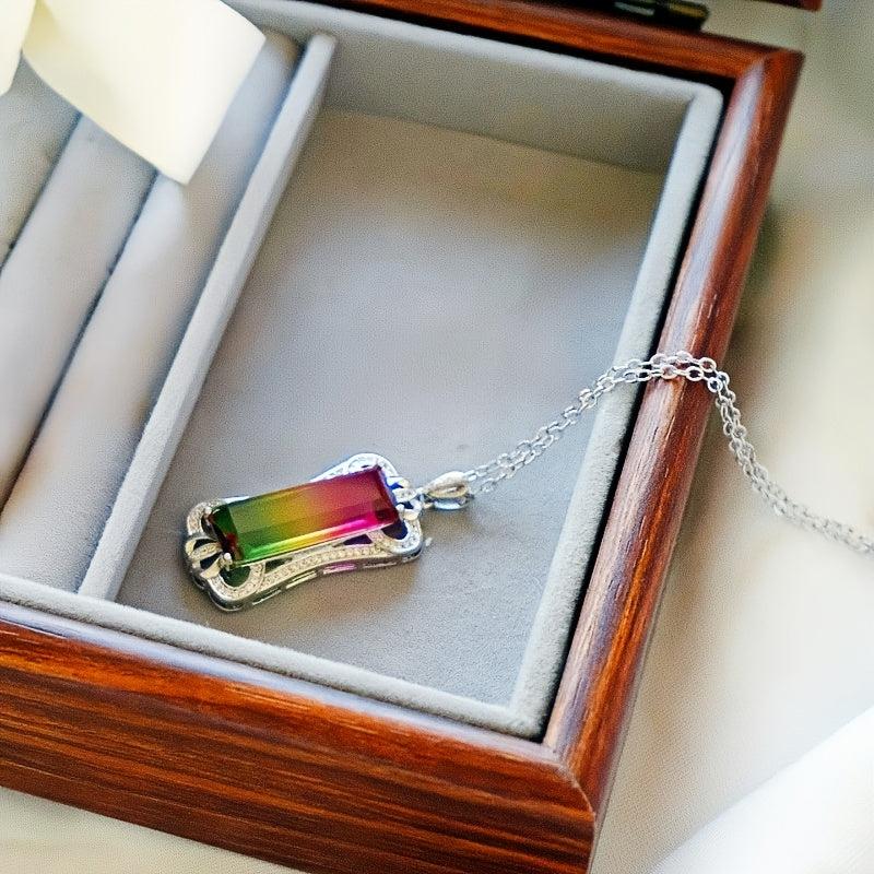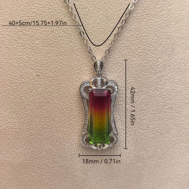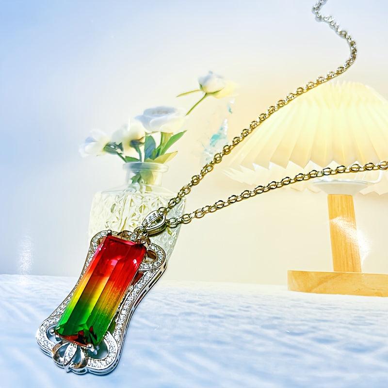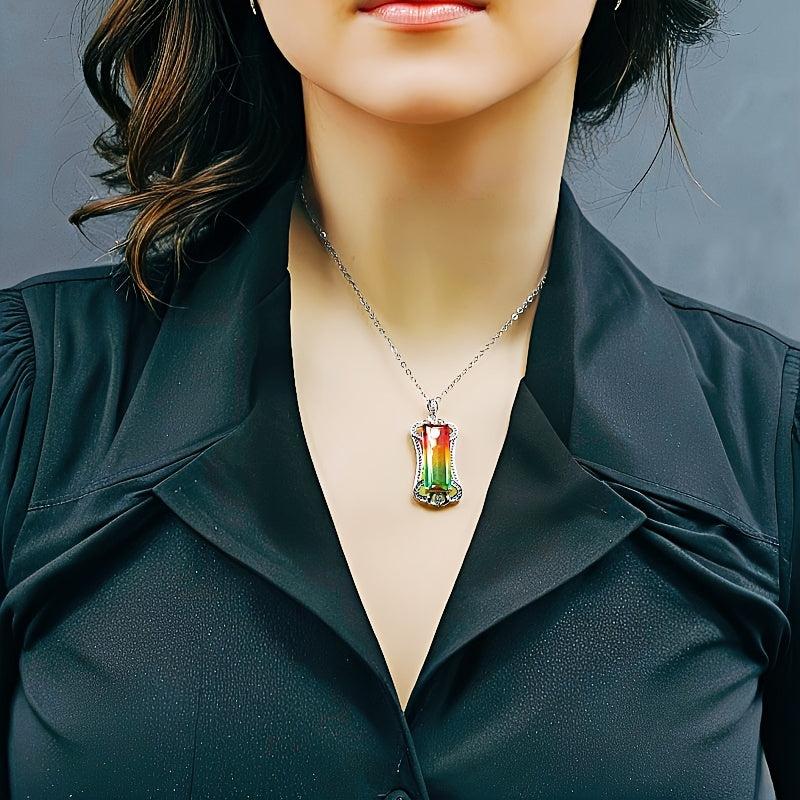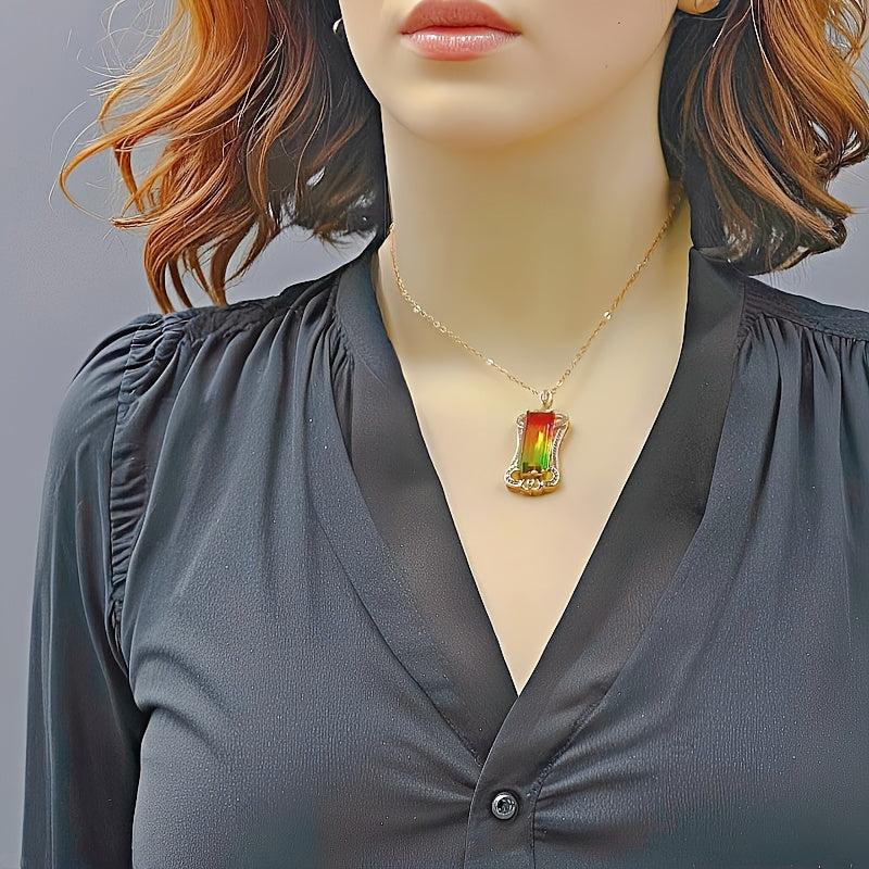 Add a pop of color to your outfit with this minimalist rainbow glass pendant necklace. The vibrant gradient colors are eye-catching and versatile for daily wear or as a thoughtful gift idea. The necklace features a delicate chain with a golden-plated finish.