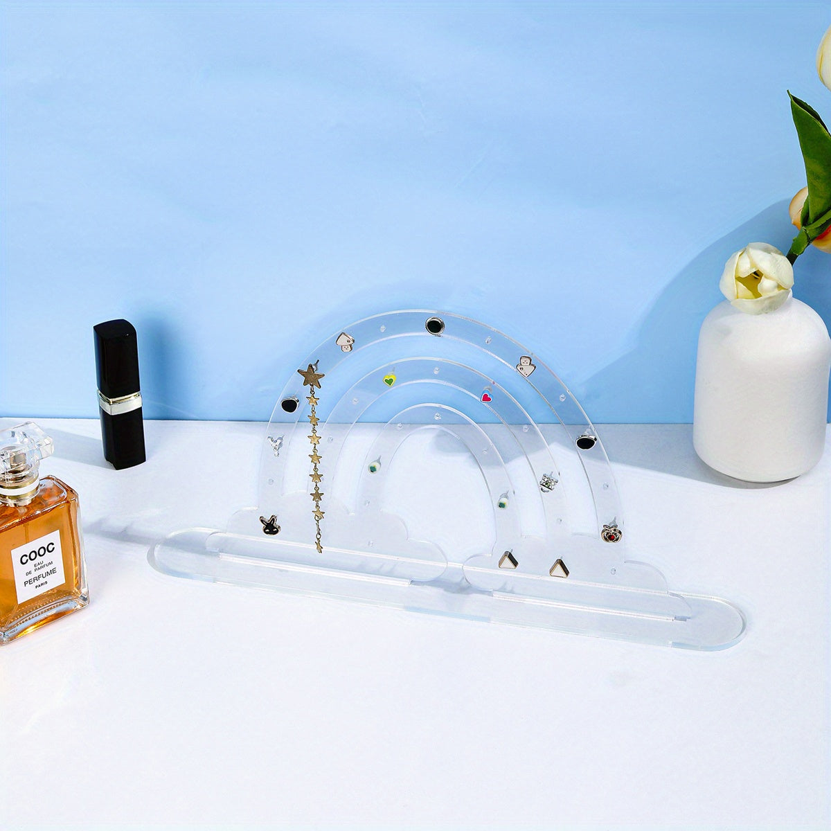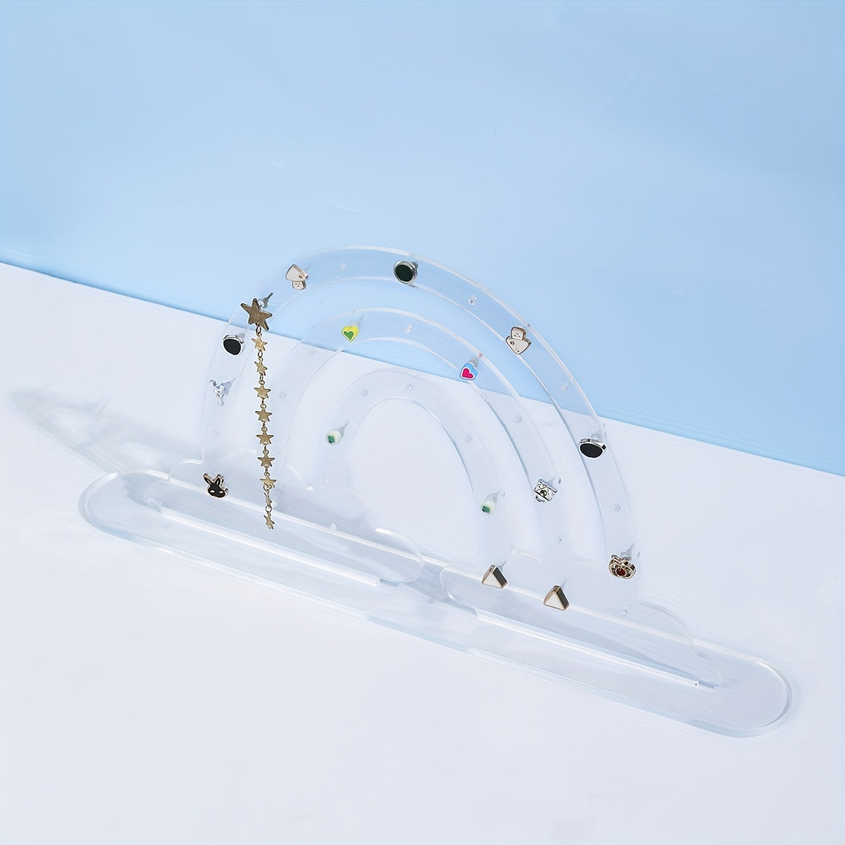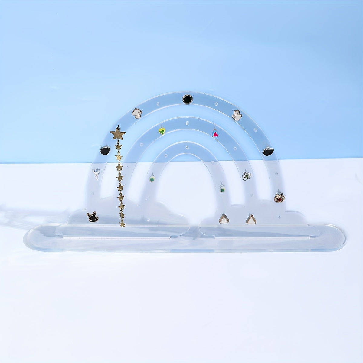 Colorful rainbow-shaped acrylic earrings display board with base for showcasing ear studs and organizing jewelry.
