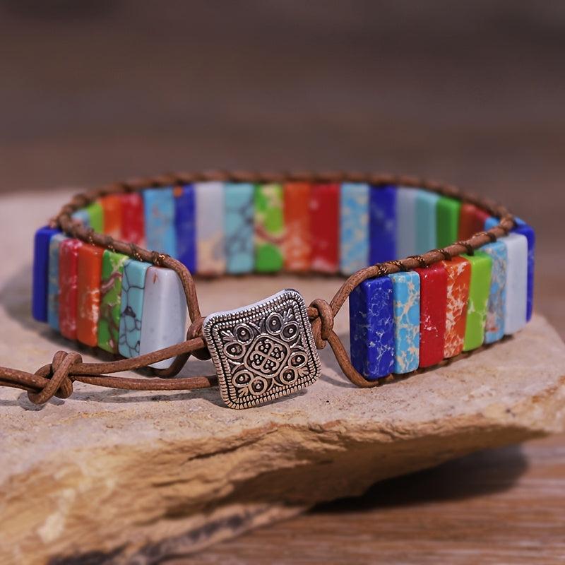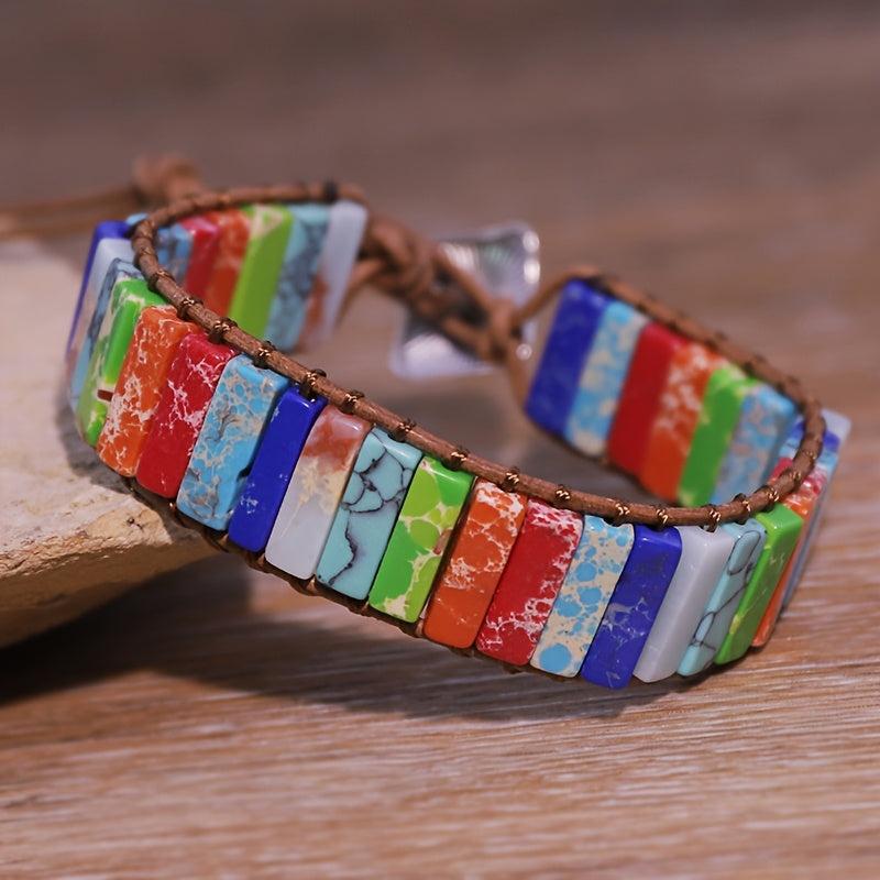 This hand-woven bracelet features seven colors of rainbow square beads, perfect for adding a boho touch to your vacation outfits. Makes a great gift too!