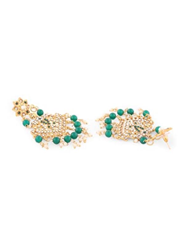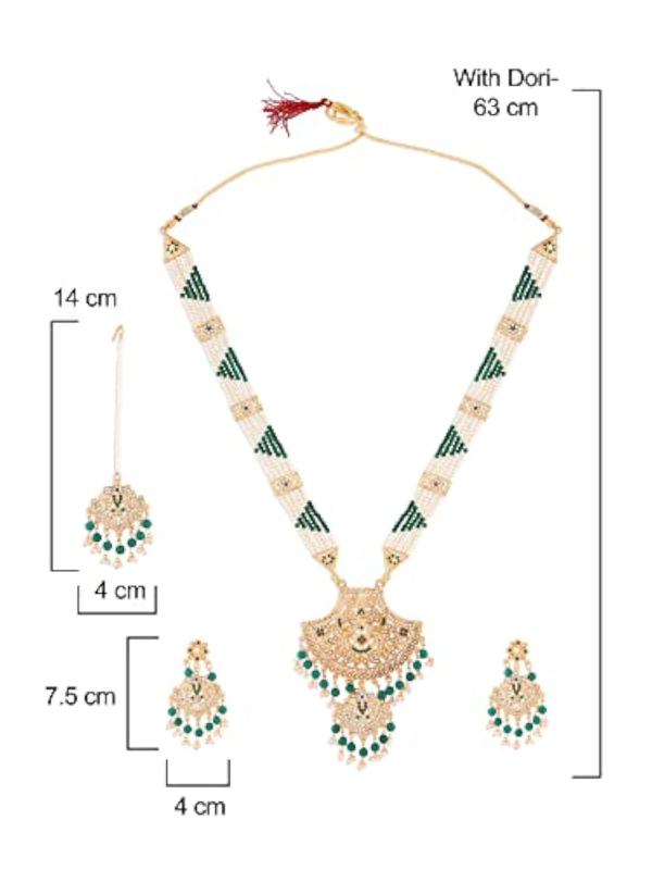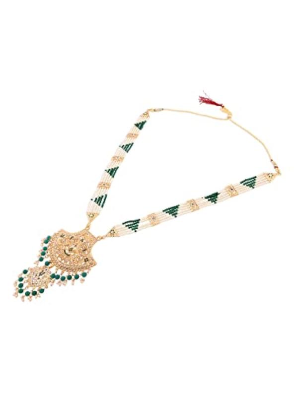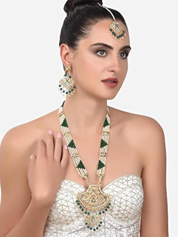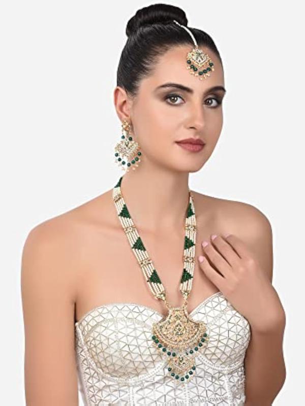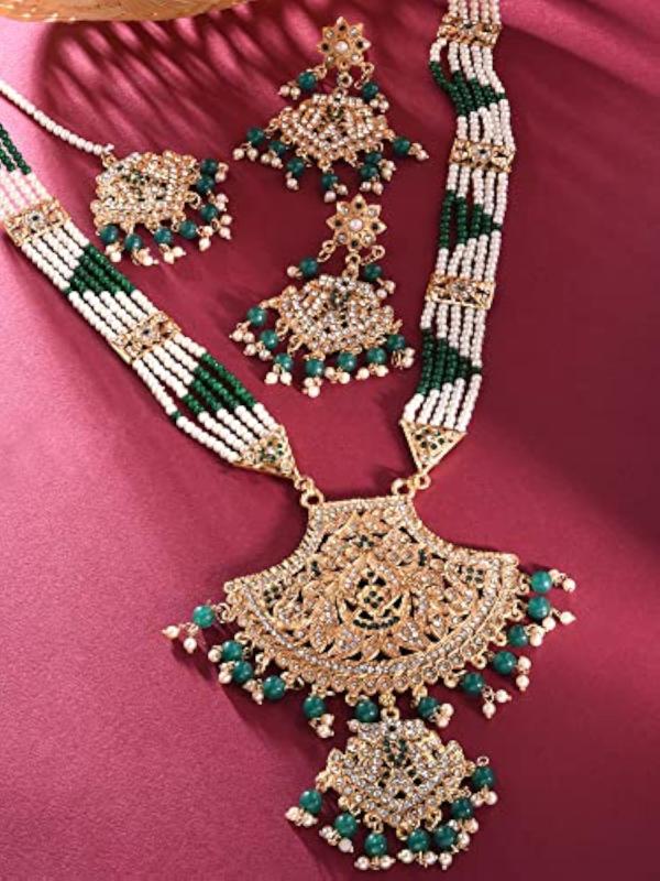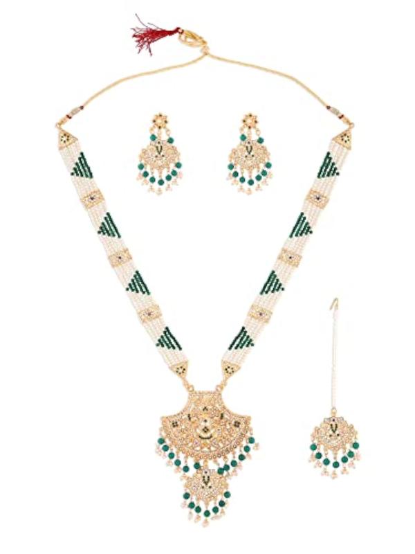 Enhance your ethnic look with this stunning Rajasthani style necklace, earring, and maangtikka set. Handcrafted with beads, this set adds dazzle to your outfit.