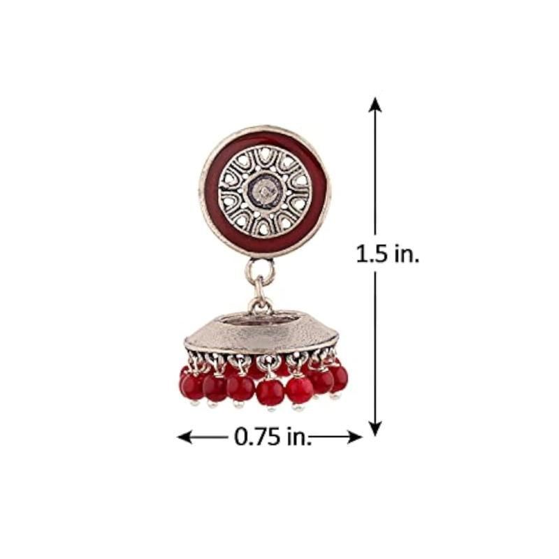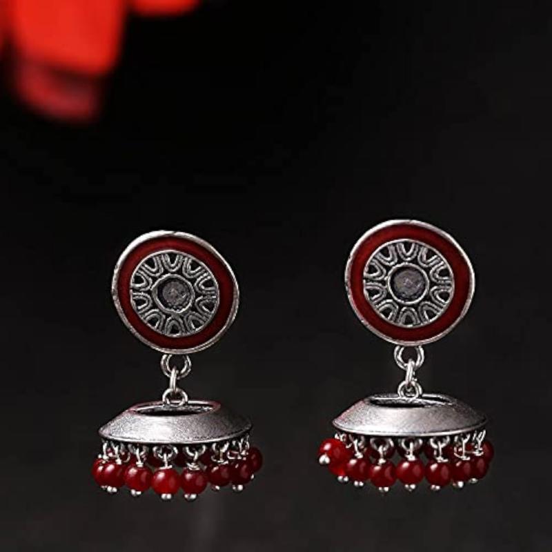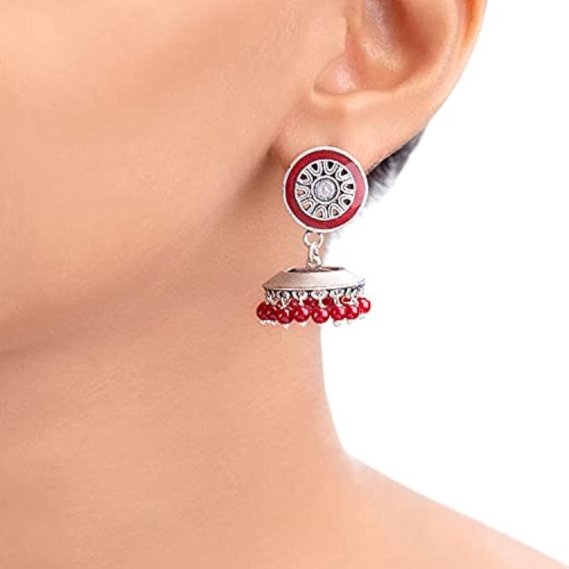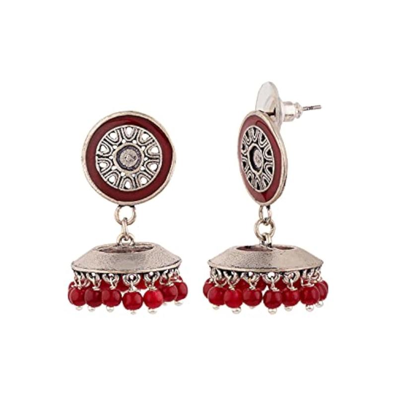 Elegant maroon drop earrings with intricate embellishments, perfect for various occasions.