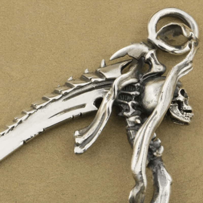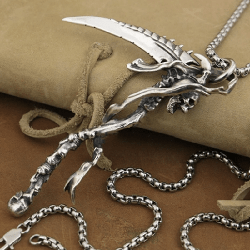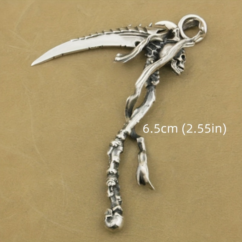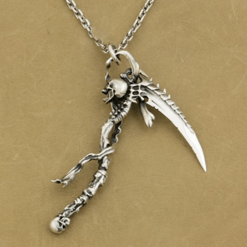Embrace the edgy look with this high-zinc alloy reaper skull sickle pendant necklace designed for motorcycle enthusiasts and rock punk fans.