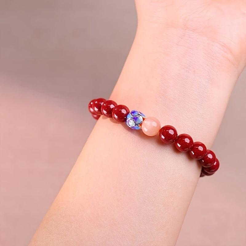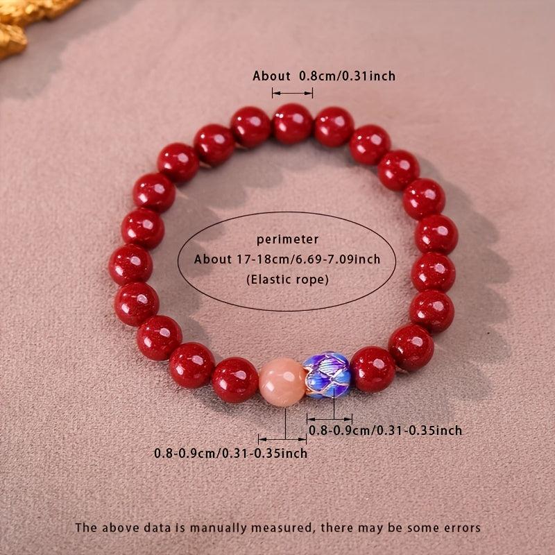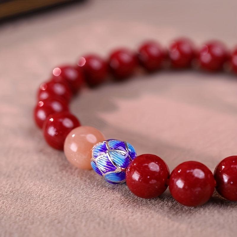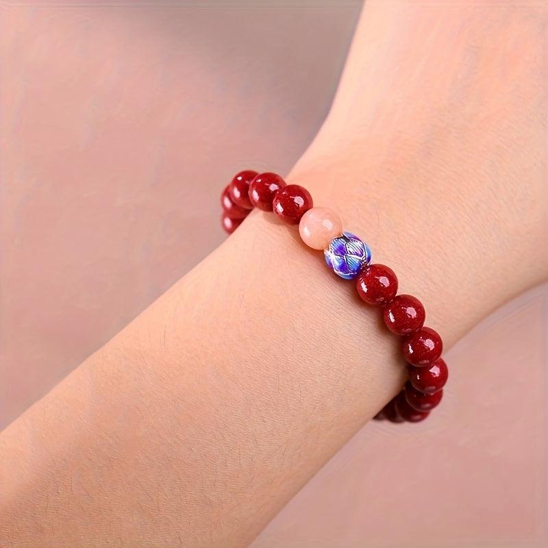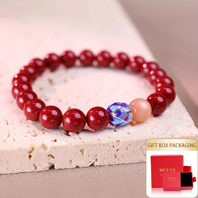 Add a pop of color to your outfit with this red cinnabar bracelet. The elastic cord ensures a comfortable fit while the lotus design adds a touch of elegance.
