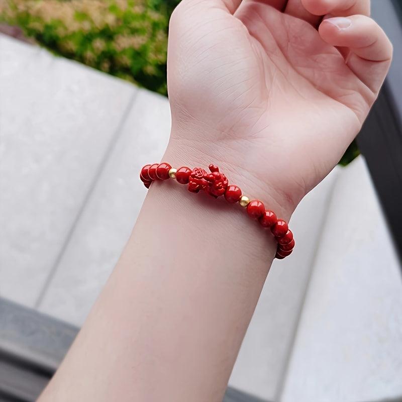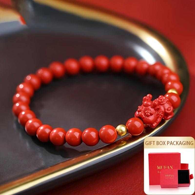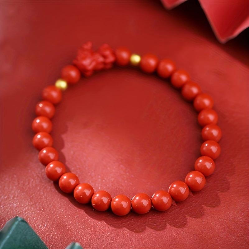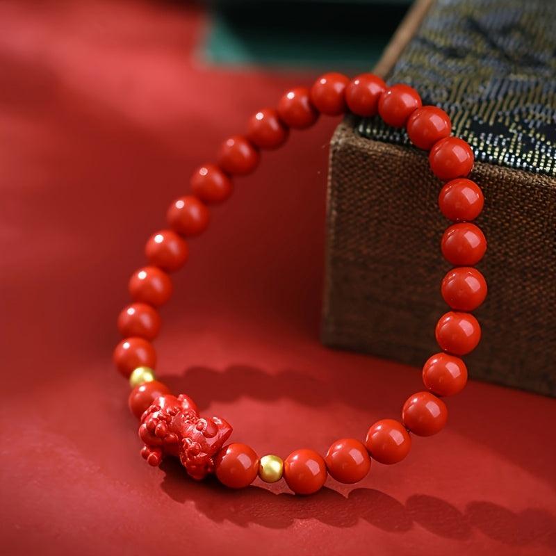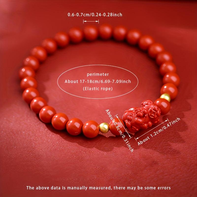 This stylish bracelet features 6-7mm high-quality cinnabar beads on an elastic cord with a Pixiu charm, perfect for women.