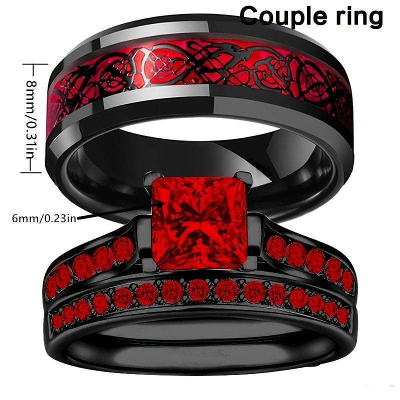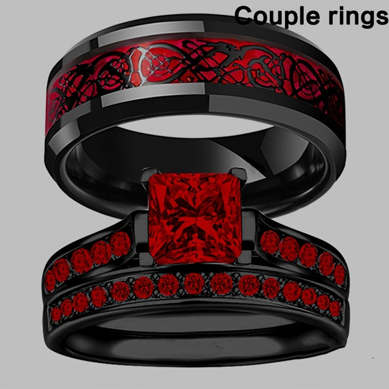 These stylish wedding rings feature red square zircons and a Celtic design. Made of stainless steel with red carbon fiber accents, perfect for couples.