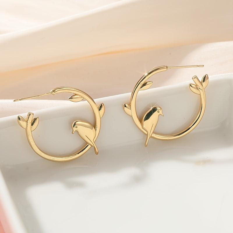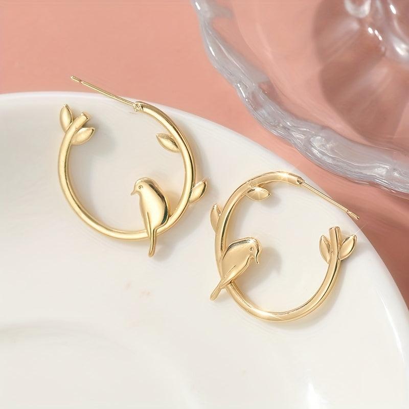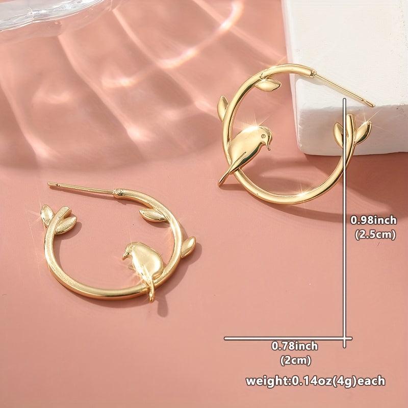Retro Bird Hoop Earrings Golden Tone Leaf Accents Daily Wear Holiday Gift