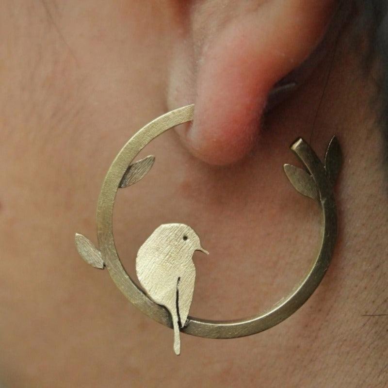 Vintage-inspired hoop earrings featuring bird design with leaf accents. Ideal for daily wear or special occasions. Perfect holiday gift for any occasion. These everyday earrings add a touch of retro charm to your outfit.