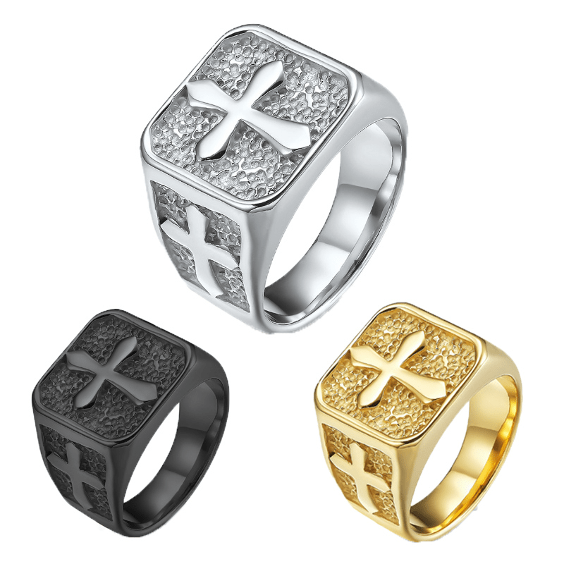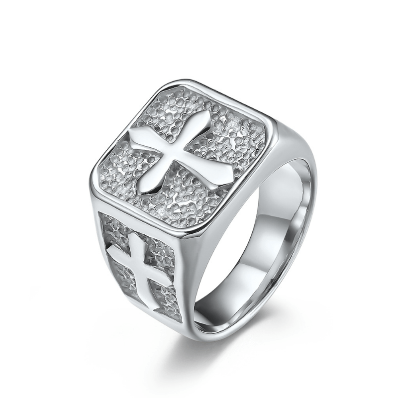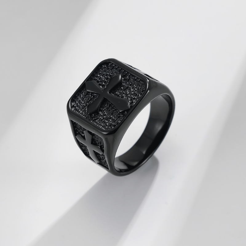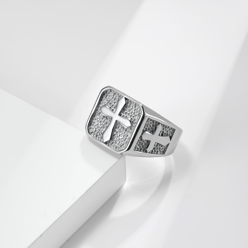 This retro alloy ring features a cross carved design, made from titanium steel. Perfect for parties or as a gift.