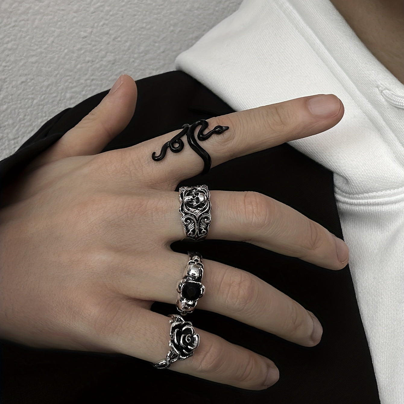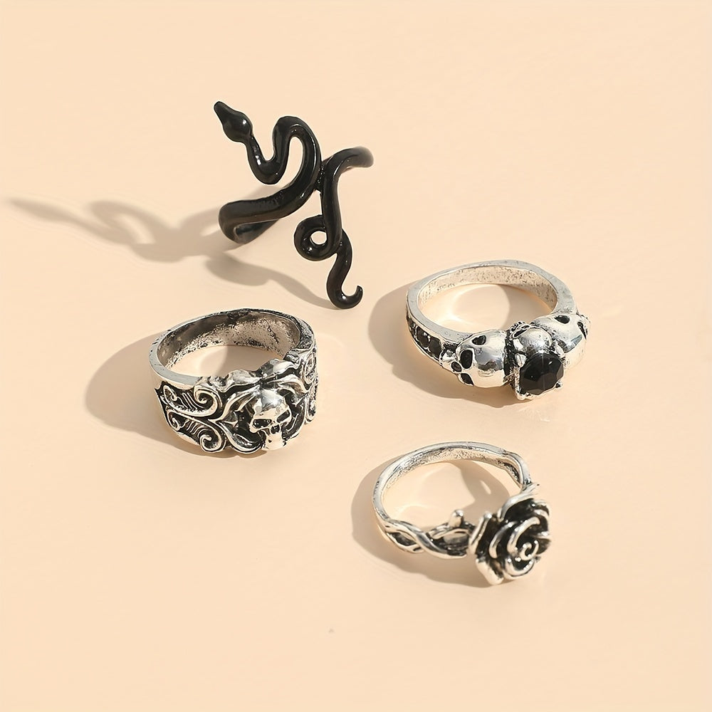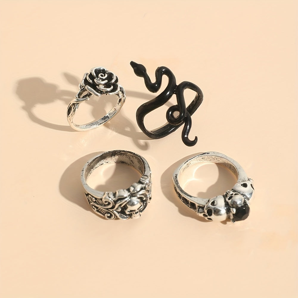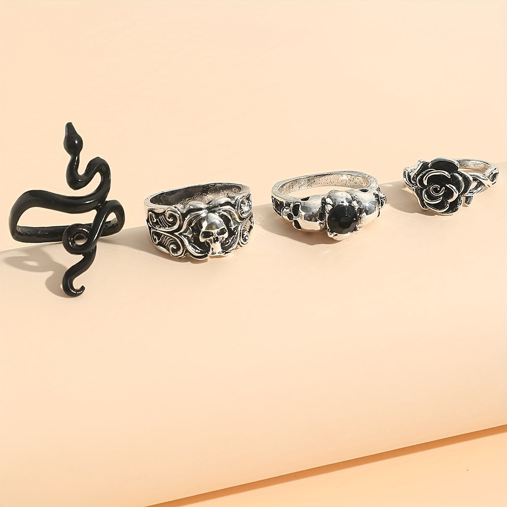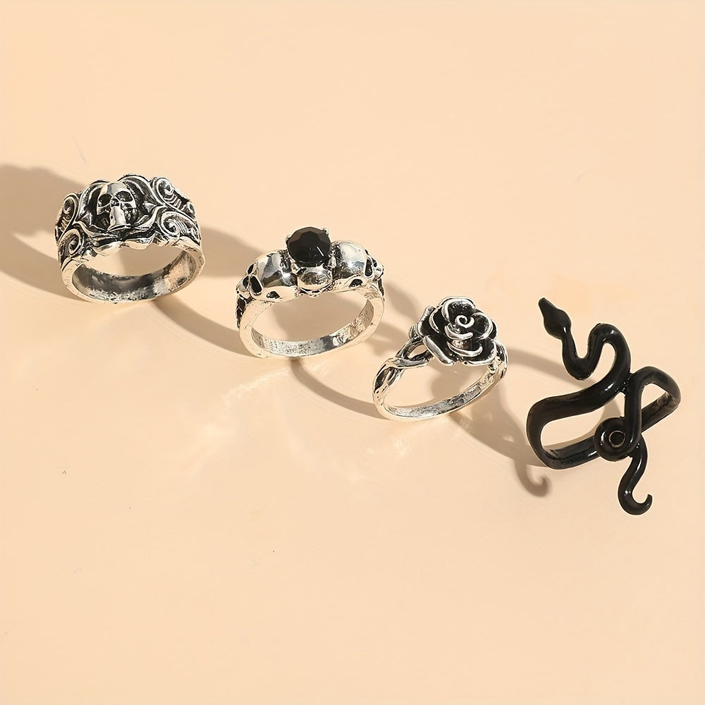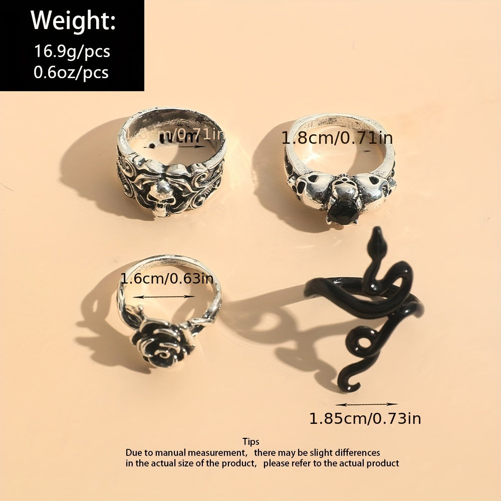 Embrace a vintage look with this 4-piece set of dark snake skull faux gem rings designed for men. These rings add a touch of mystique and style to your outfit.