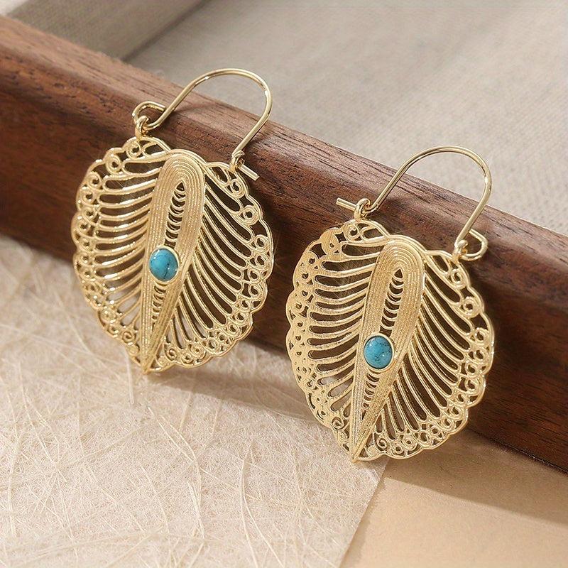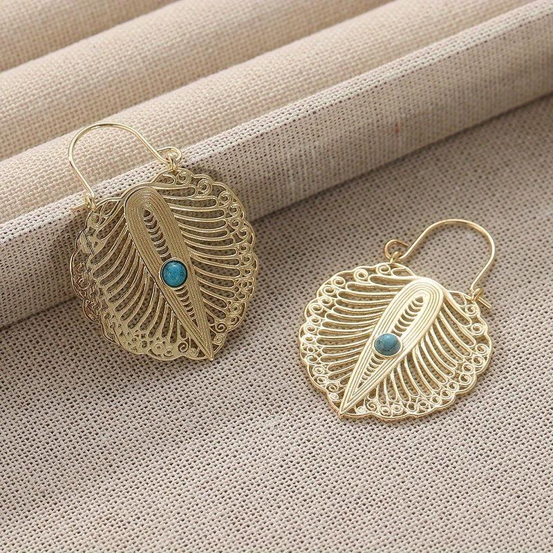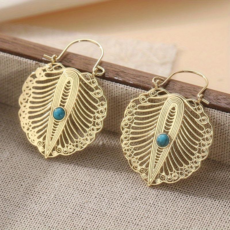 Add a touch of vintage charm to your look with these retro-inspired hoop earrings featuring golden leaf design and turquoise accents. These earrings are perfect for adding a pop of color and style to any outfit.