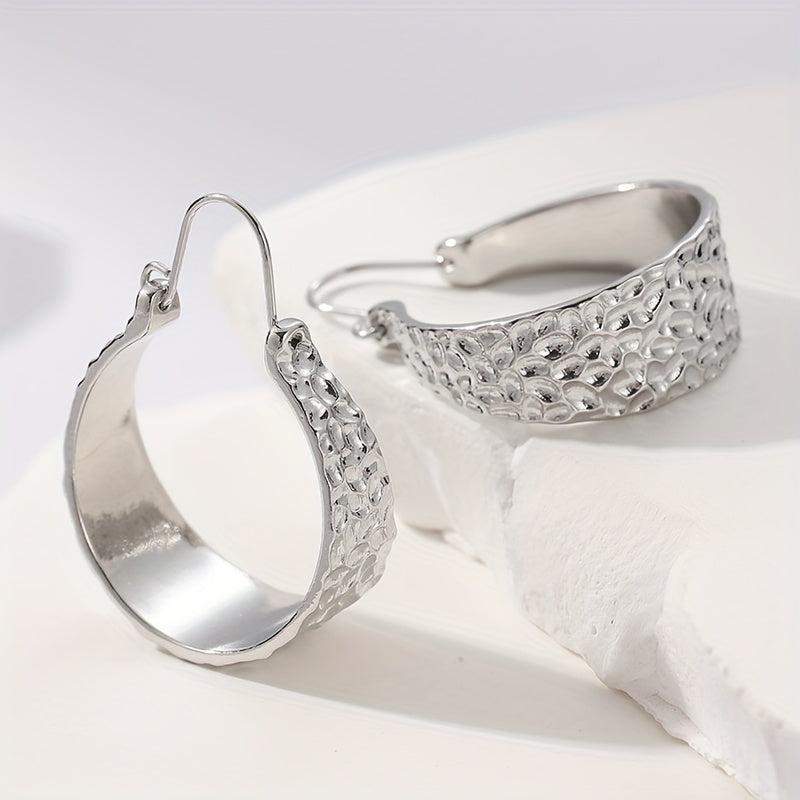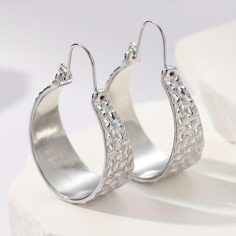 Add a touch of vintage charm to your look with these stylish hoop earrings. Perfect for daily wear or party occasions, these silvery earrings feature a unique hammer pattern design.