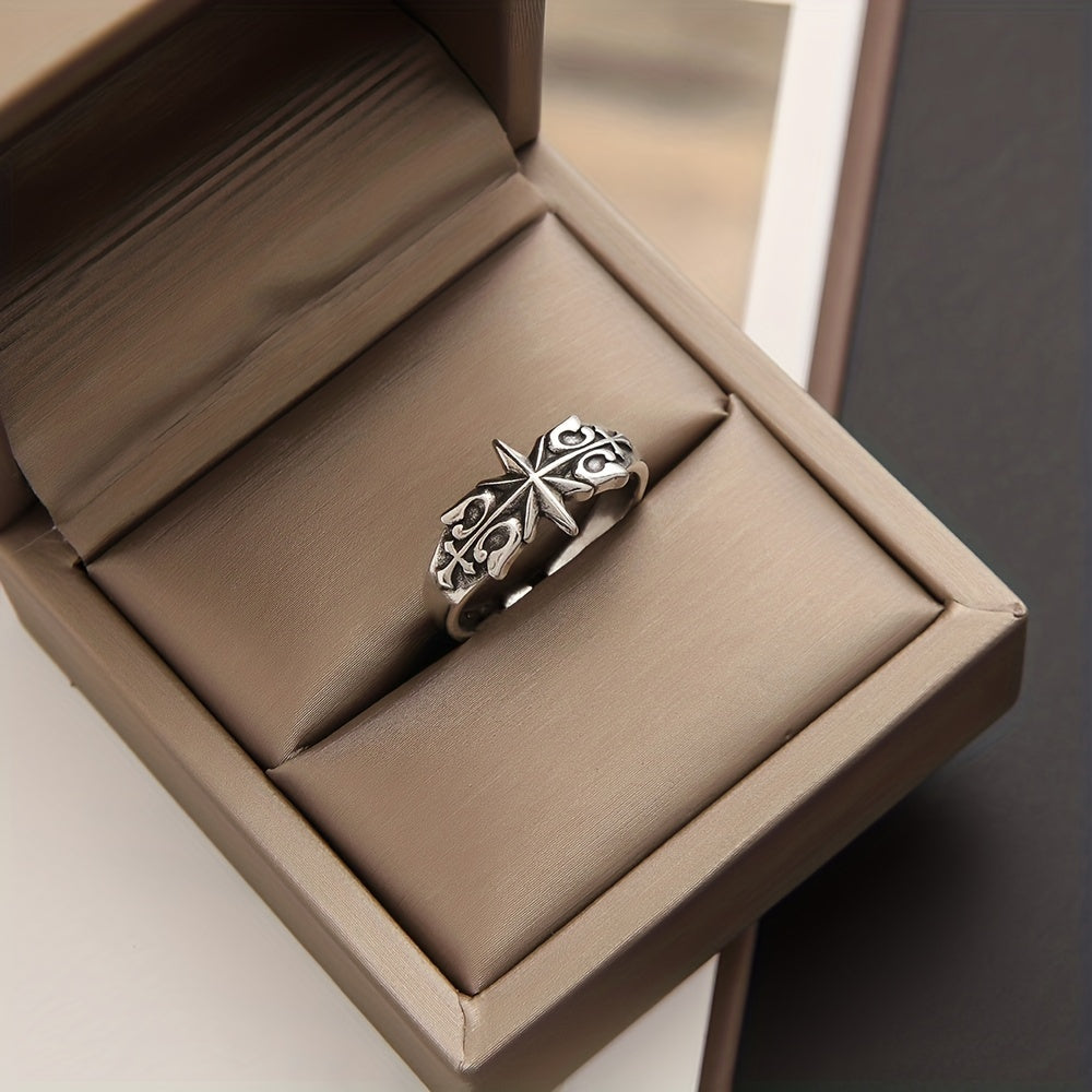 This retro hexagram ring is a niche jewelry piece for men. It features an ancient silvery design and is adjustable to fit various sizes.