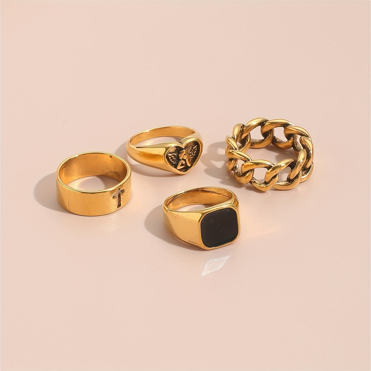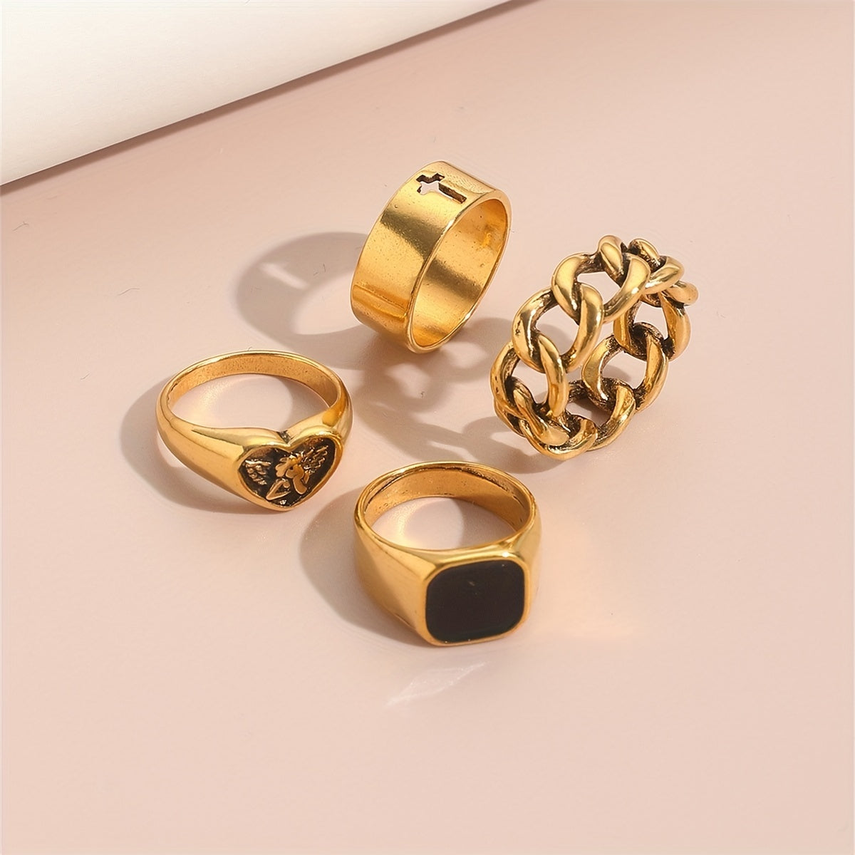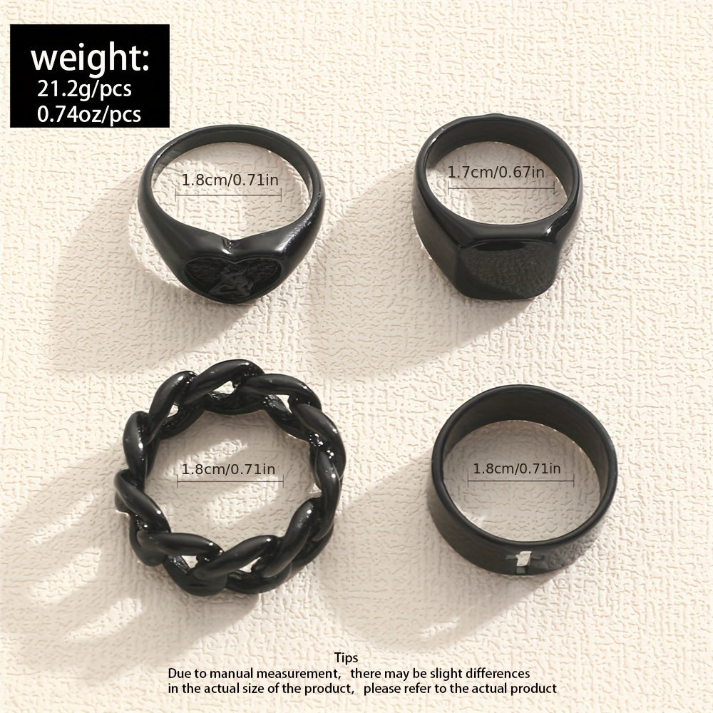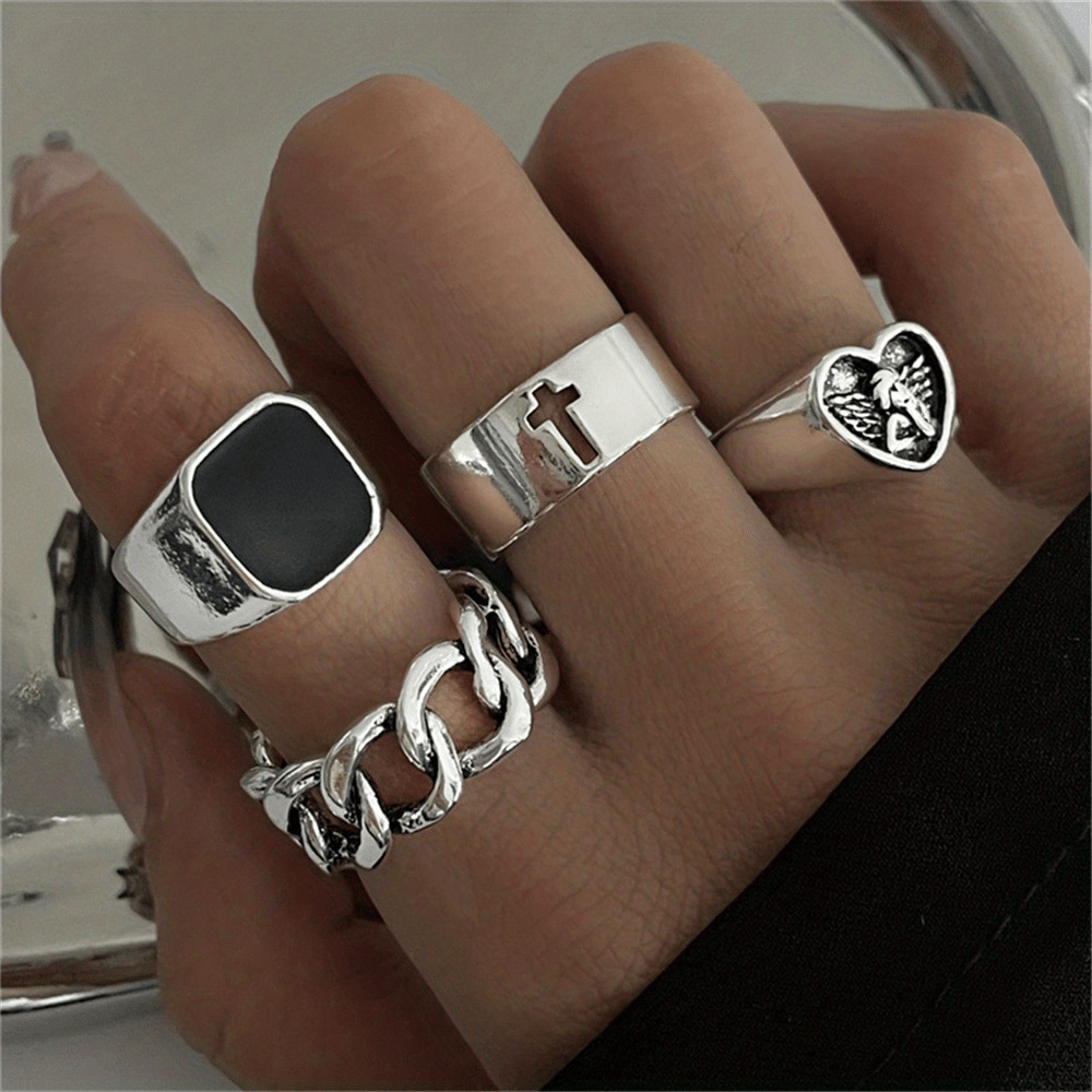 This 4-piece ring set features a retro hip hop punk style with hollow cross and angel designs. Perfect for stacking and adding a unique touch to your outfit.