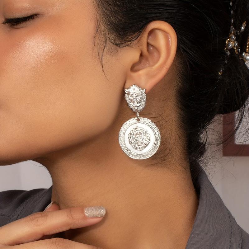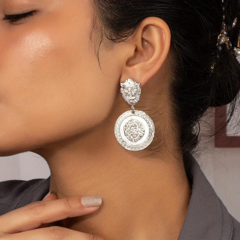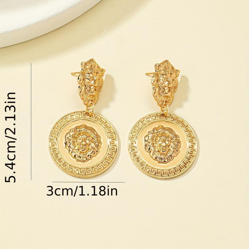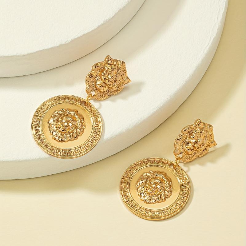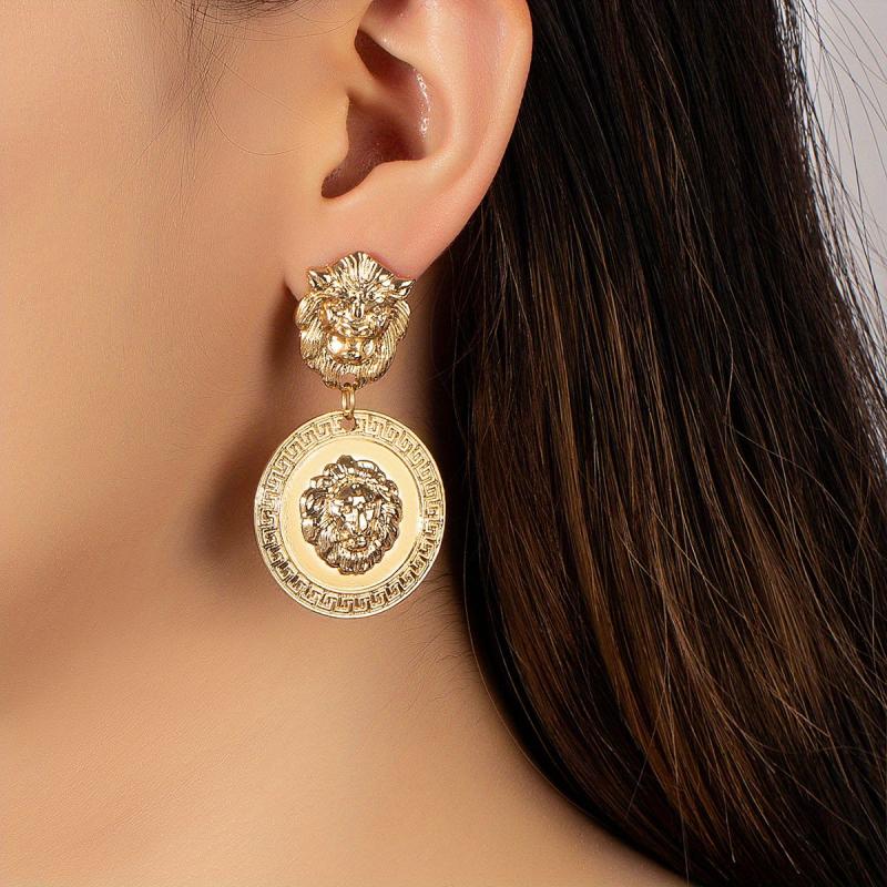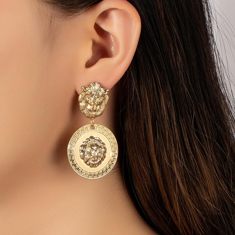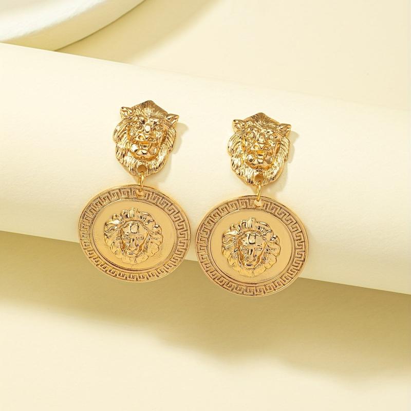 Embrace vintage charm with these lion head earrings accented by intricate geometric shapes in radiant gold.