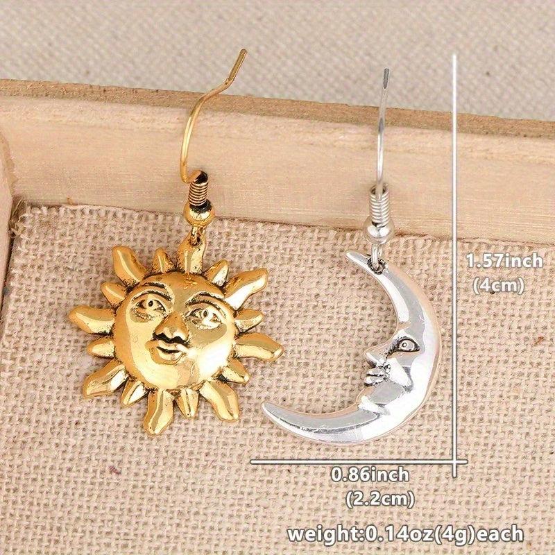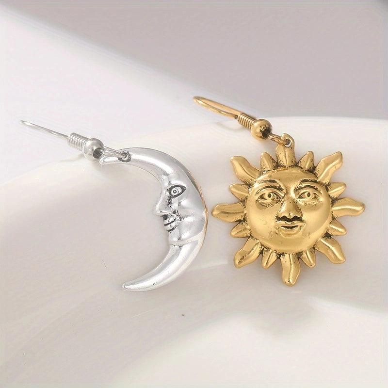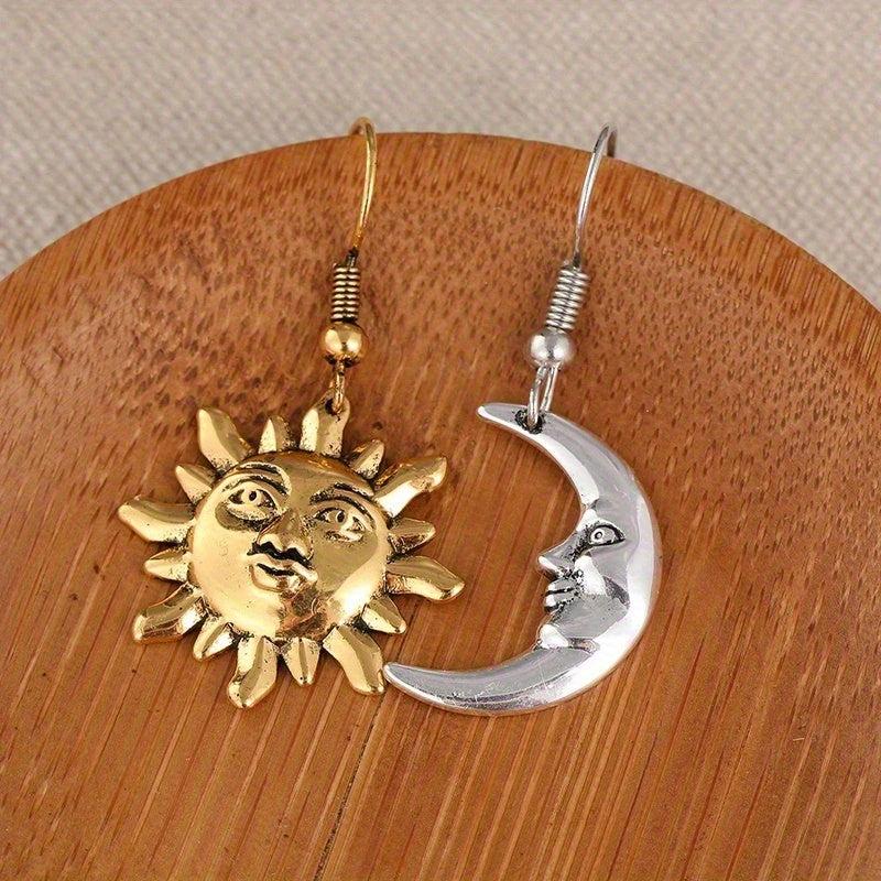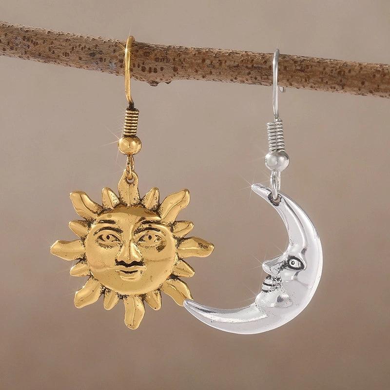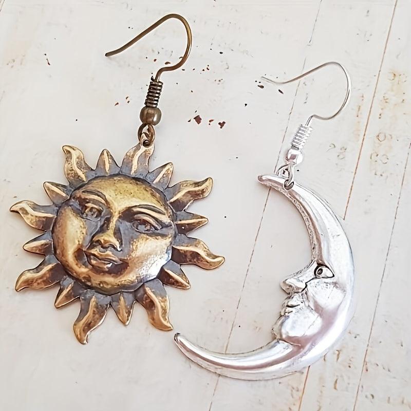 Handcrafted vintage-inspired earrings featuring sun and moon design. Made of copper with glass accents. Perfect for gift giving and special occasions.