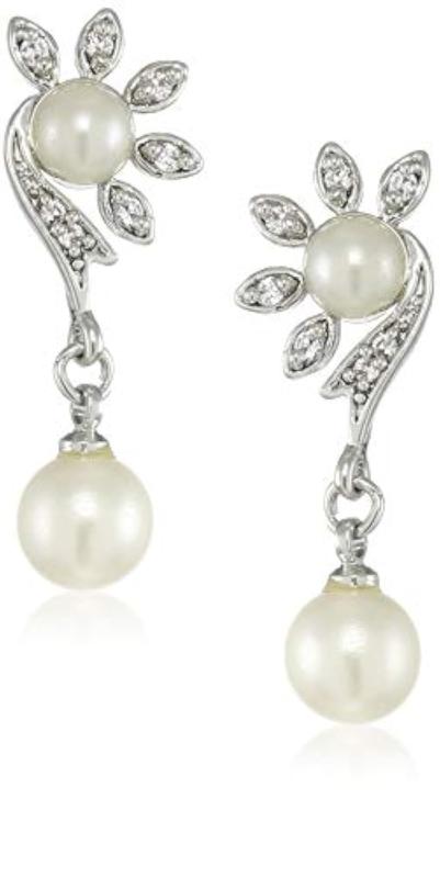 Elegant and glamorous flower drop earrings featuring American diamond accents and a lustrous pearl.